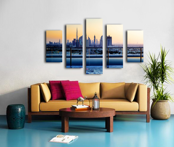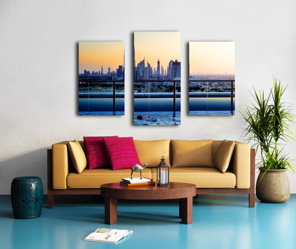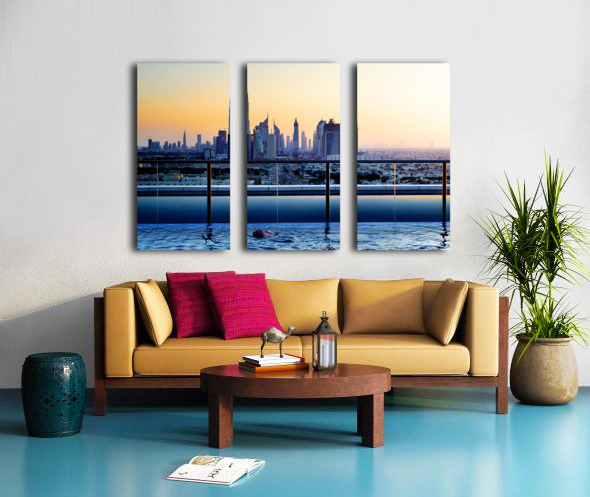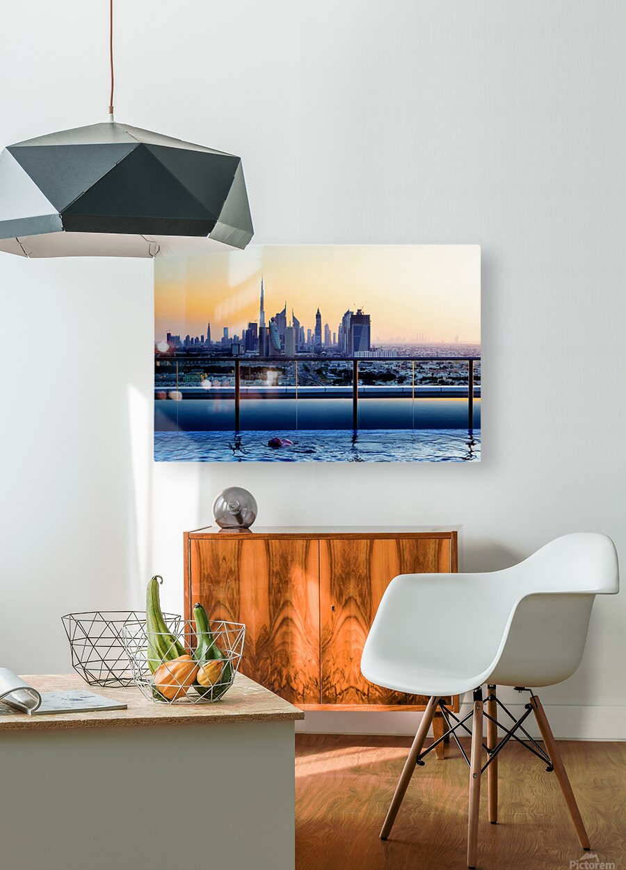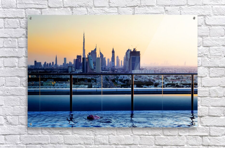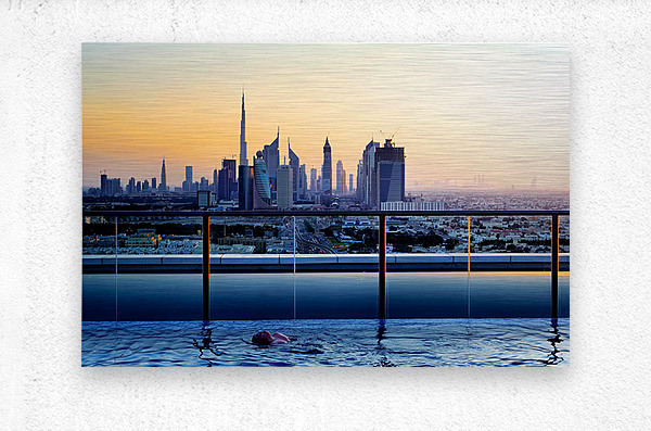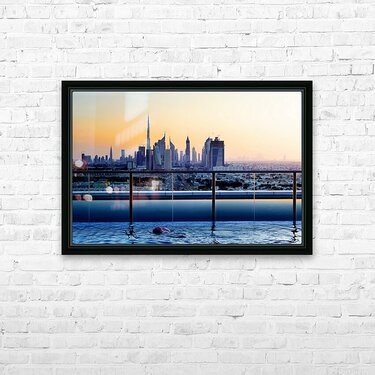 Get this artwork "Swimming in infinity pool overlooking Dubai skyline at sunset" in a framed print.
