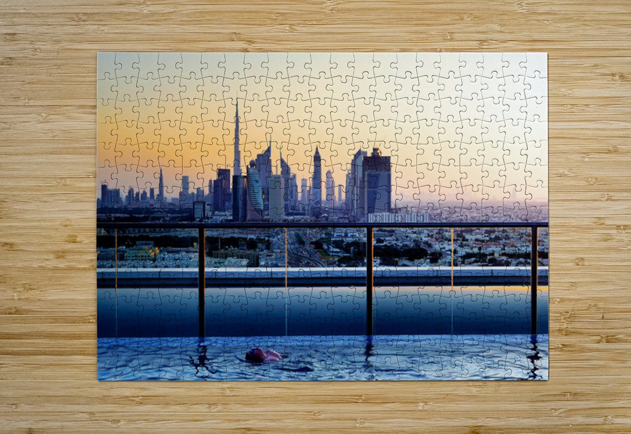 Swimming in infinity pool overlooking Dubai skyline at sunset Marco Brivio Puzzle printing