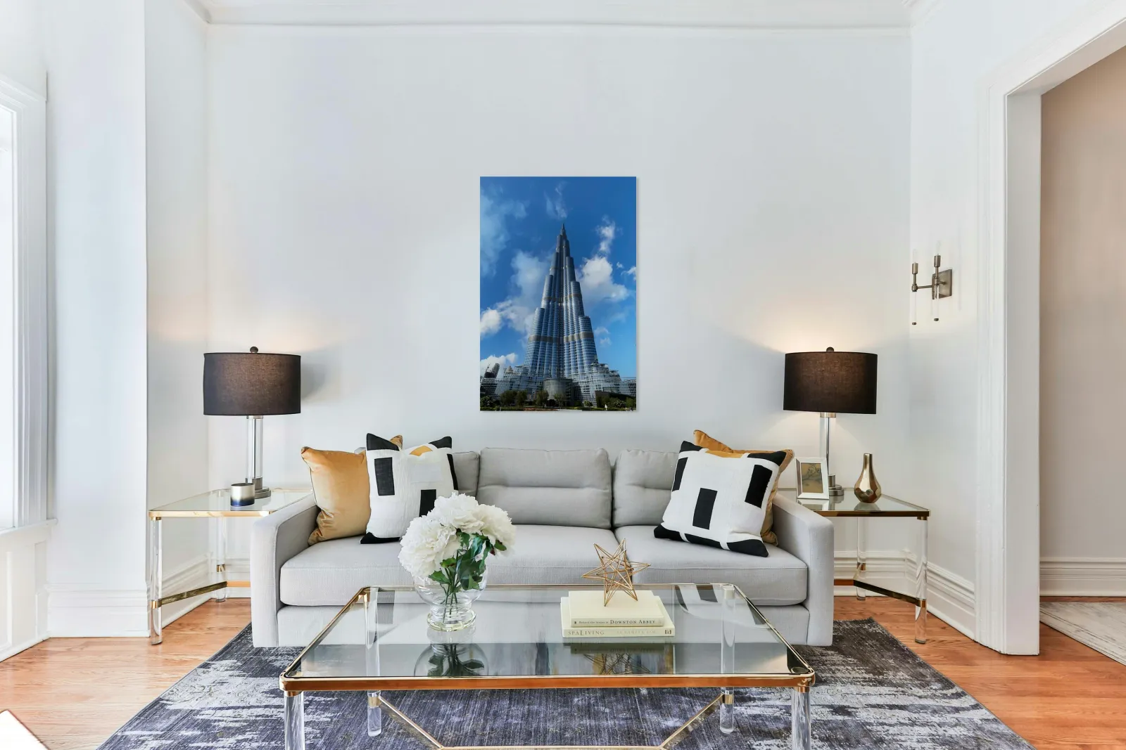 Burj Khalifa reaches high into the bright blue sky in Dubai. The tall structure is a famous landmark known around the world.
