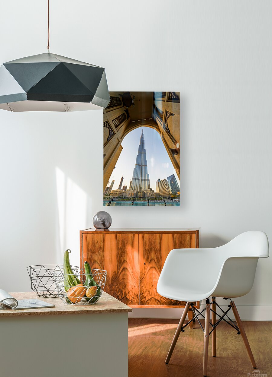 Get this artwork "Burj Khalifa seen through ornate arch in Dubai cityscape" in a framed print.