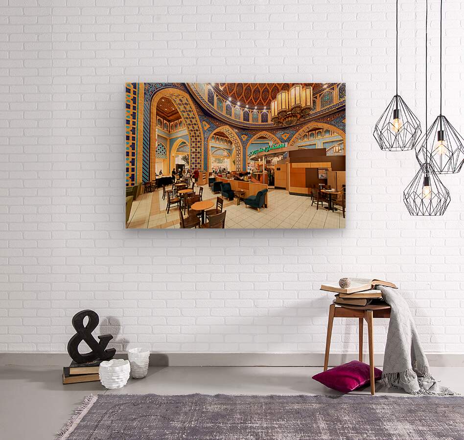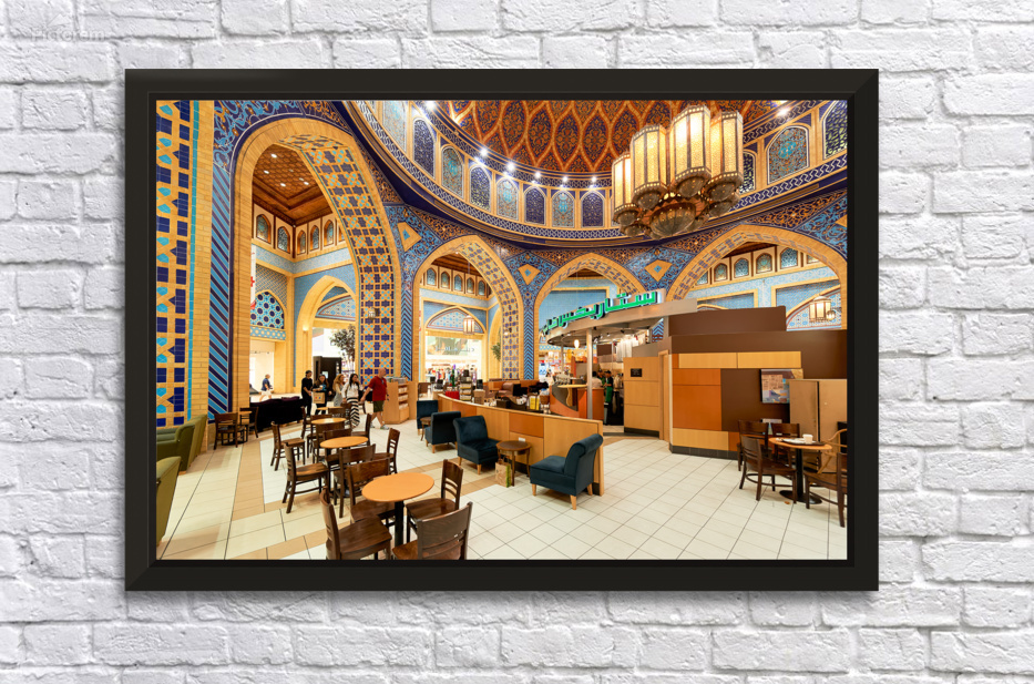 Customers enjoy drinks at a Starbucks in a lovely mall setting in Dubai UAE. Many decorative elements are present in the store.