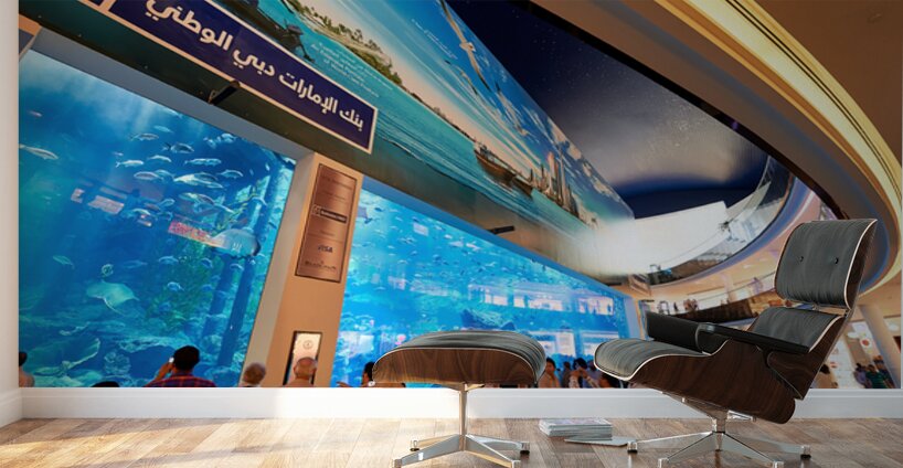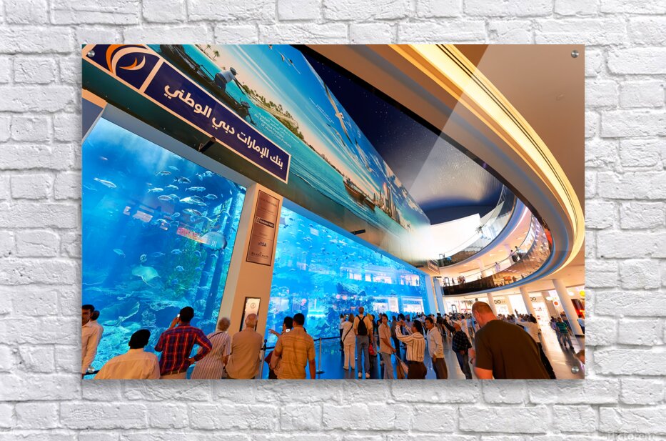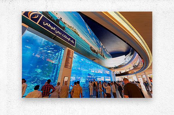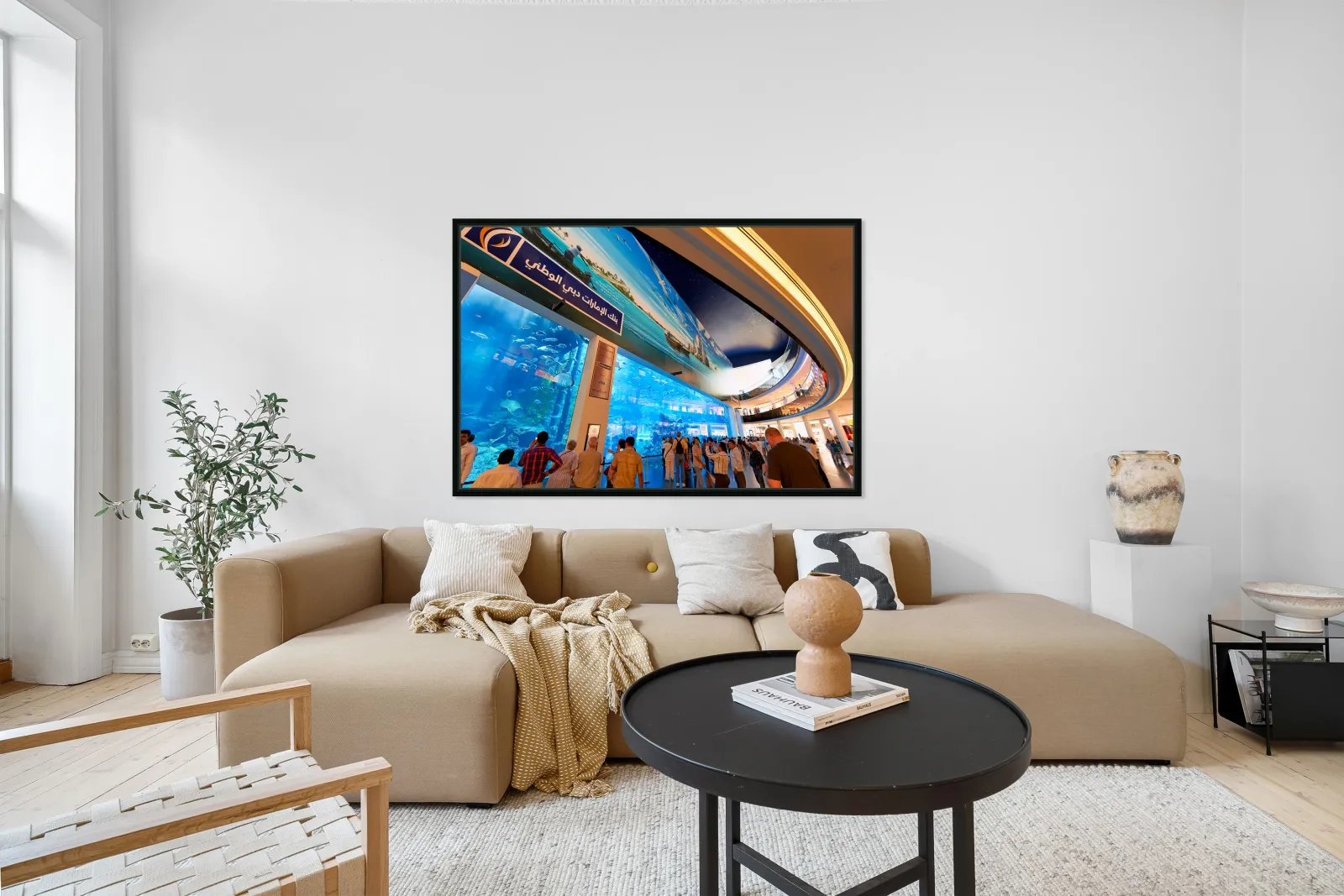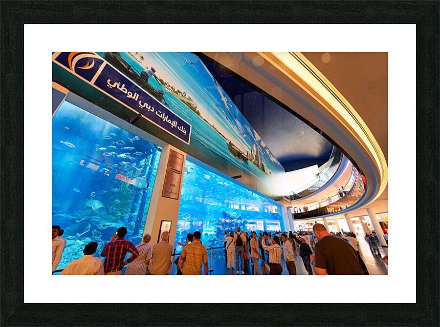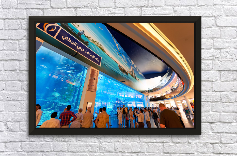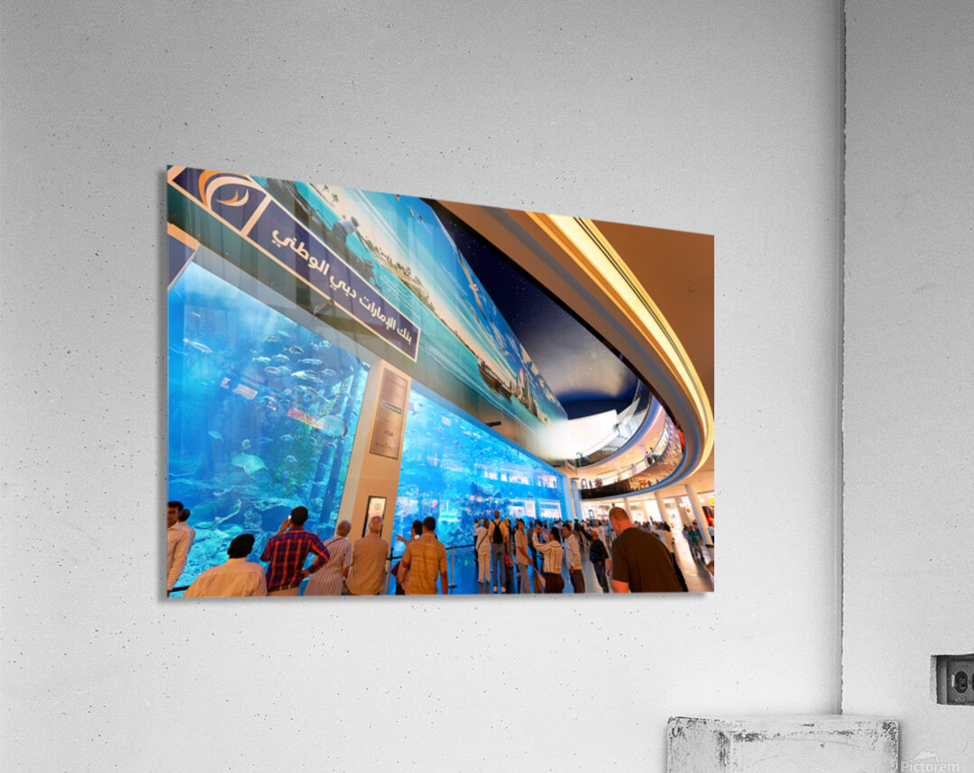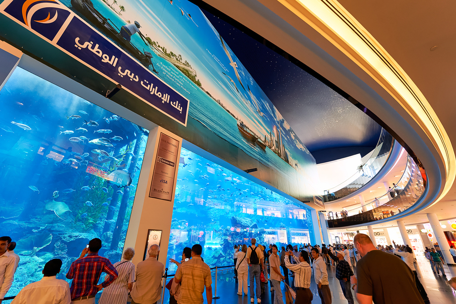 People gather to look at a large aquarium and a big screen in a mall in Dubai. The scene shows visitors watching marine life and visuals.