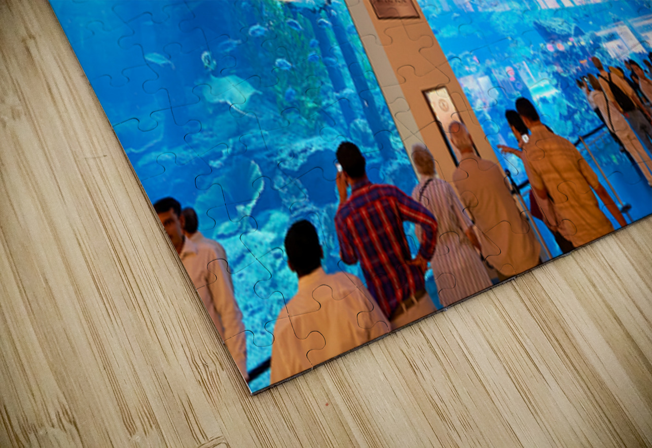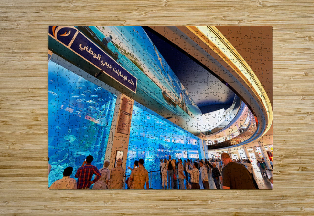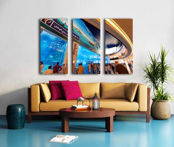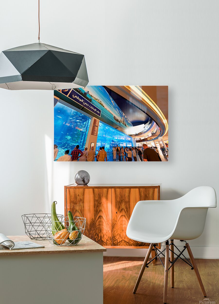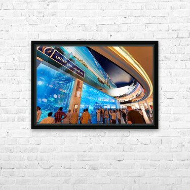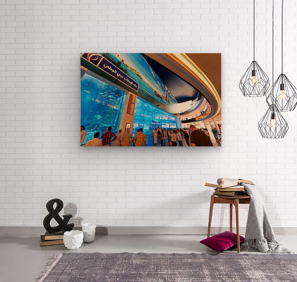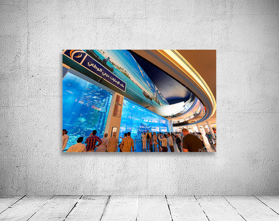People gather to look at a large aquarium and a big screen in a mall in Dubai. The scene shows visitors watching marine life and visuals.