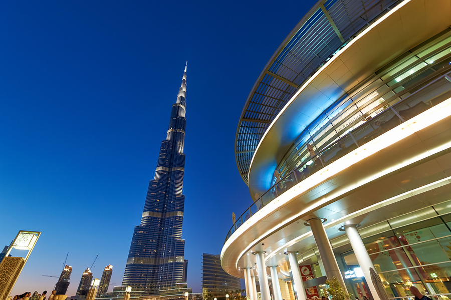 Burj Khalifa stands tall against the night sky showcasing bright lights and nearby modern structures in Dubais urban landscape.