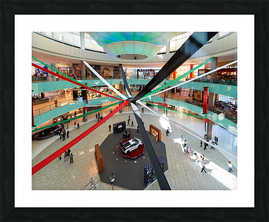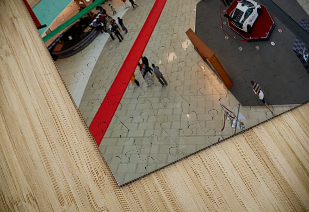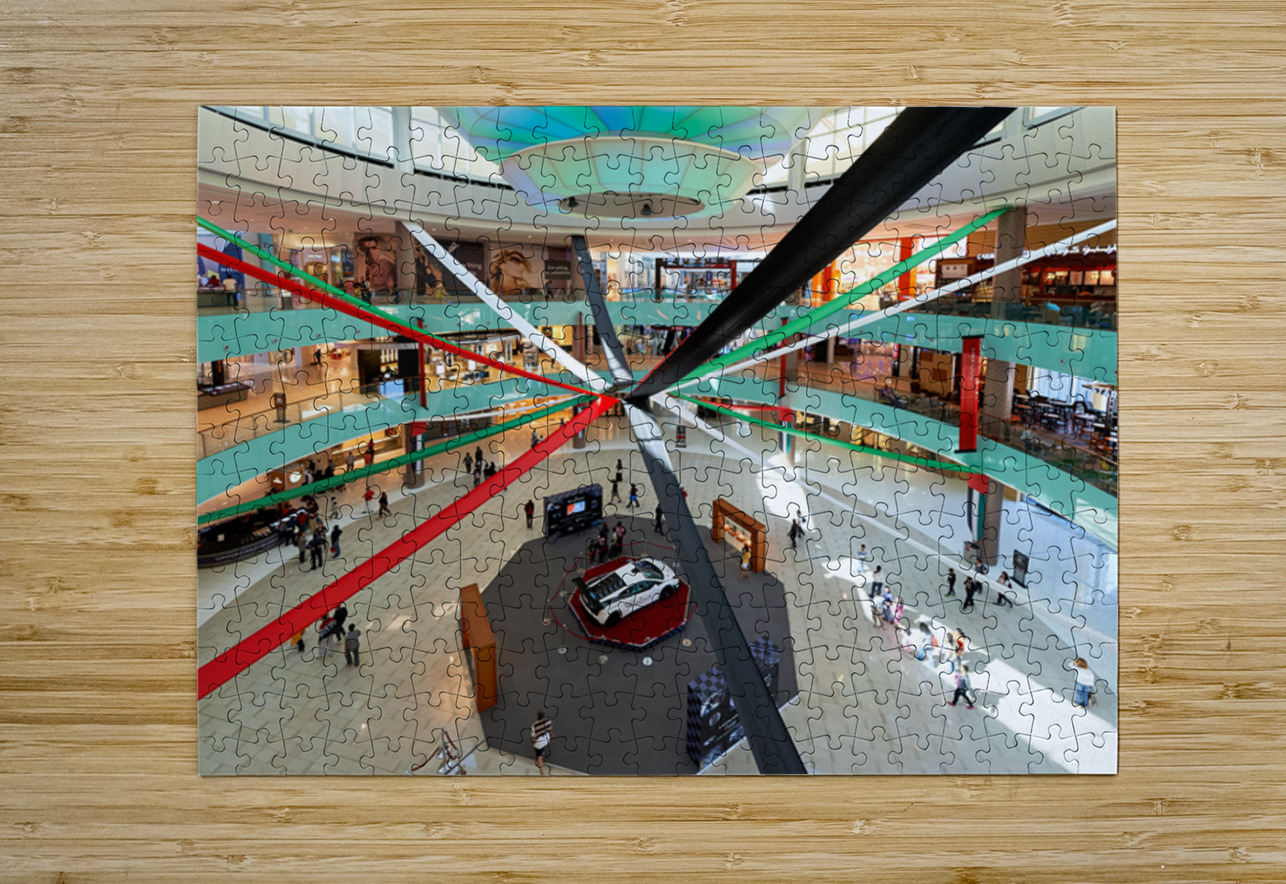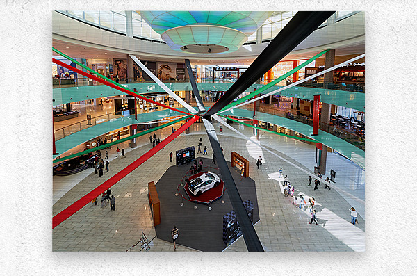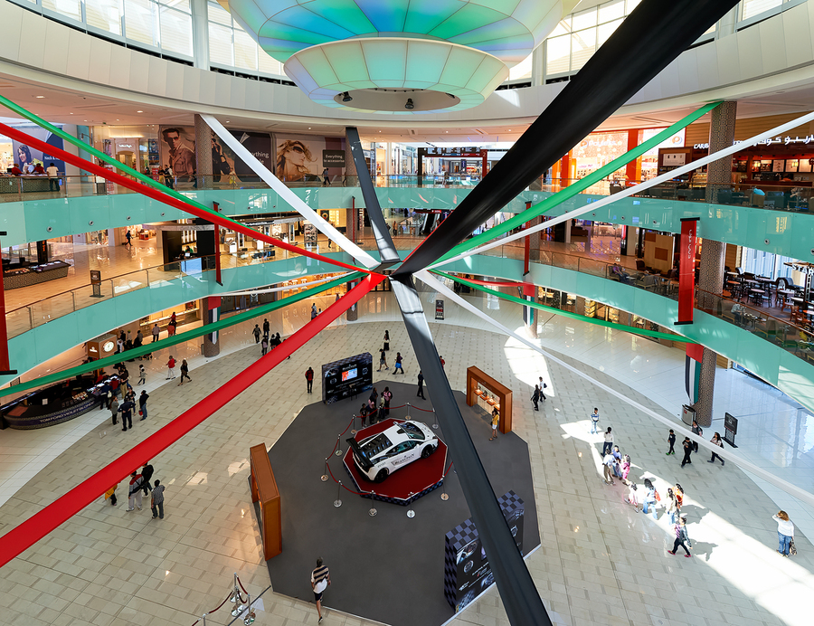 A busy mall in Dubai shows national flag ribbons and a sports car. Shoppers walk around looking at displays while enjoying the atmosphere.