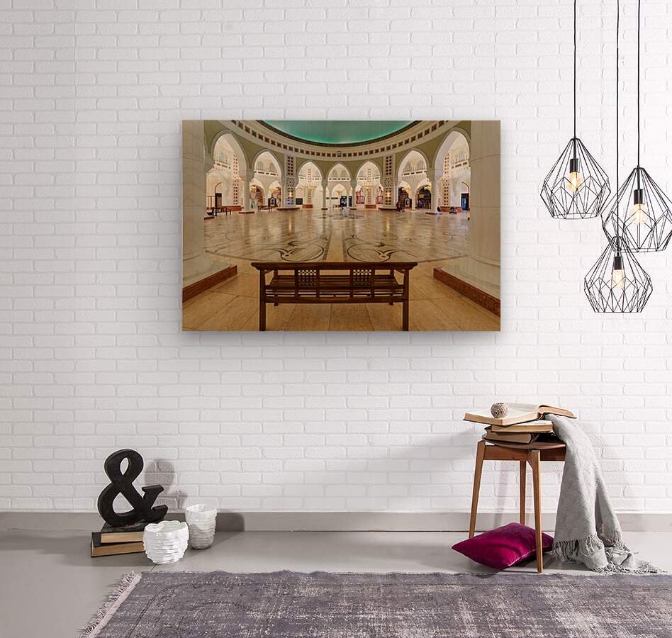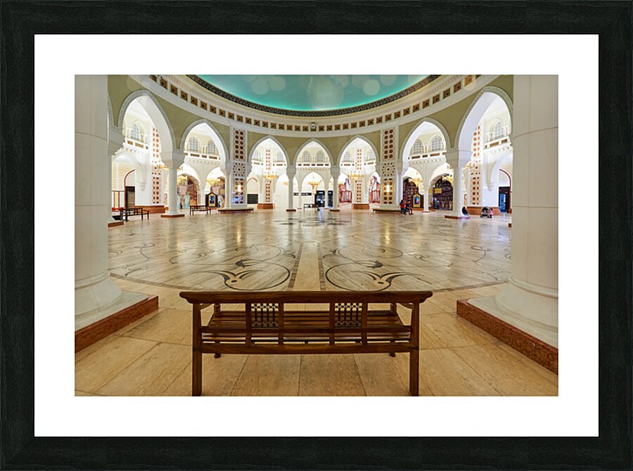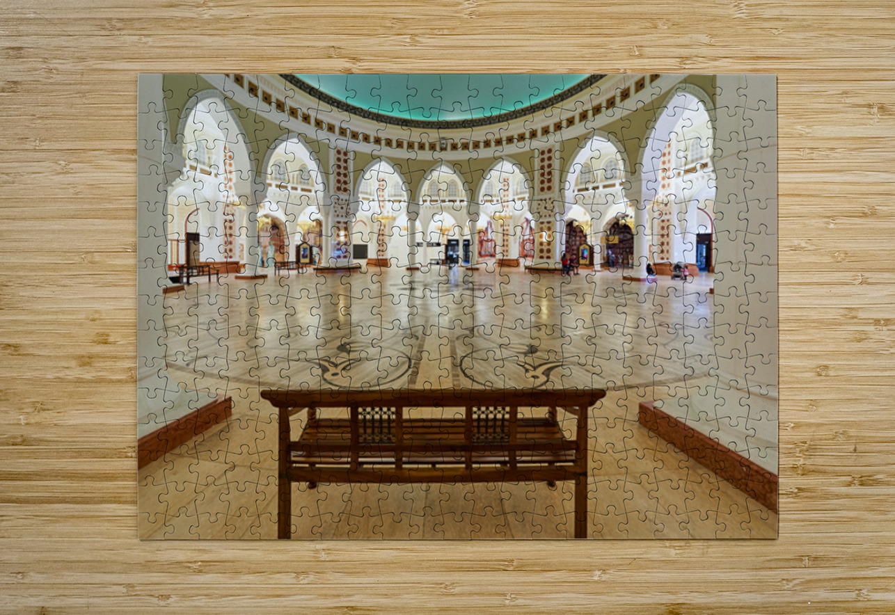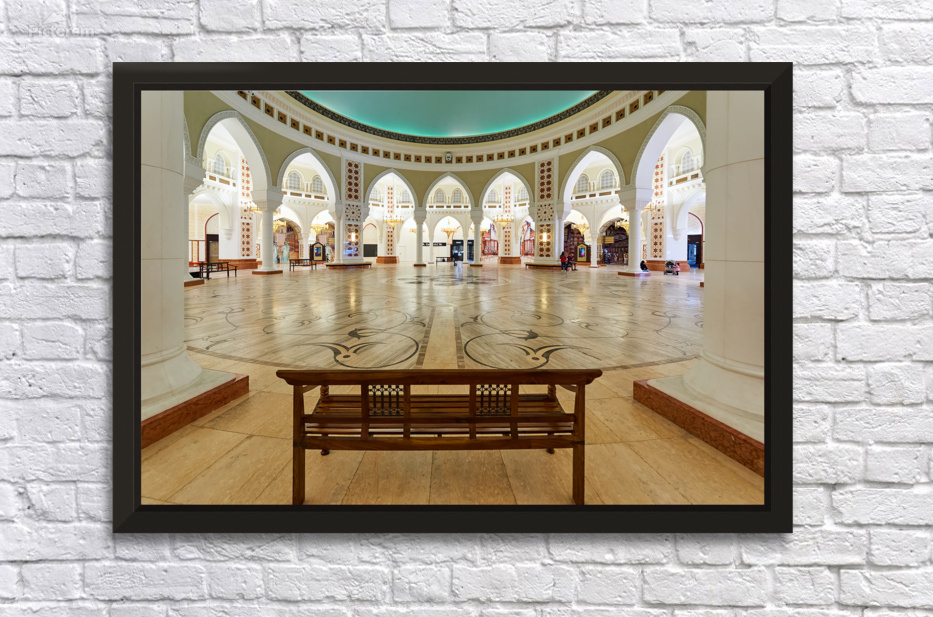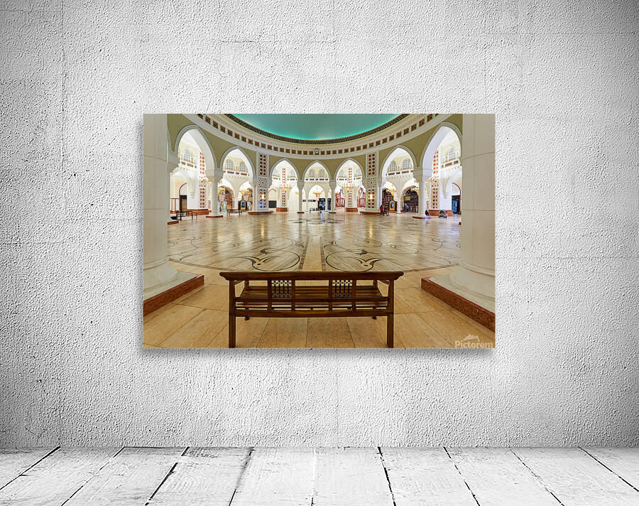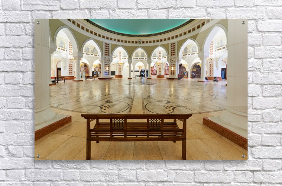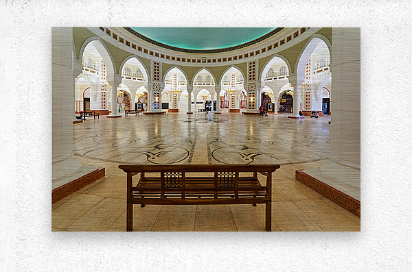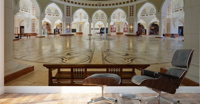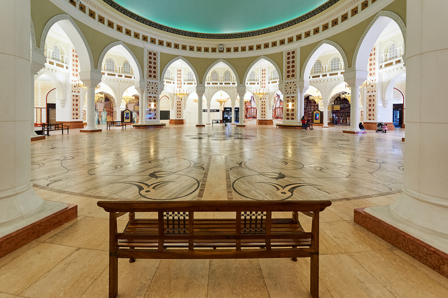 Visitors walk through a grand and ornate hall with many arches and columns in Dubai. The decorative floor adds to the beautiful view.