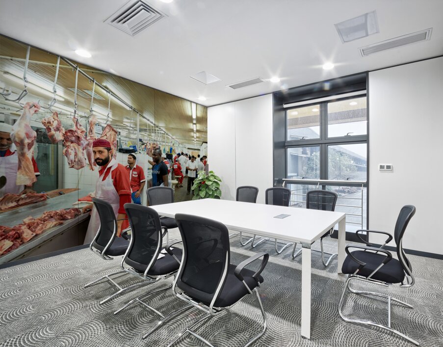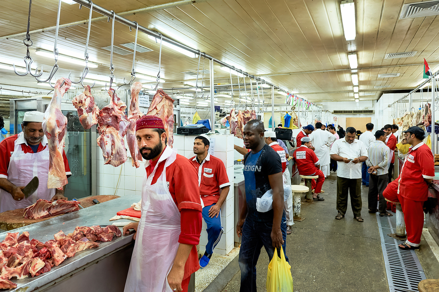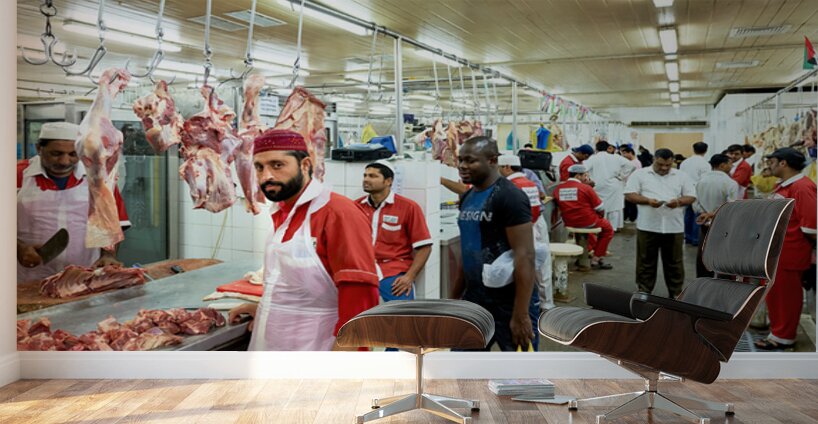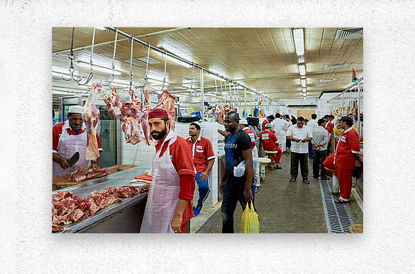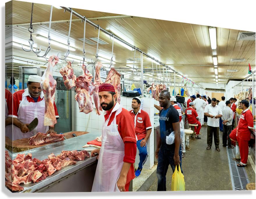 ABOUT THIS ARTWORK: BUTCHERS WORK AT A BUSY MEAT MARKET IN DUBAI UAE PREPARING FRESH
