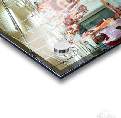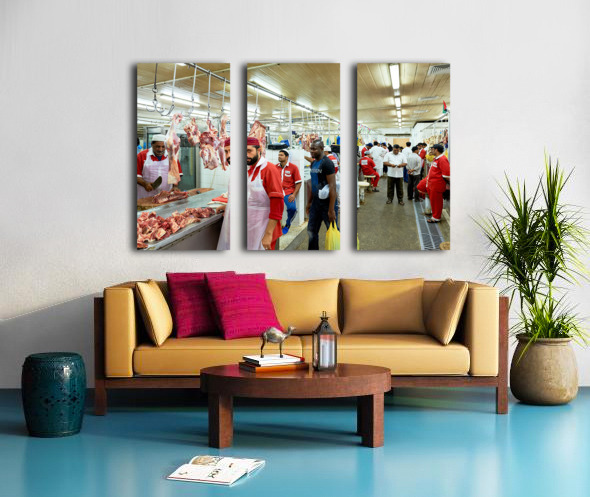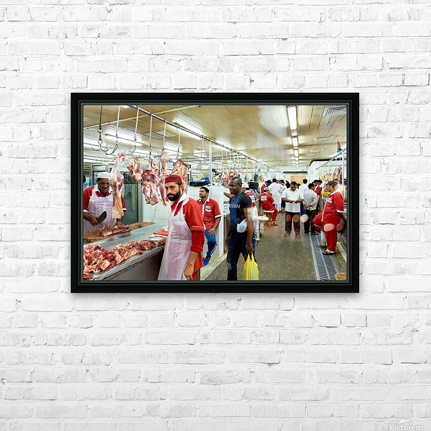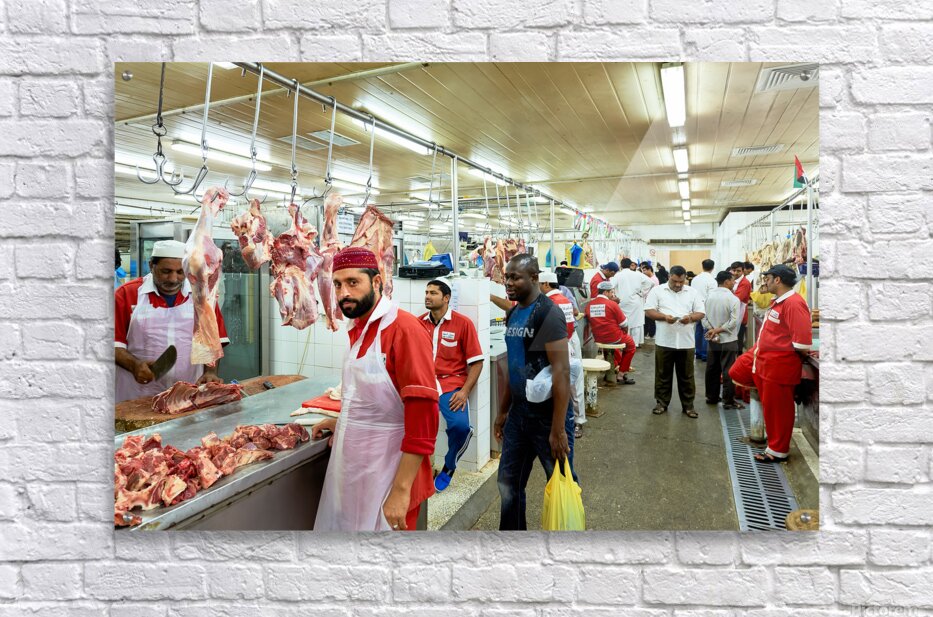 Butchers work at a busy meat market in Dubai UAE preparing fresh Picture Frame Printing