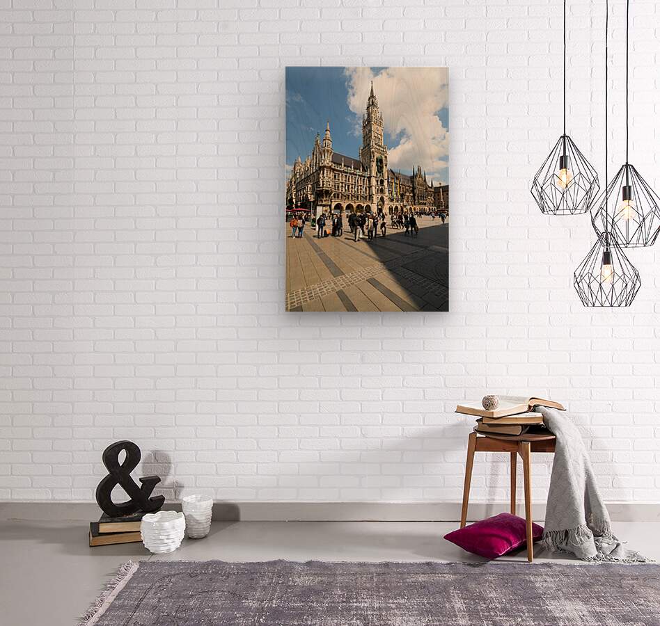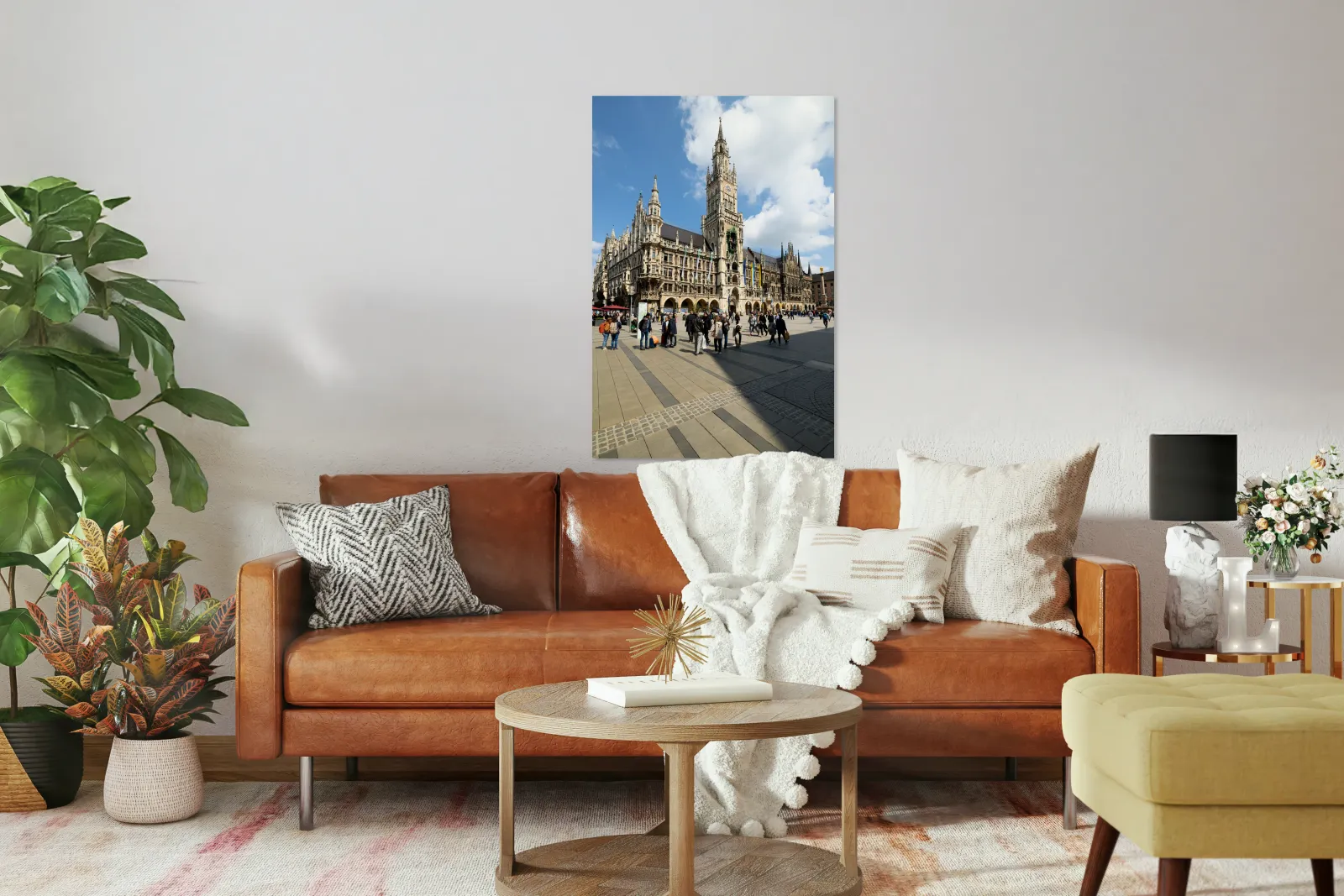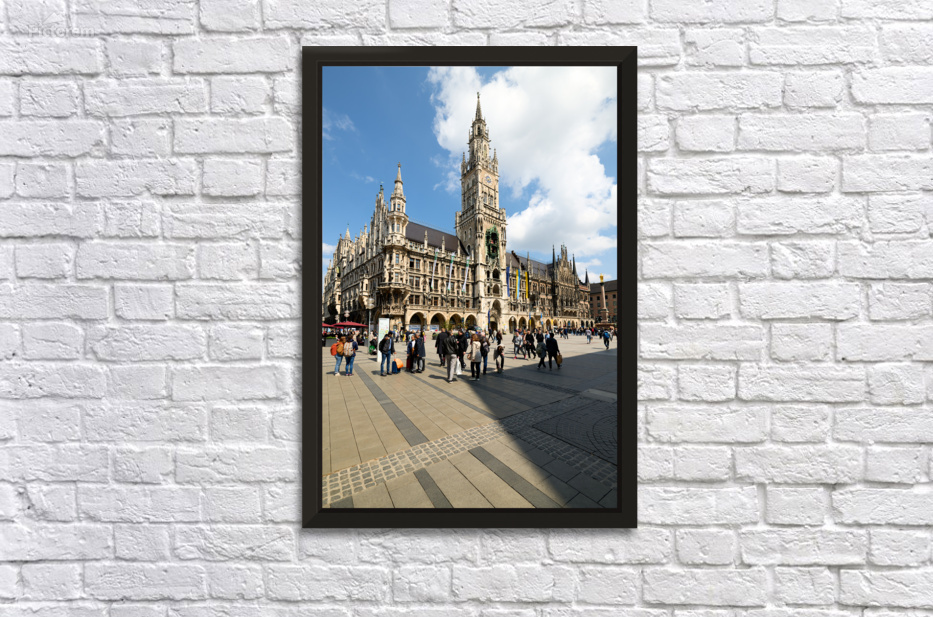 People gather in Marienplatz as they visit the town hall in Munich Bavaria on a clear day. The square is full of activity.