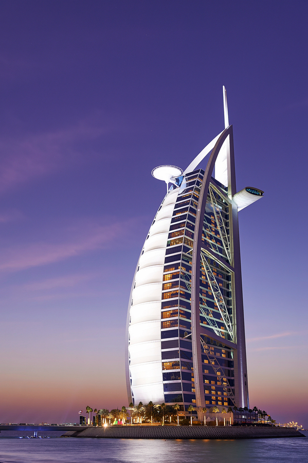 BURJ AL ARAB HOTEL ILLUMINATED AT DUSK IN DUBAI UAE
