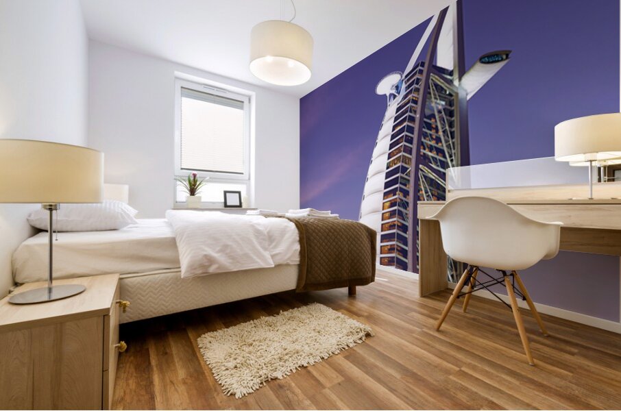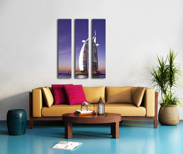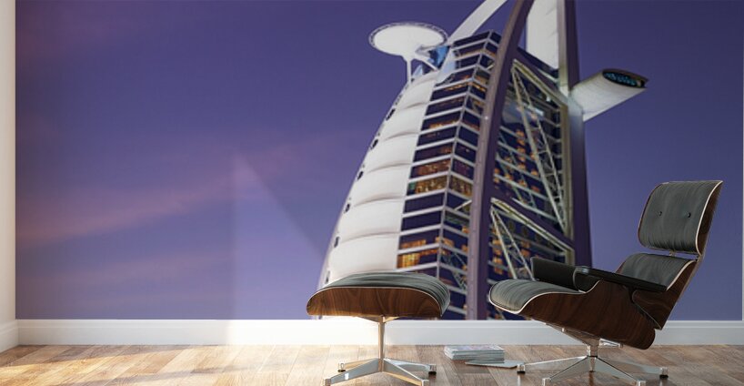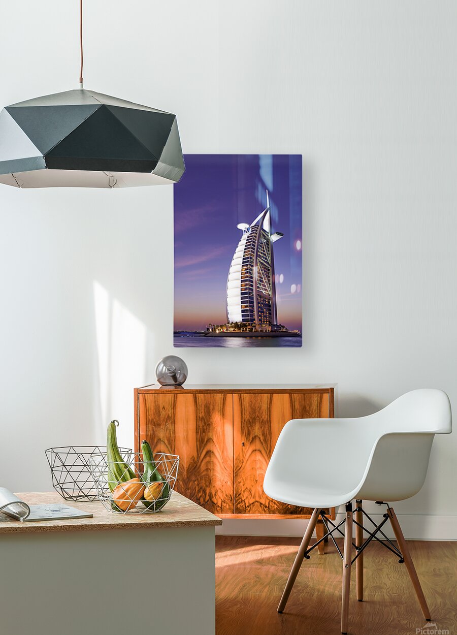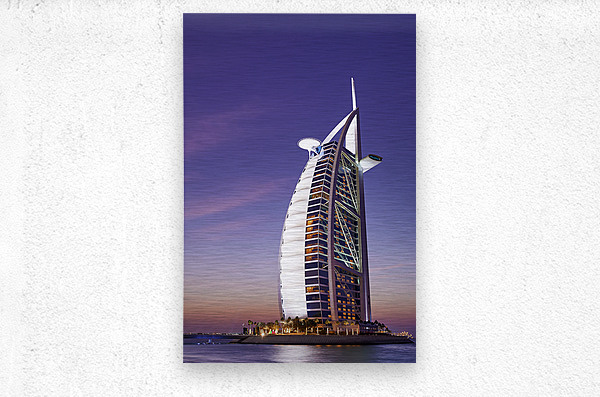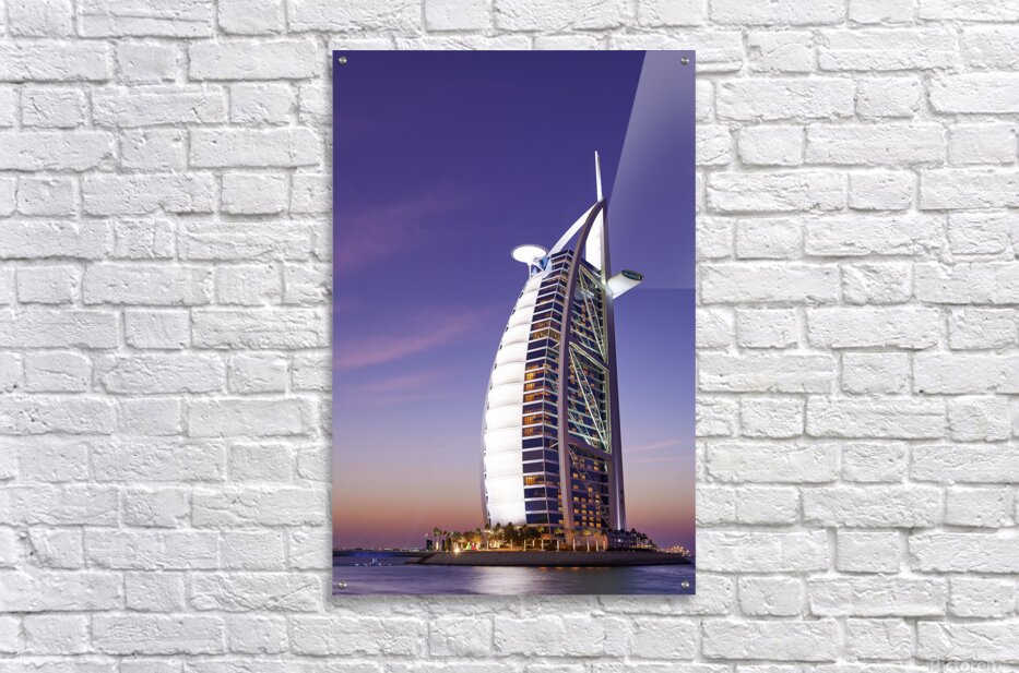 ABOUT THIS ARTWORK: BURJ AL ARAB HOTEL ILLUMINATED AT DUSK IN DUBAI UAE