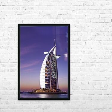 Burj Al Arab hotel illuminated at dusk in Dubai UAE Frame print