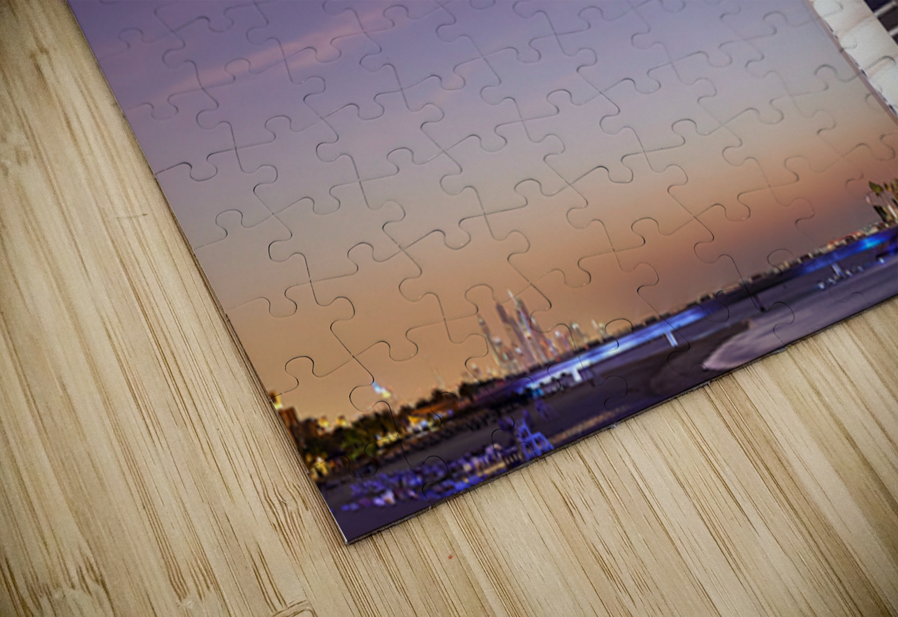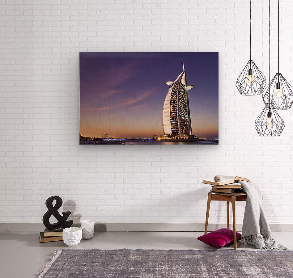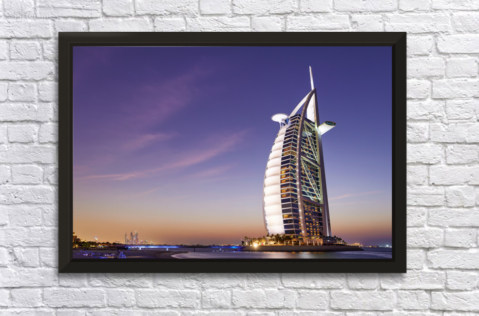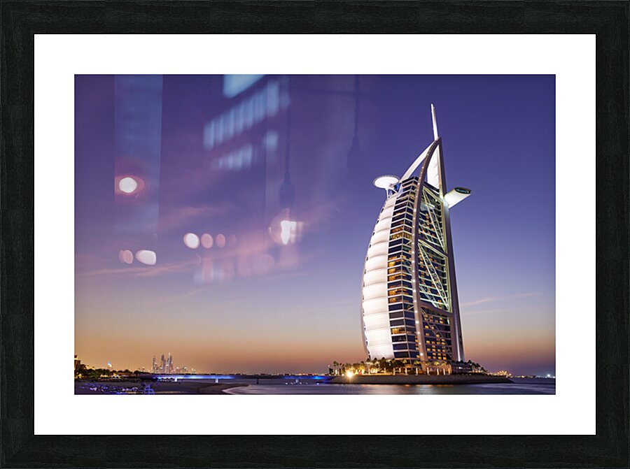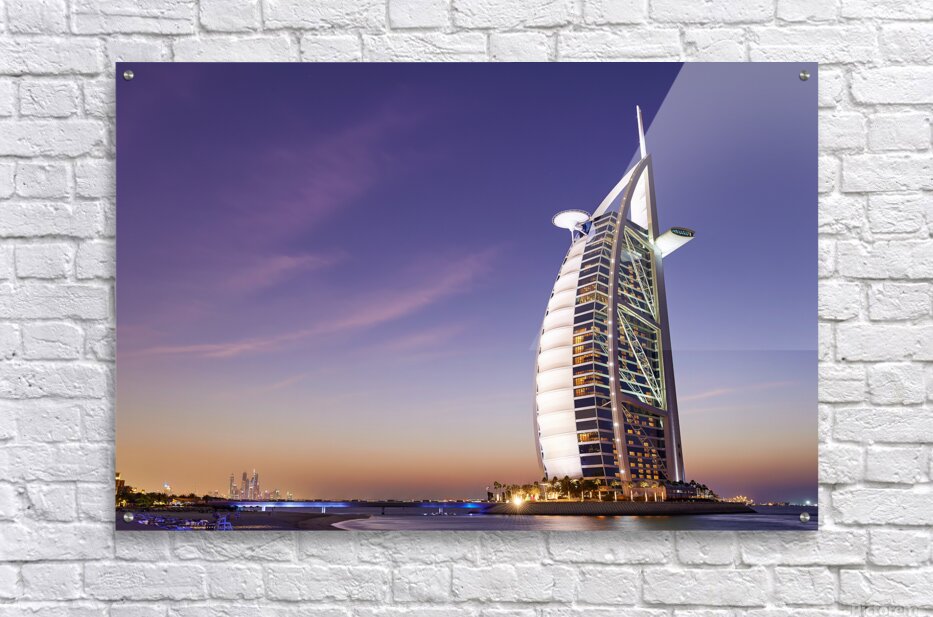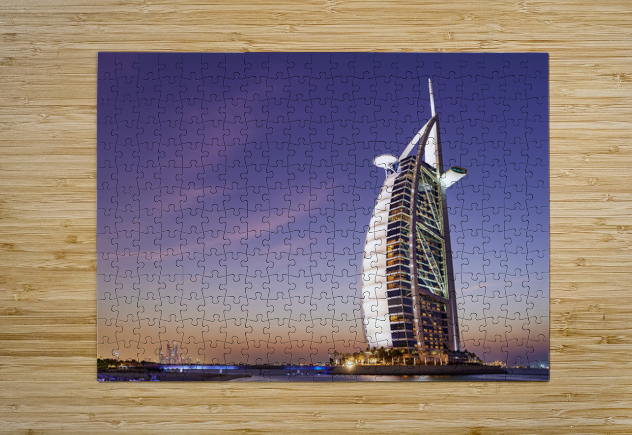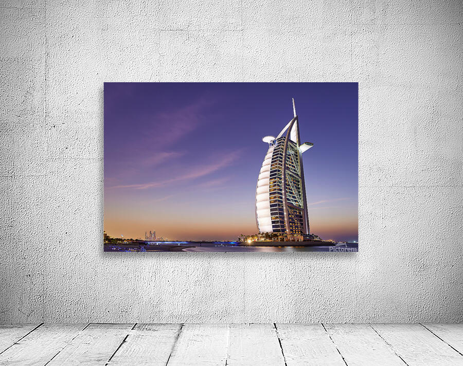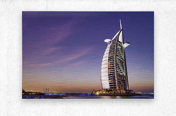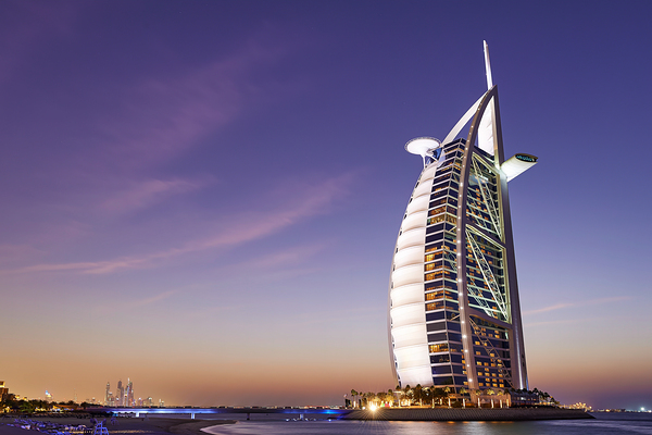 Burj Al Arab hotel shines bright against the twilight sky in Dubai. The city skyline is visible in the background as night falls.