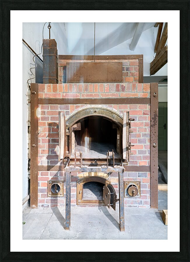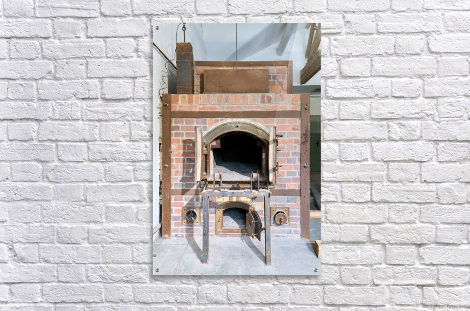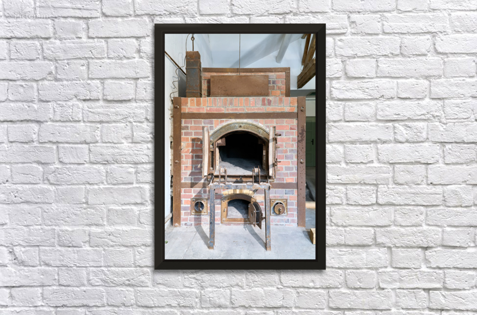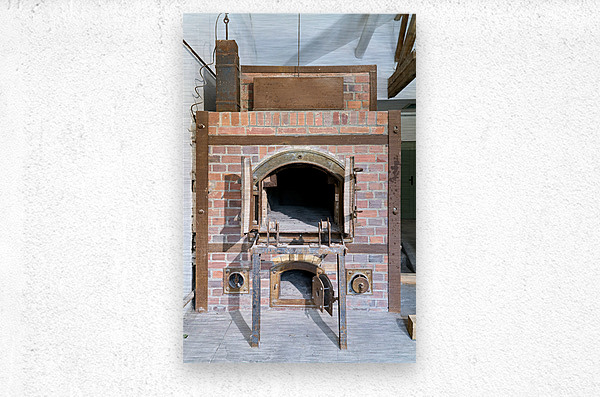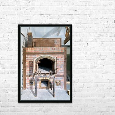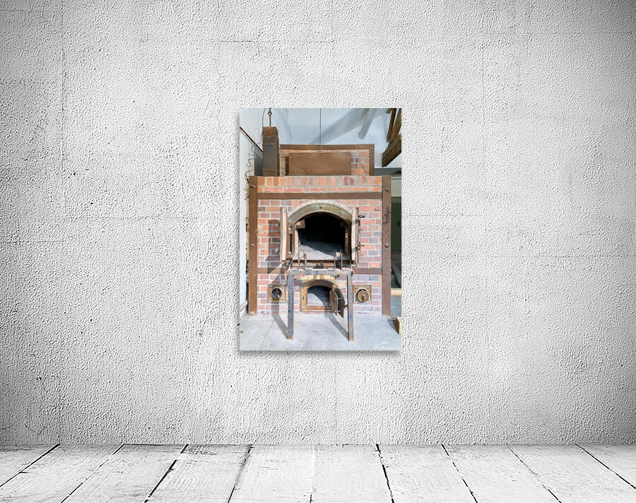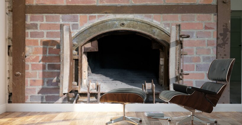 The crematorium at Dachau Concentration Camp in Munich Bavaria. The structure has brick walls and a large opening.