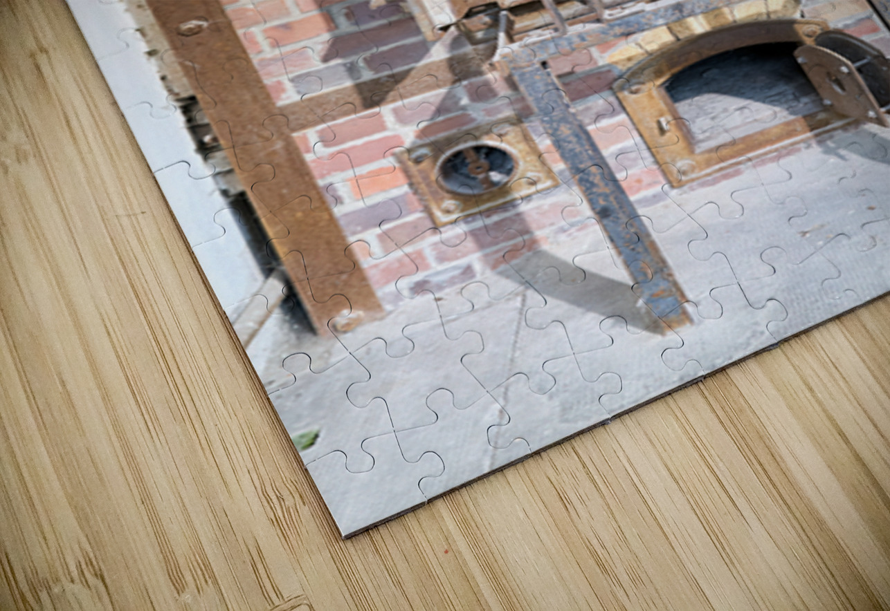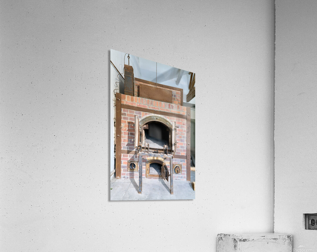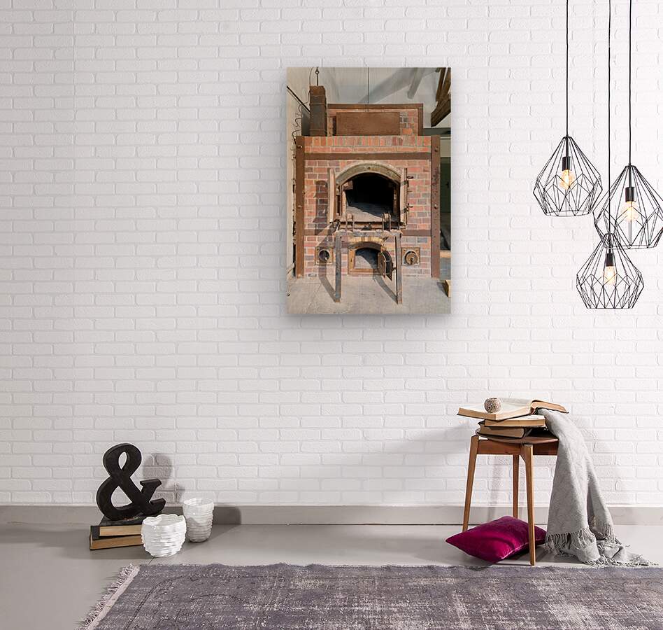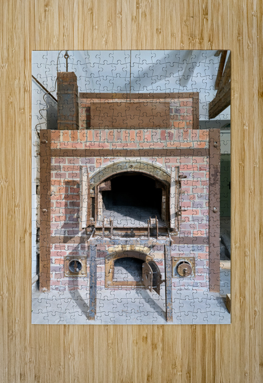 The crematorium at Dachau Concentration Camp in Munich Bavaria. The structure has brick walls and a large opening.