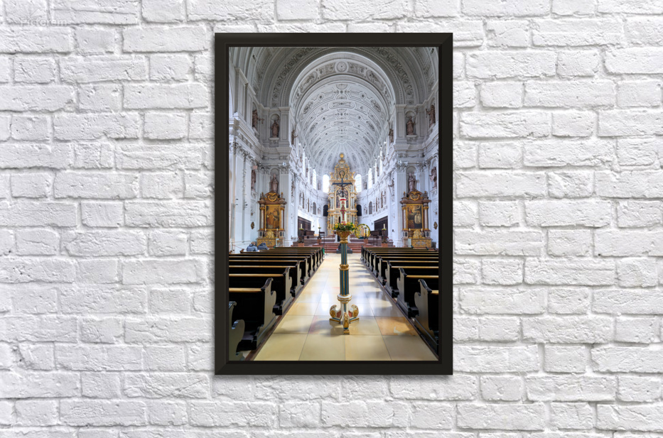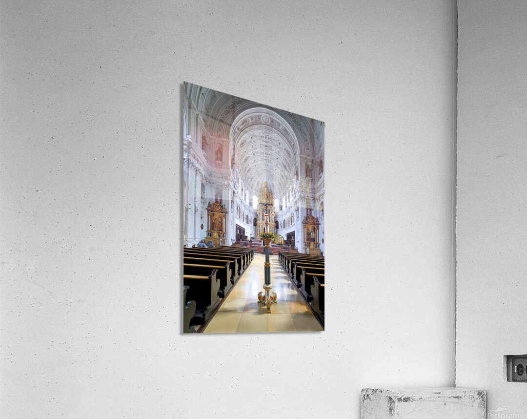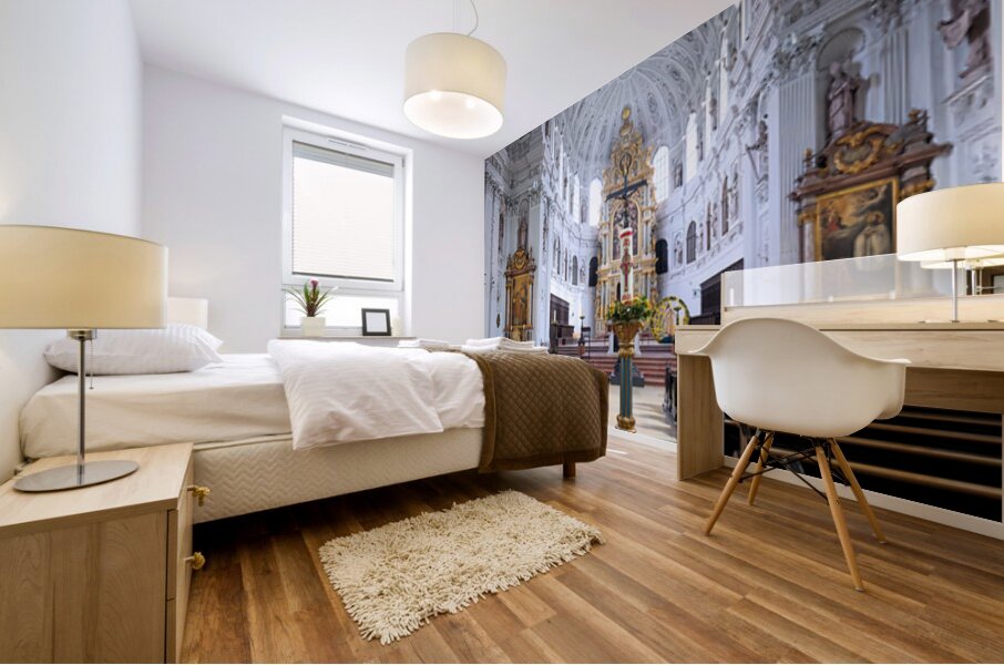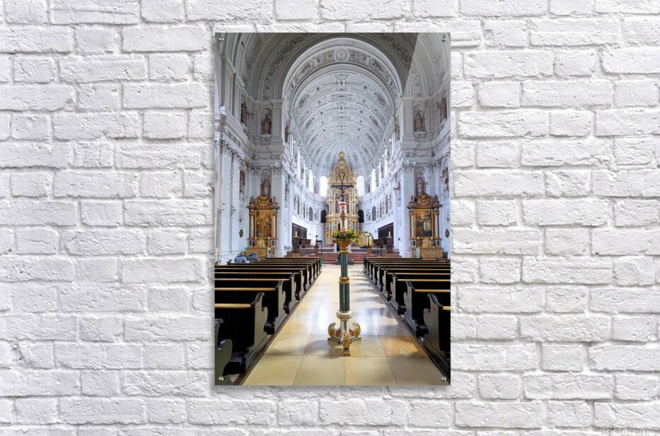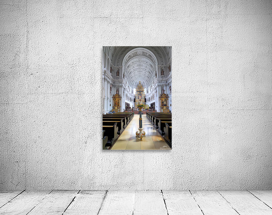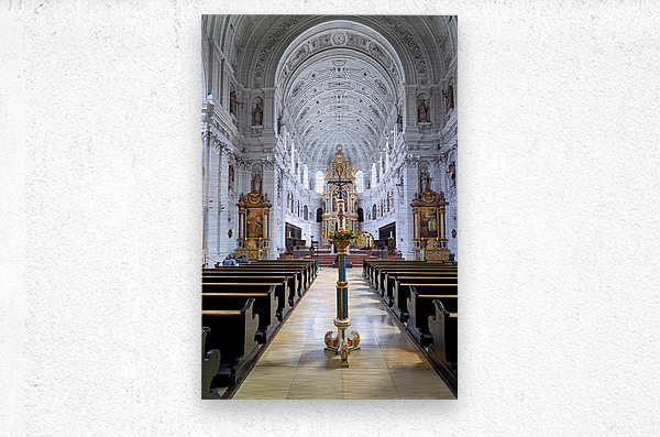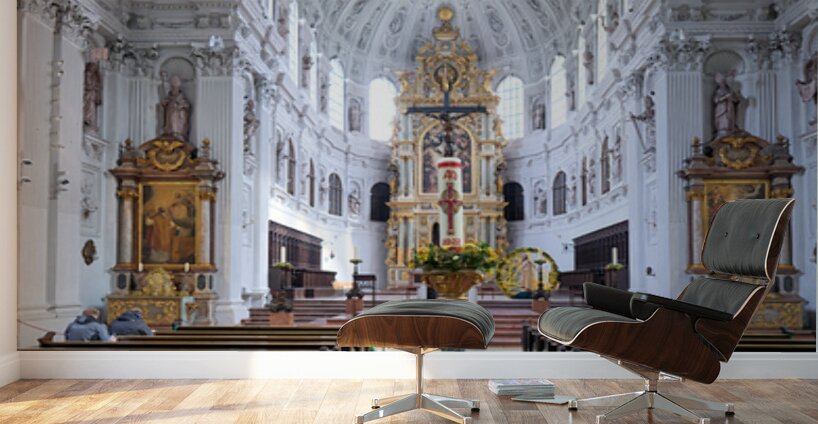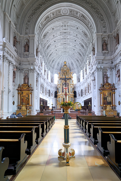 Visitors explore the interior of St. Michael Church in Munich Bavaria. The church features tall ceilings detailed decorations and seating.
