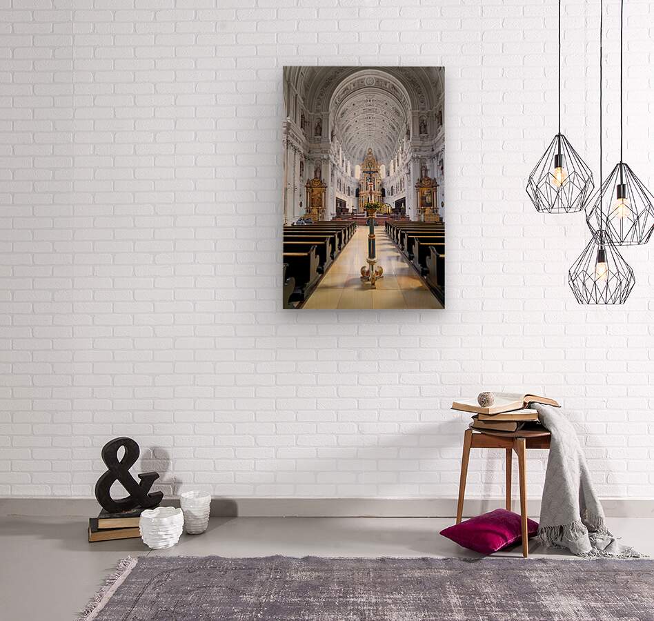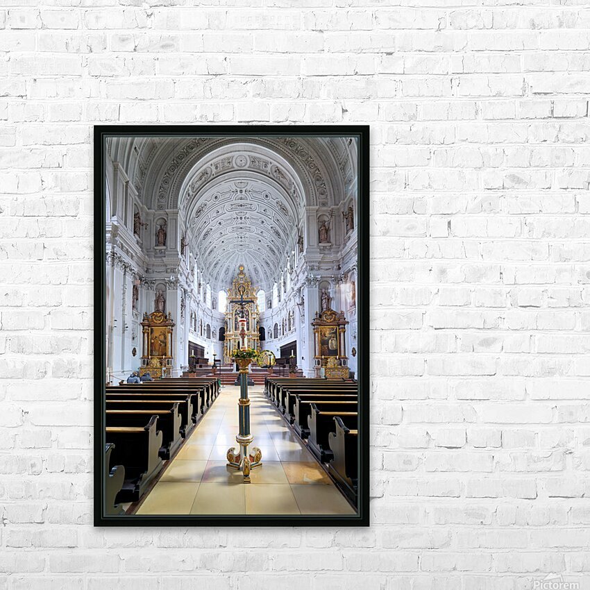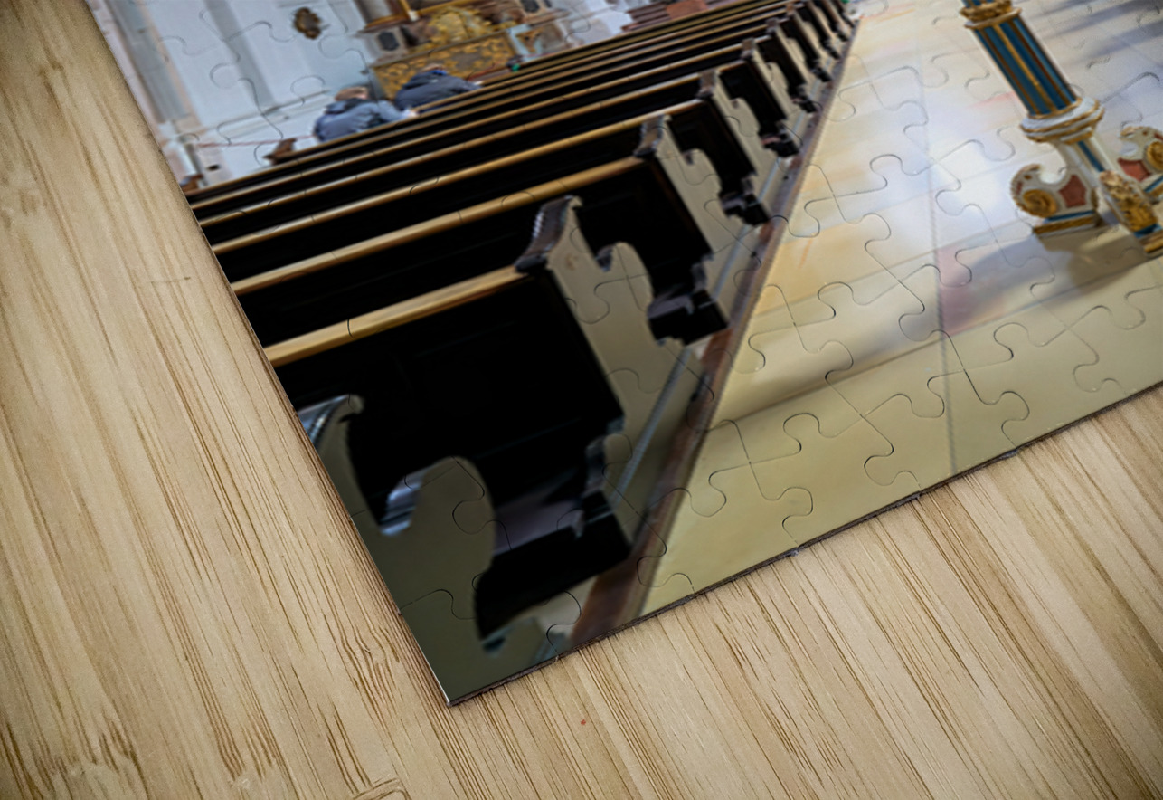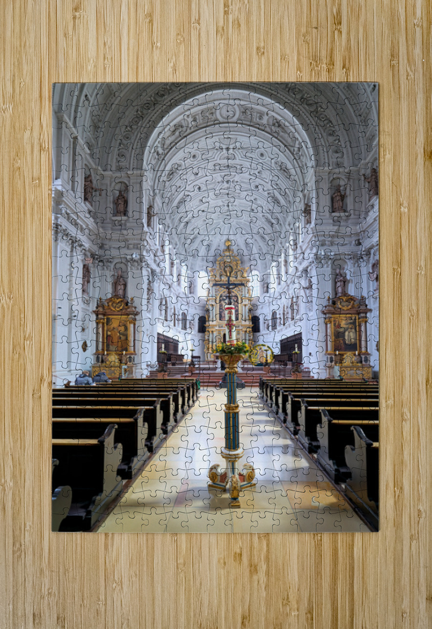 Visitors explore the interior of St. Michael Church in Munich Bavaria. The church features tall ceilings detailed decorations and seating.