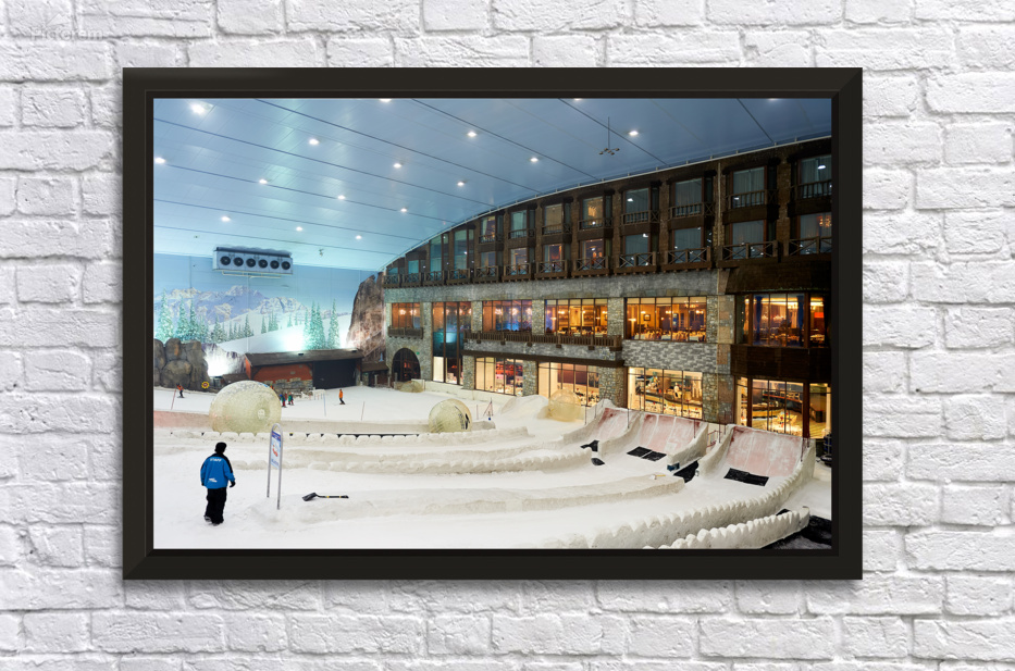 Visitors enjoy various snow activities at the indoor ski resort in Dubai. The large building features snow-covered areas and fun spaces.