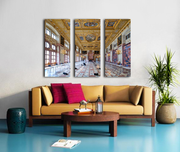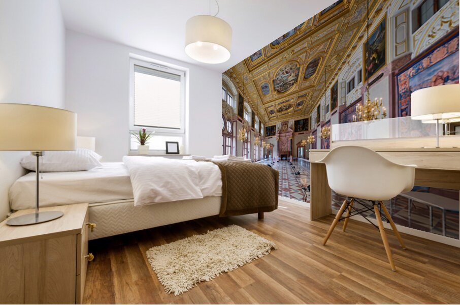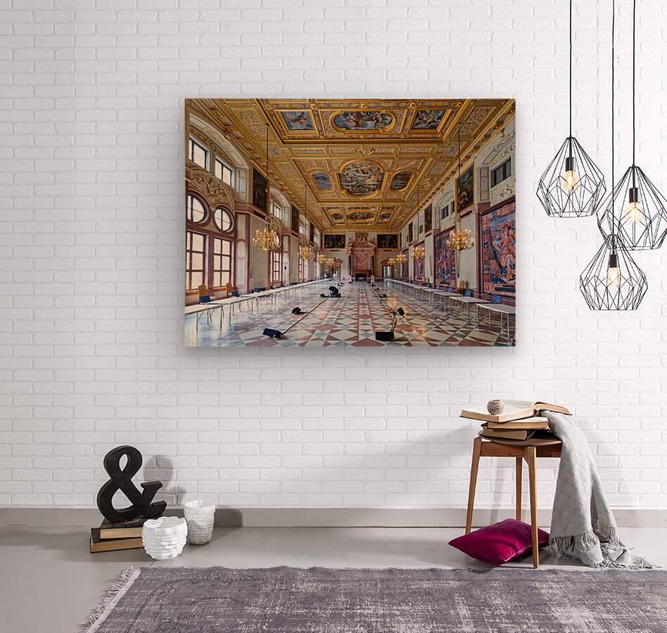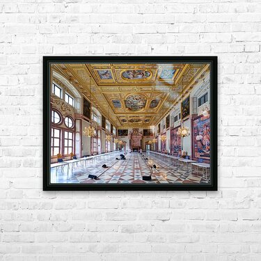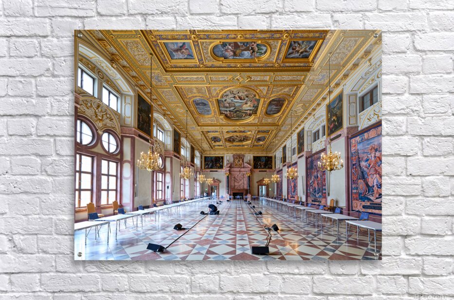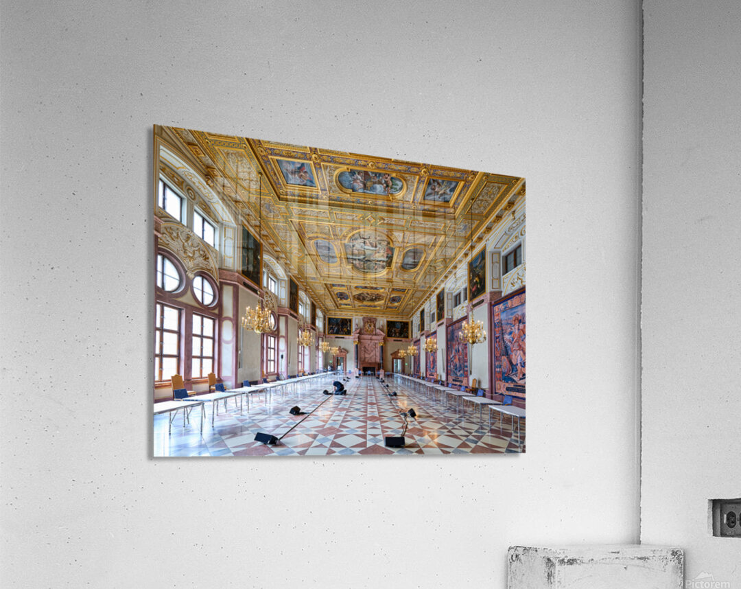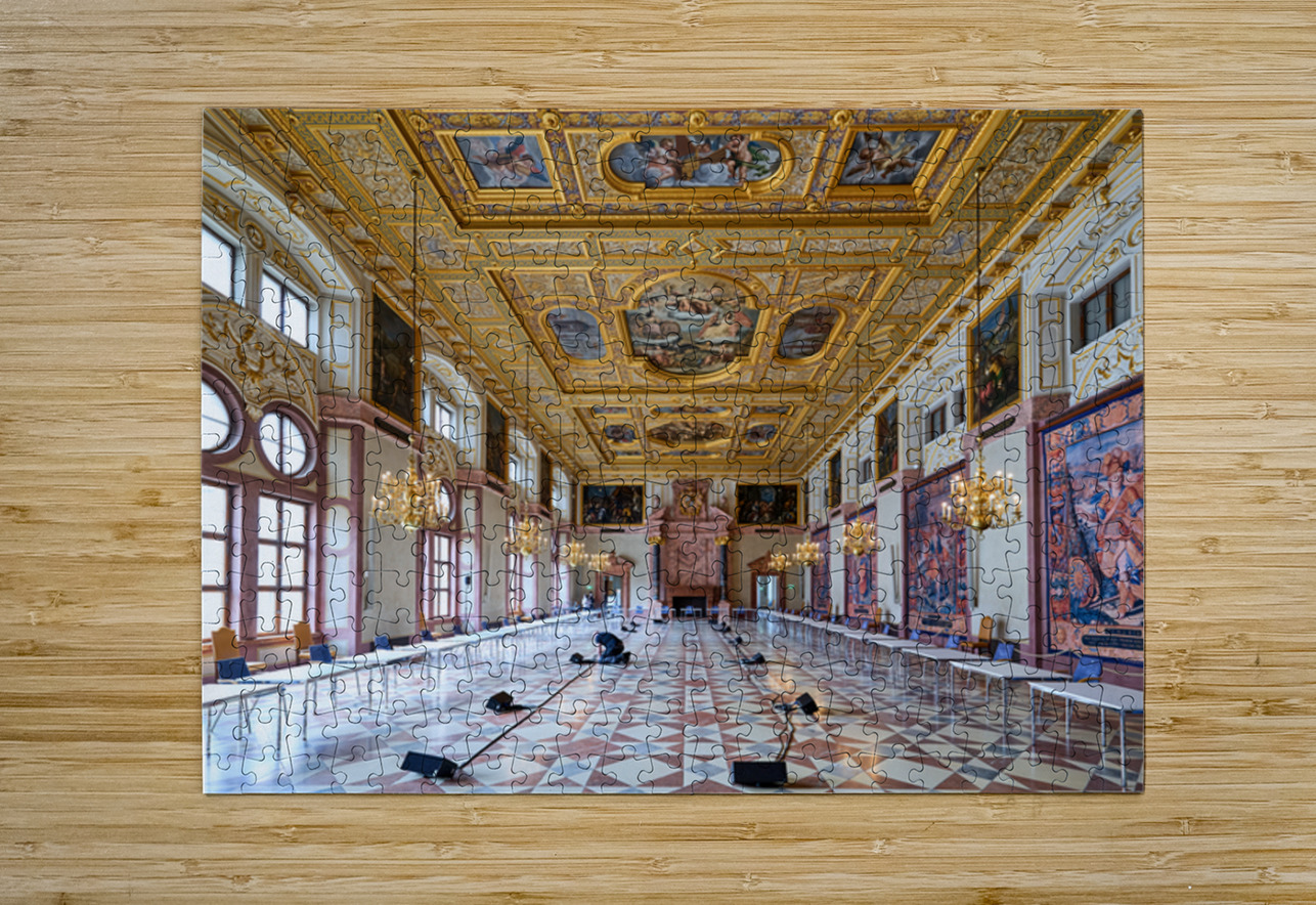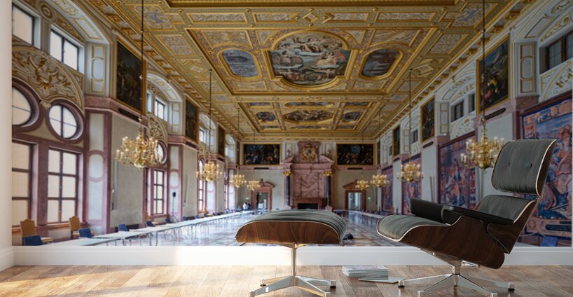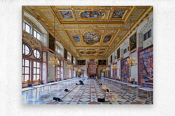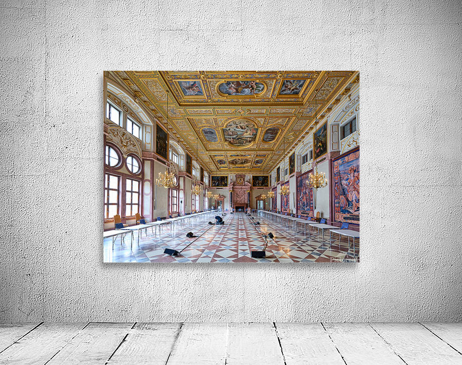 Inside the Residenz Palace in Munich workers prepare the hall for an event. The space features ornate ceilings and elegant chandeliers.