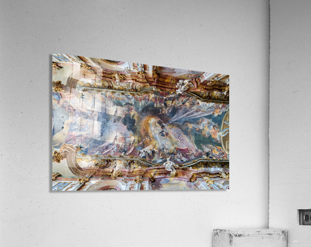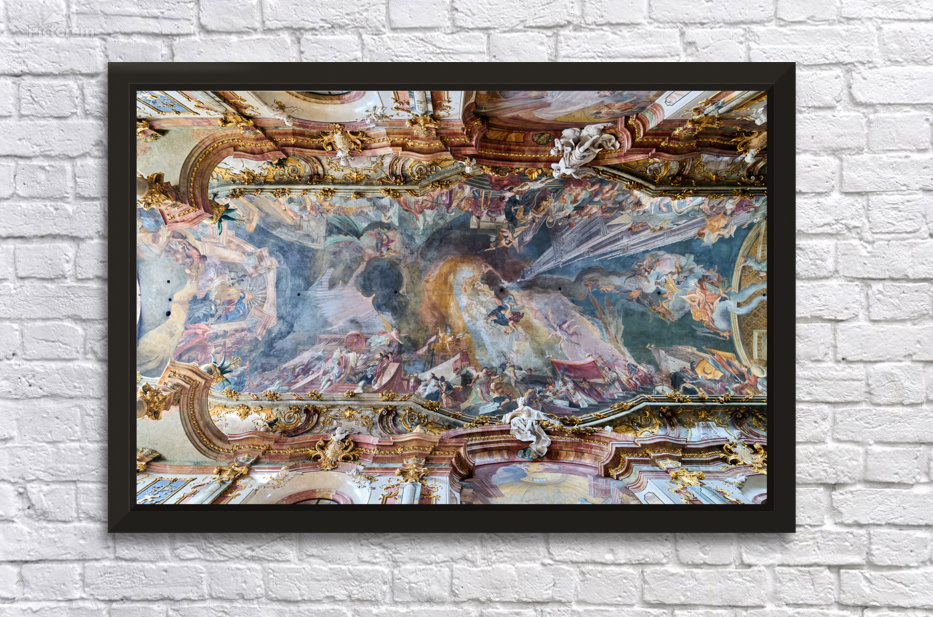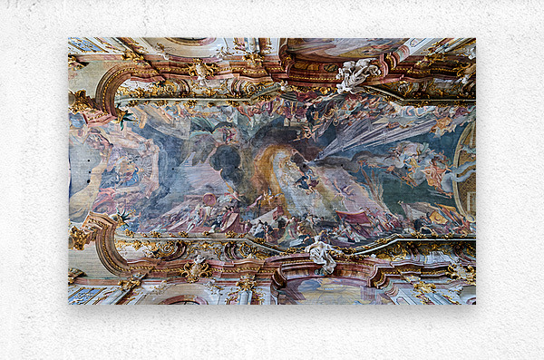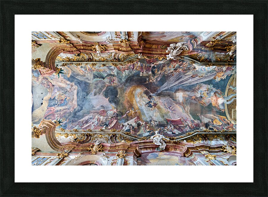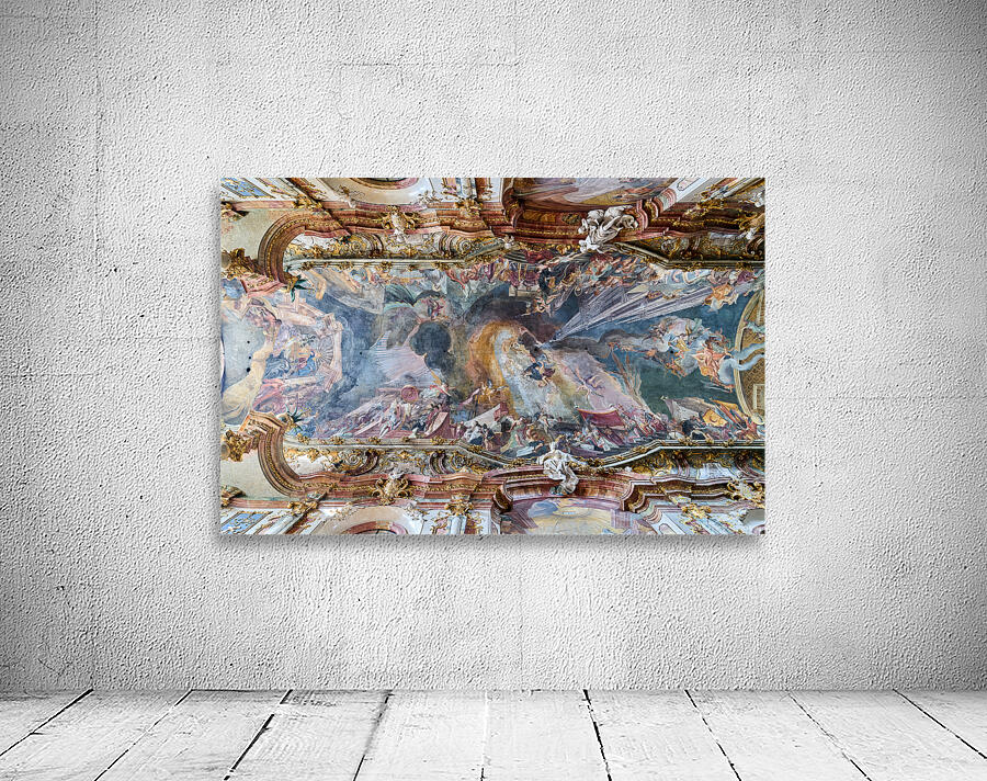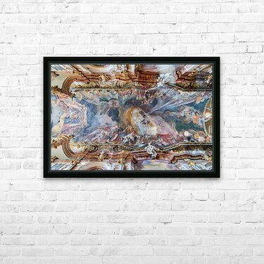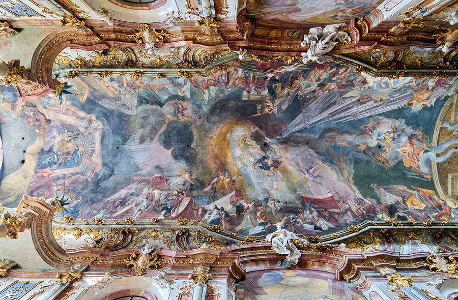 The ceiling artwork at St. Johann Nepomuk in Munich shows intricate details of scenes and figures against a vibrant background.