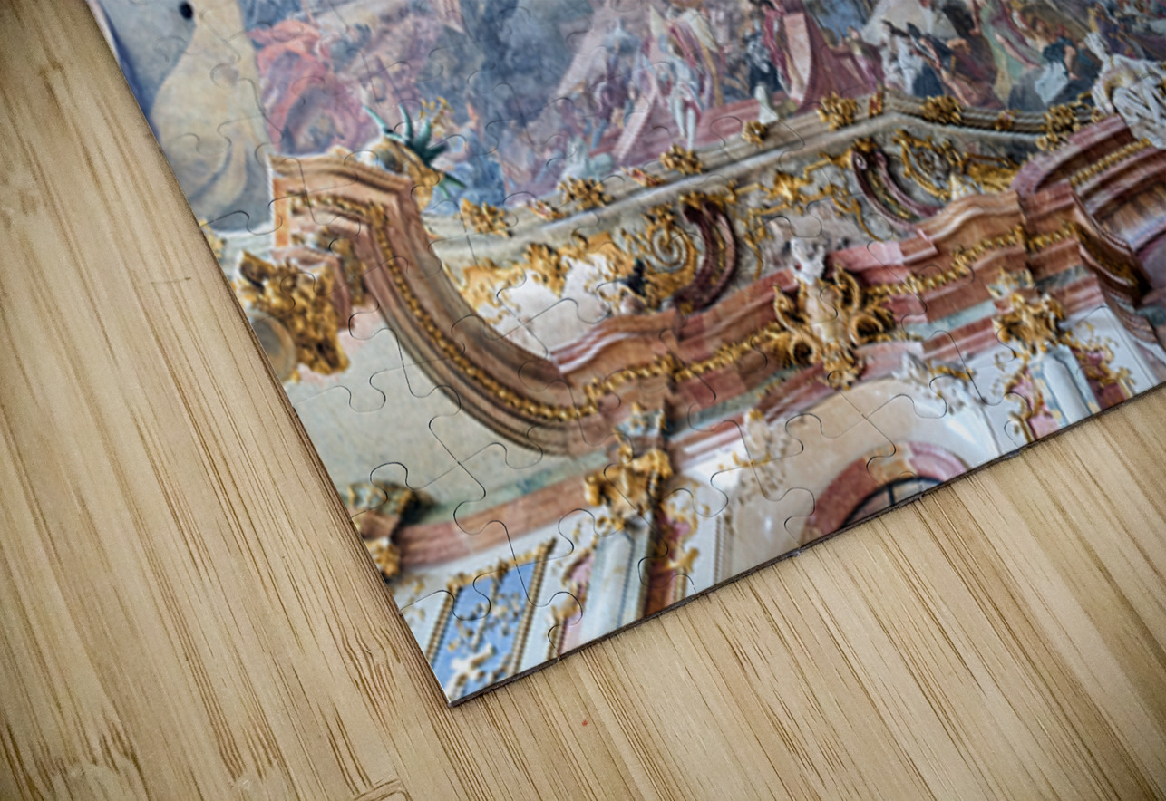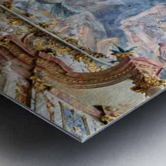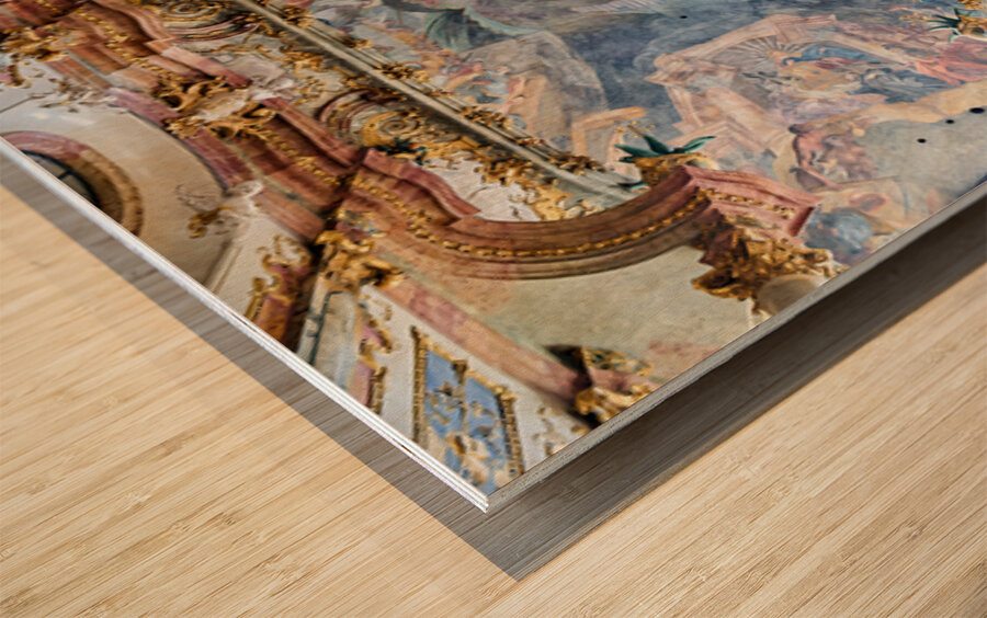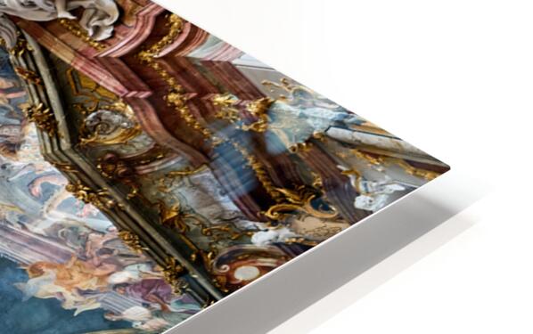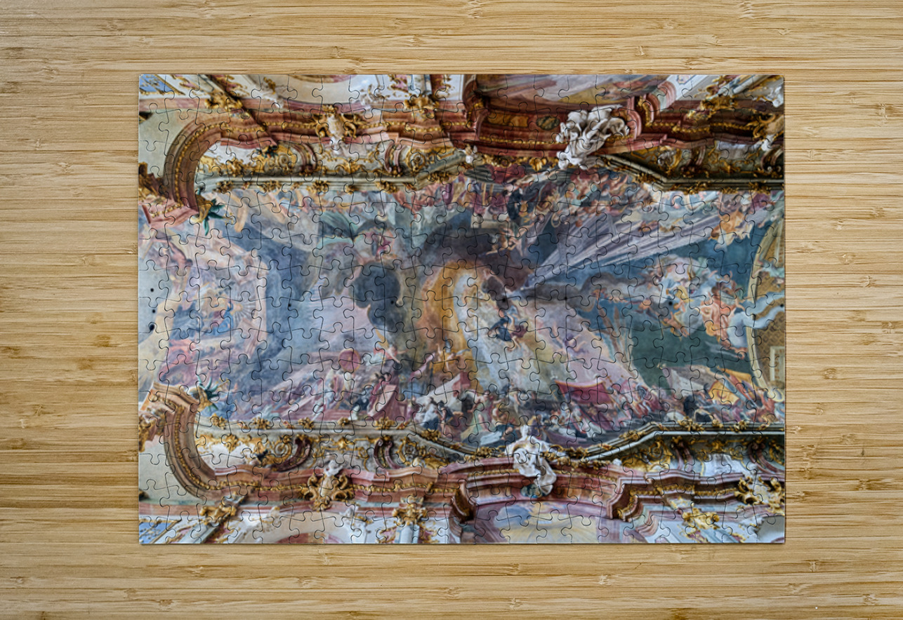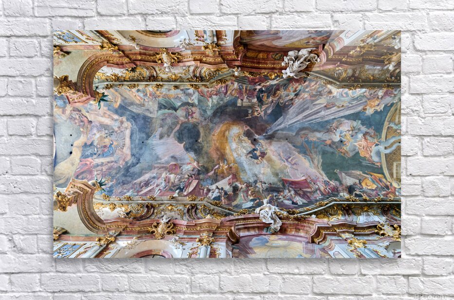 The ceiling artwork at St. Johann Nepomuk in Munich shows intricate details of scenes and figures against a vibrant background.