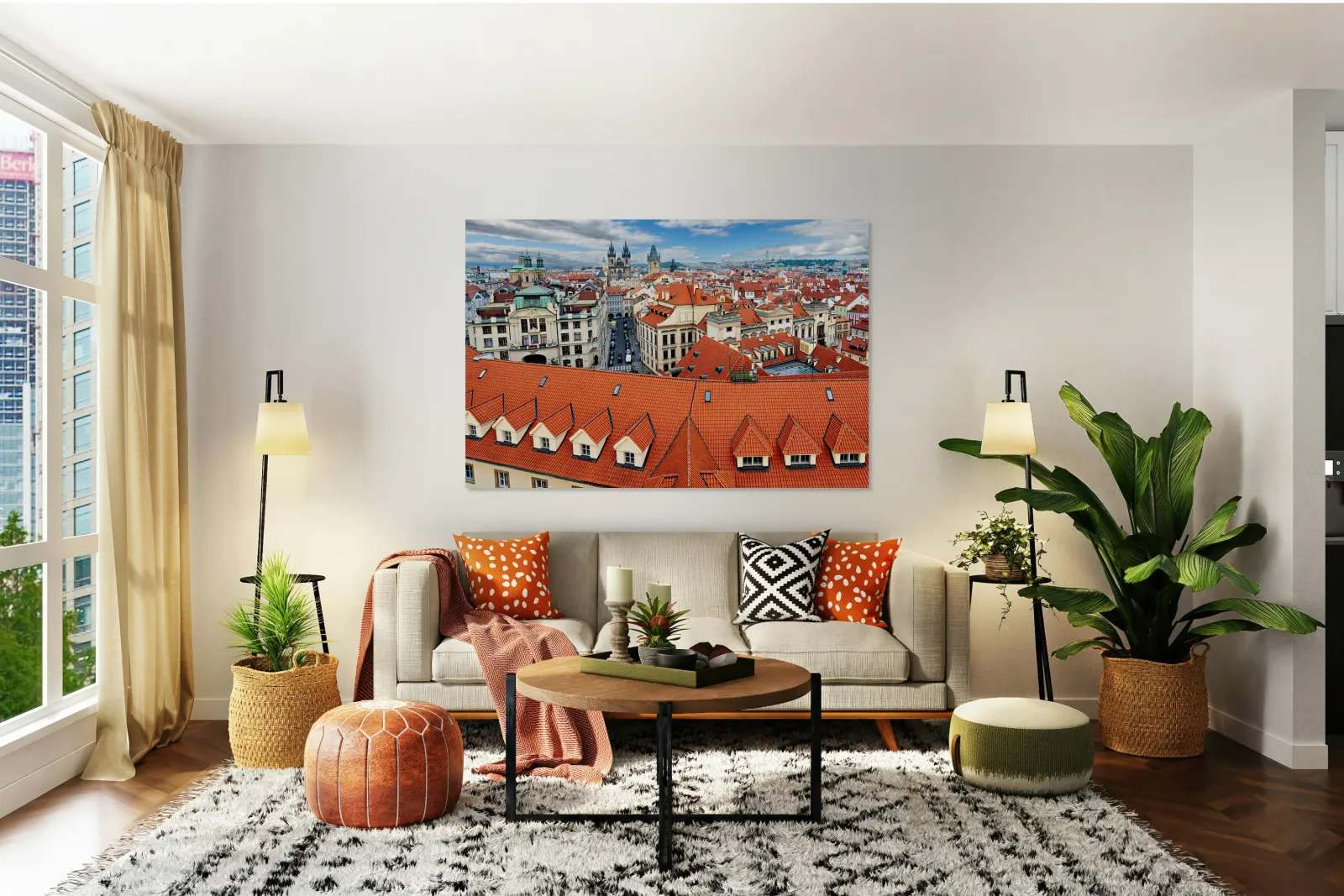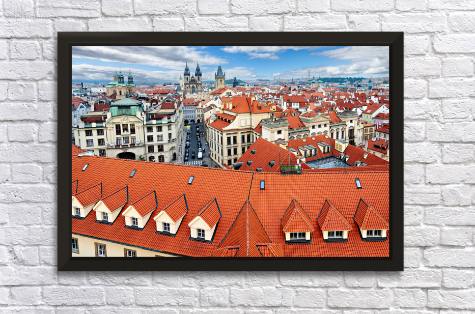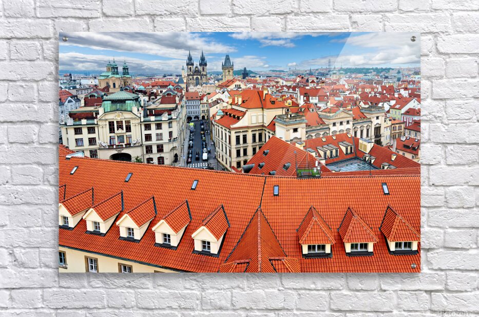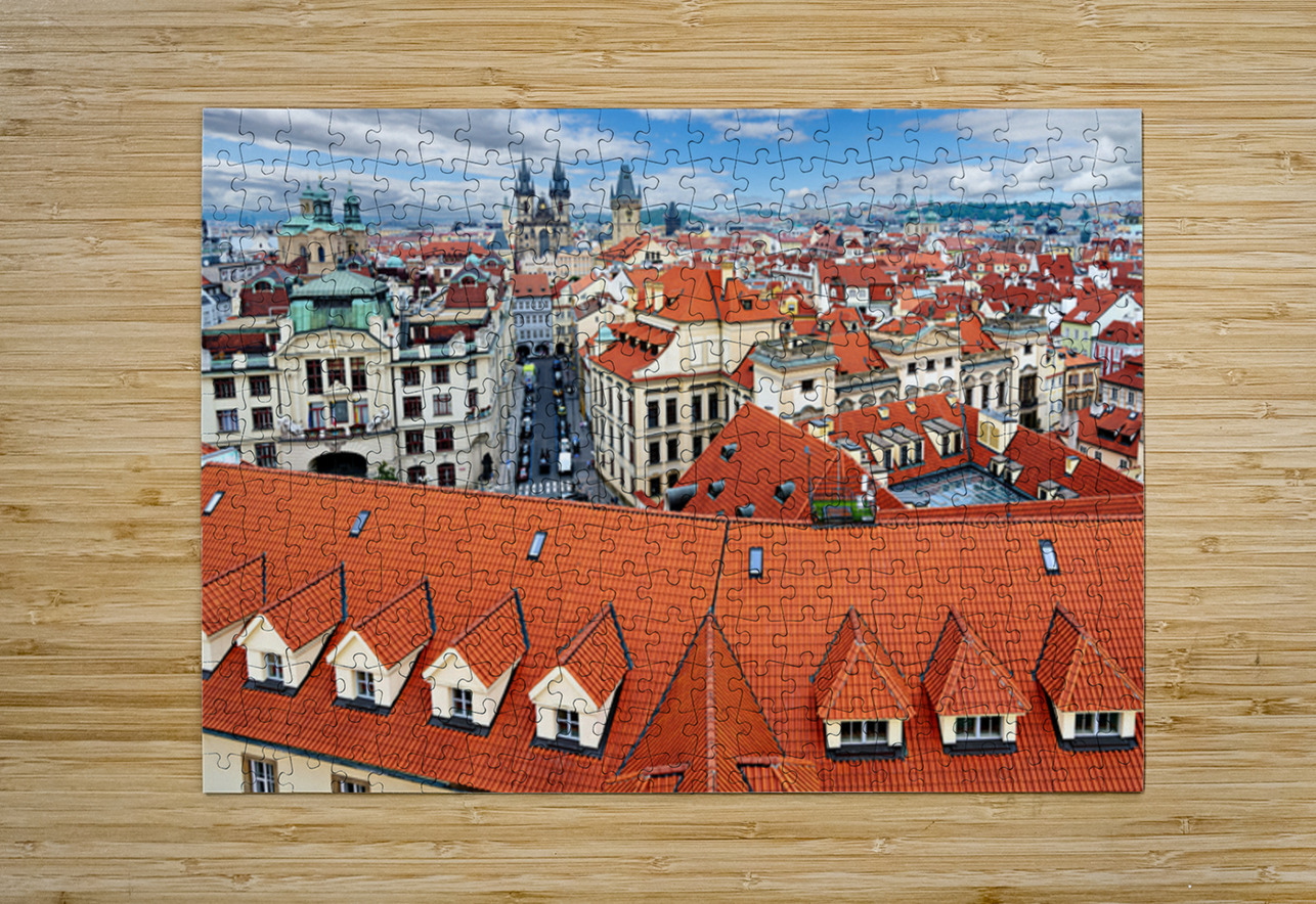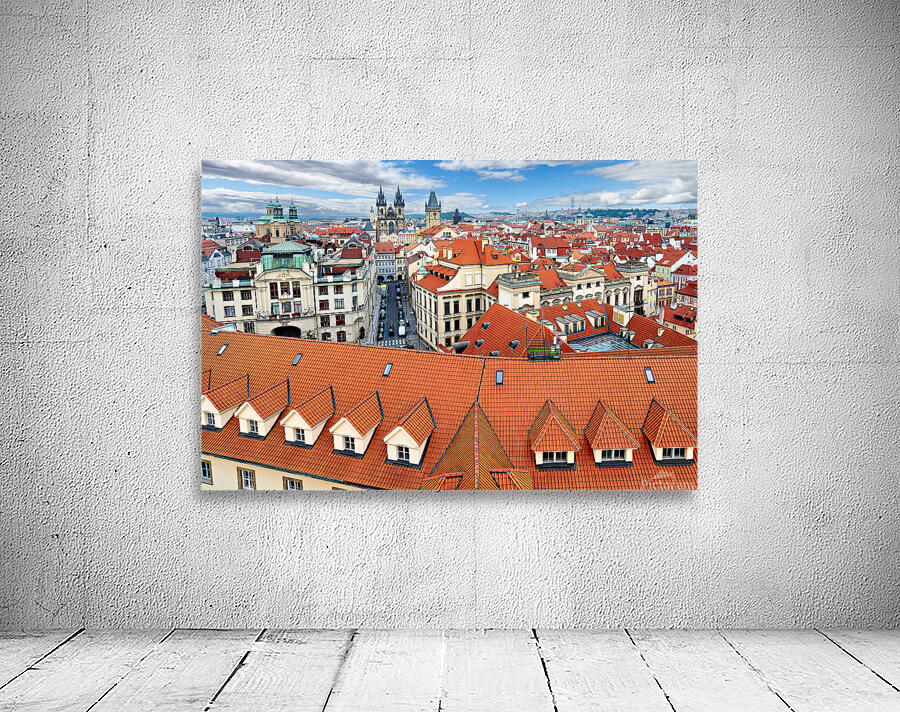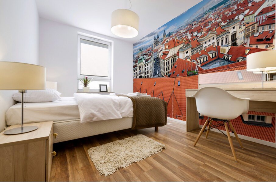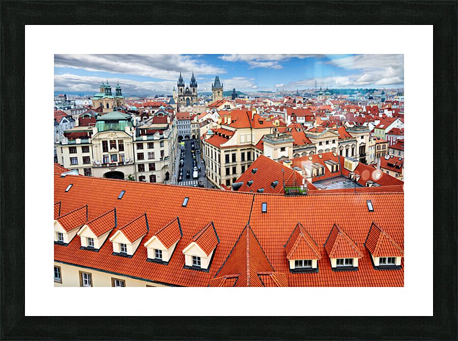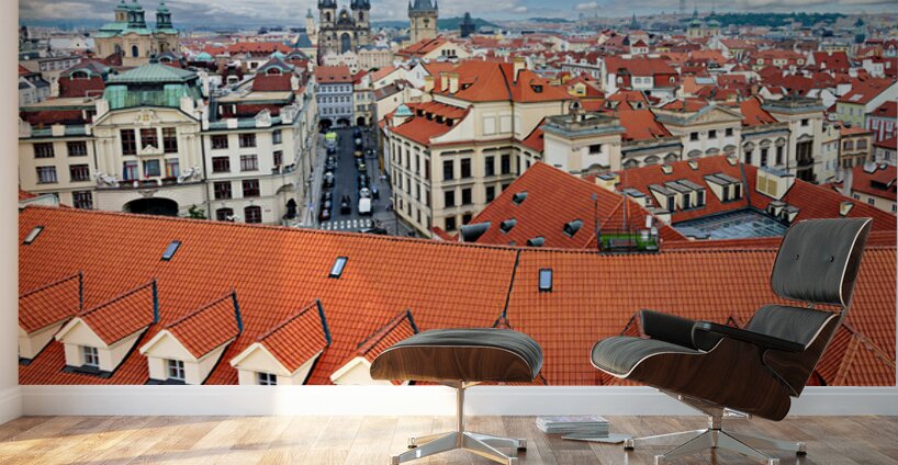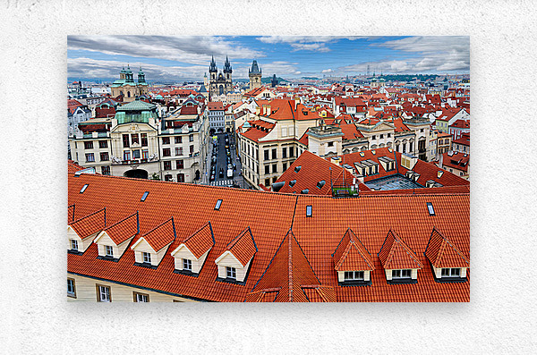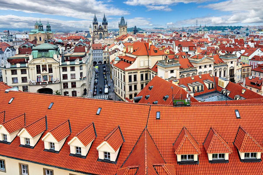 Panoramic view of Prague Czech Republic showcasing its iconic red-tiled roofs historic churches like Týn and St. Nicholas and bustling streets.