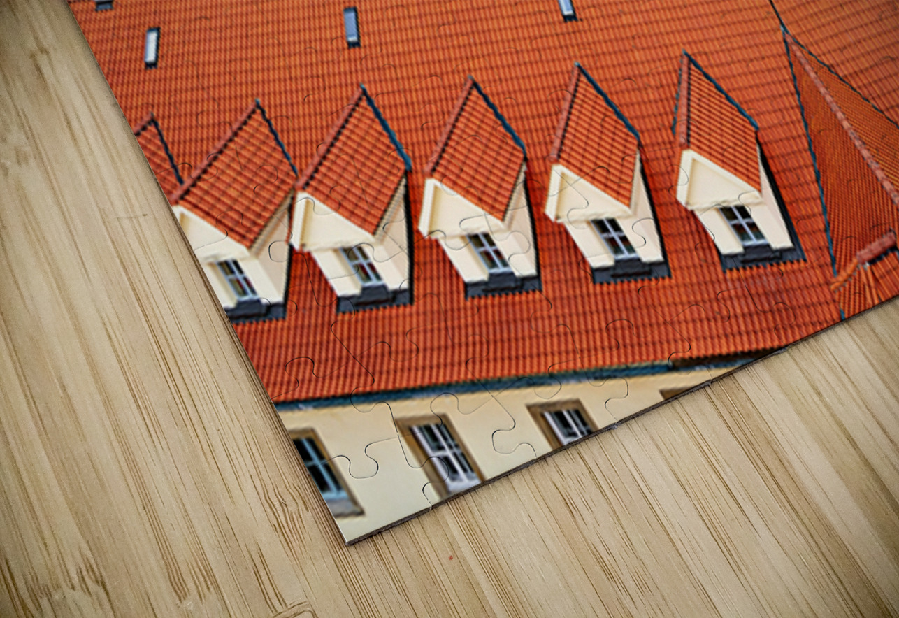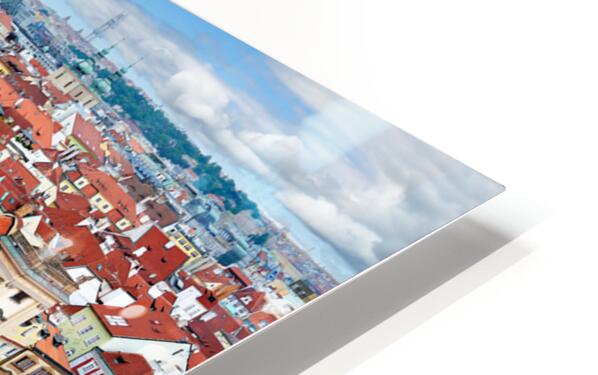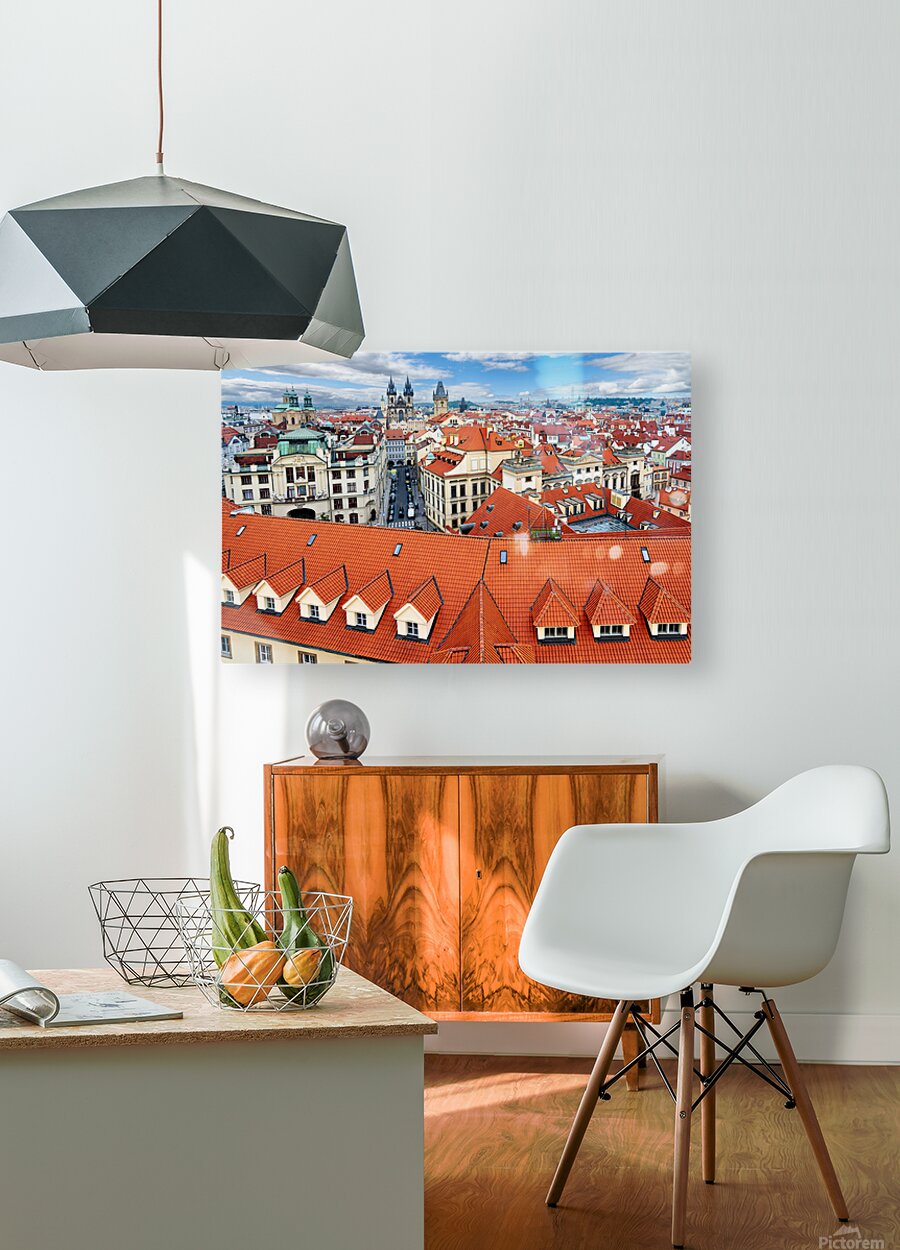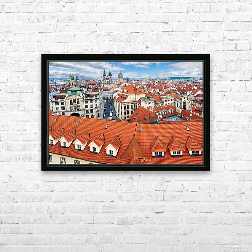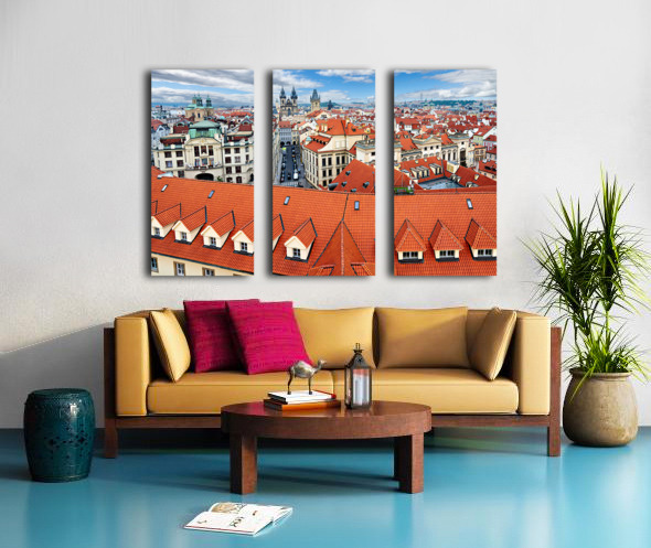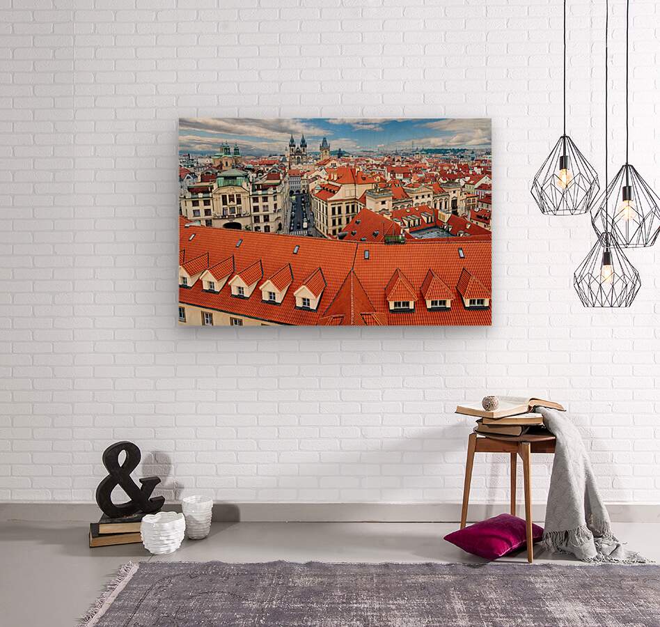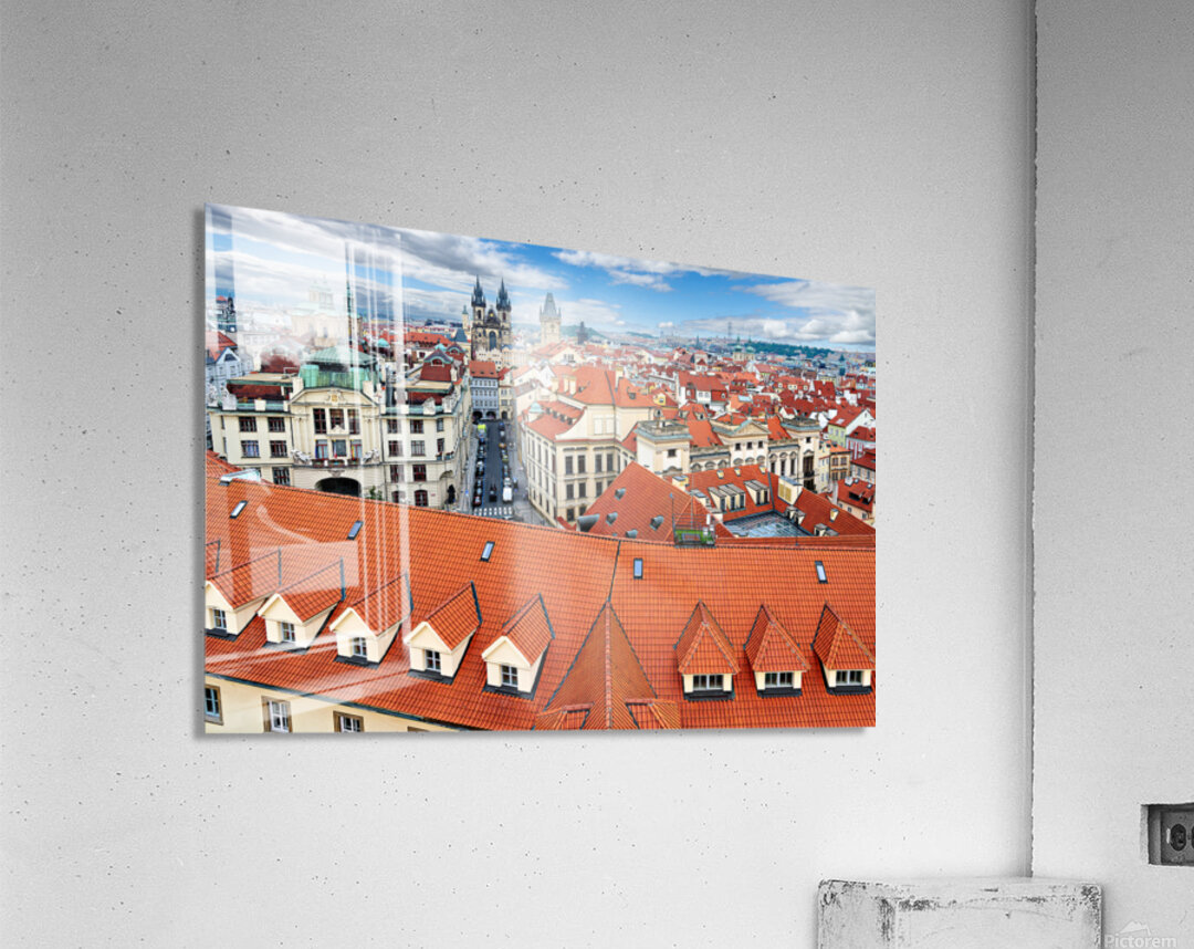 Panoramic view of Prague Czech Republic showcasing its iconic red-tiled roofs historic churches like Týn and St. Nicholas and bustling streets.