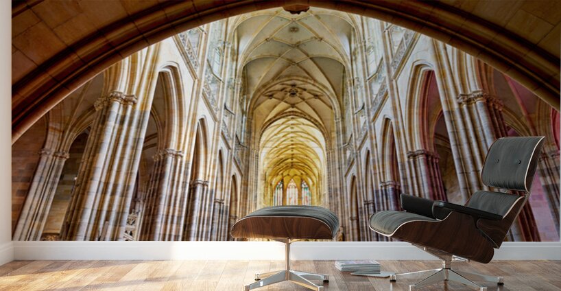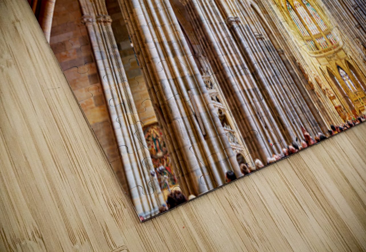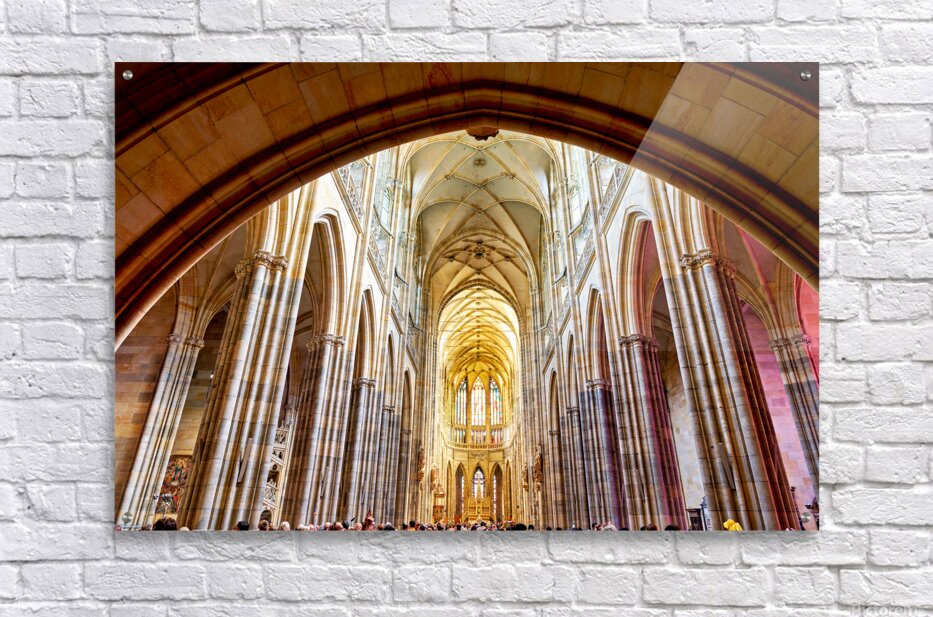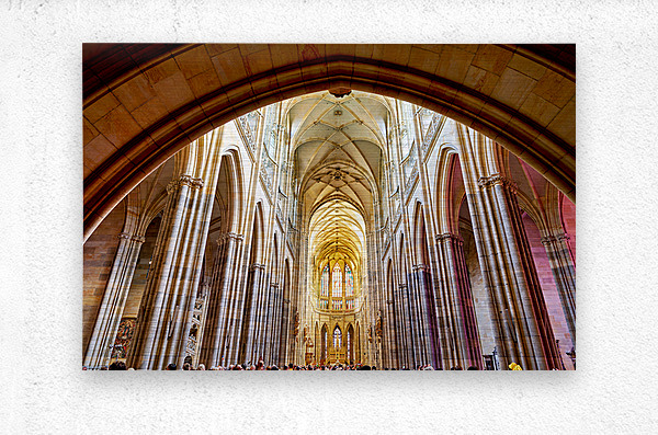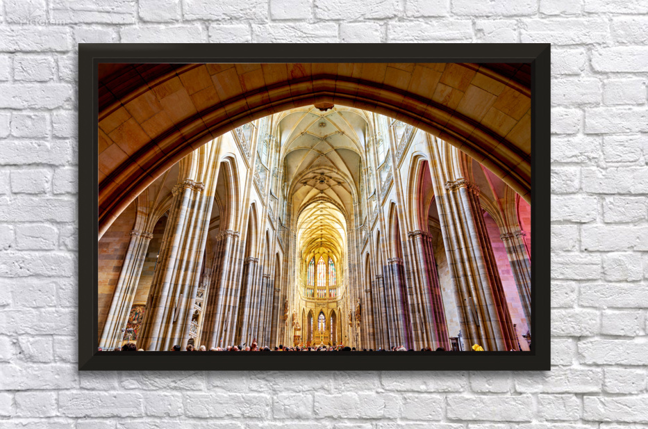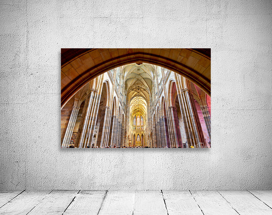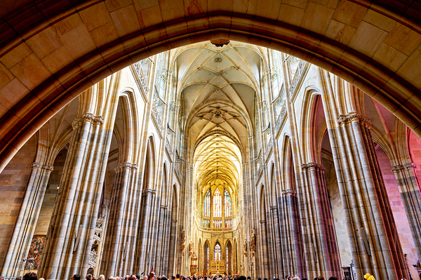 Crowds explore the majestic interior of St. Vitus Cathedral in Prague Czech Republic marveling at its intricate Gothic design and soaring arches.
