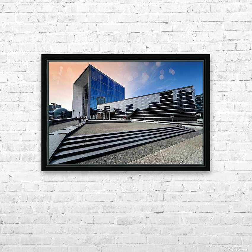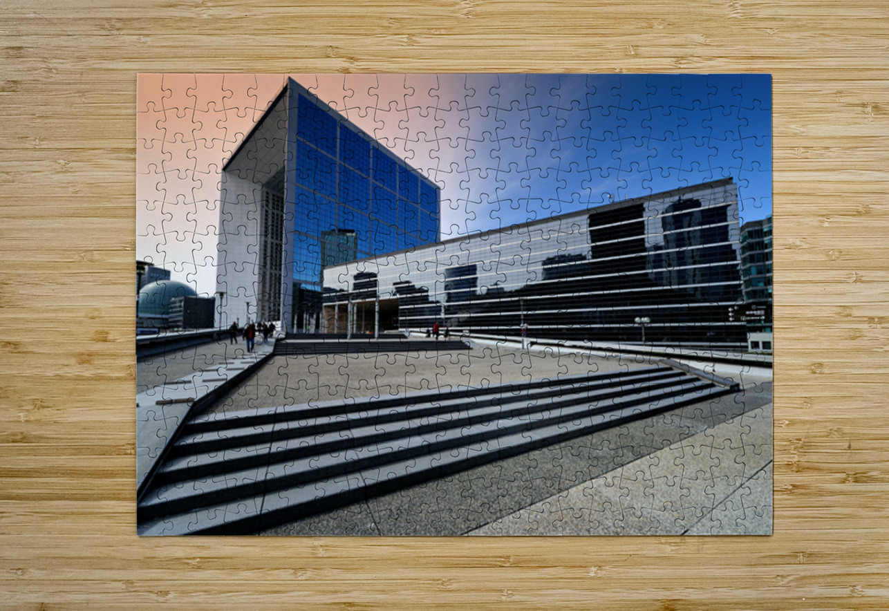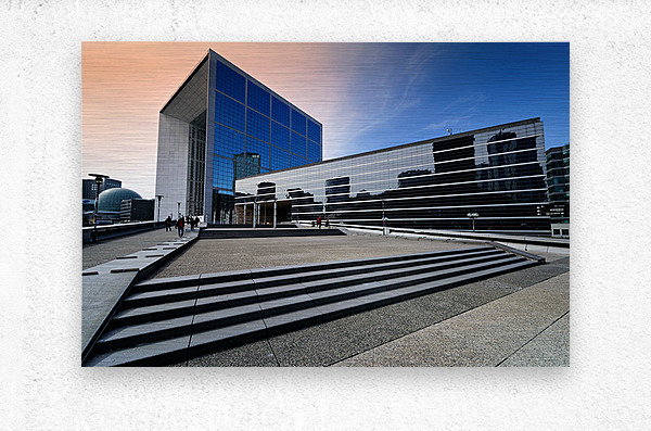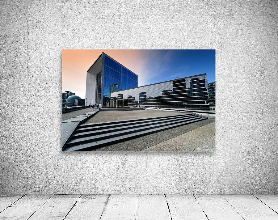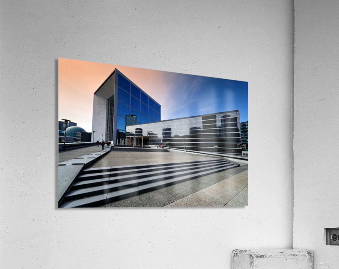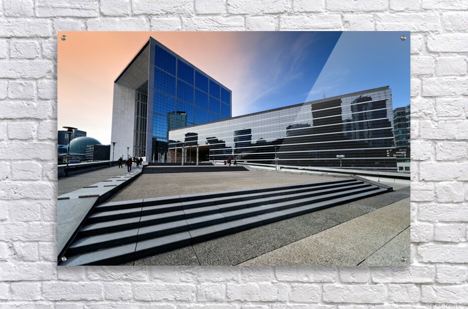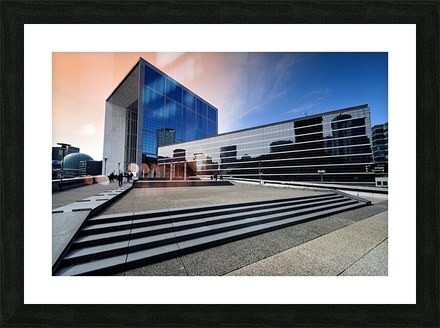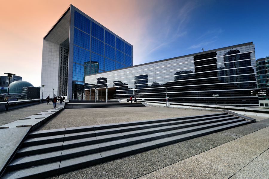 People walk around the modern buildings of La Defense in Paris on a sunny afternoon. The area shows a blend of architecture and urban life.