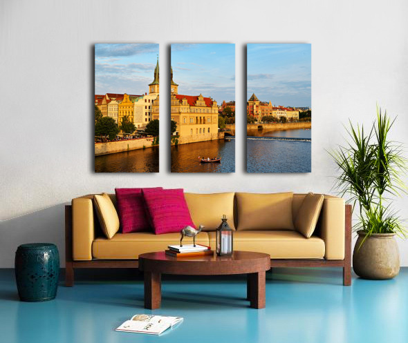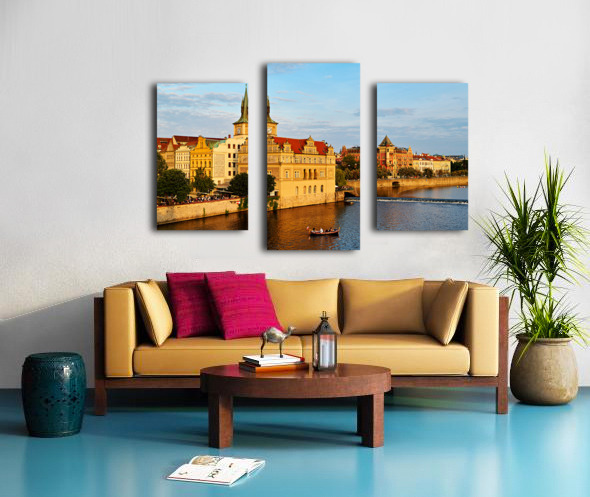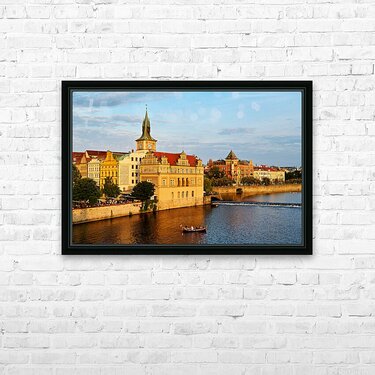 Sunset over Pragues Vltava River historic buildings and boat. Frame print