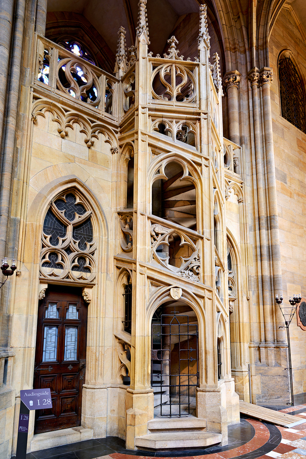 Ornate Gothic spiral staircase and doorway inside Prague Castle Czech Republic. Visitors can explore this historic architecture with an audioguide.
