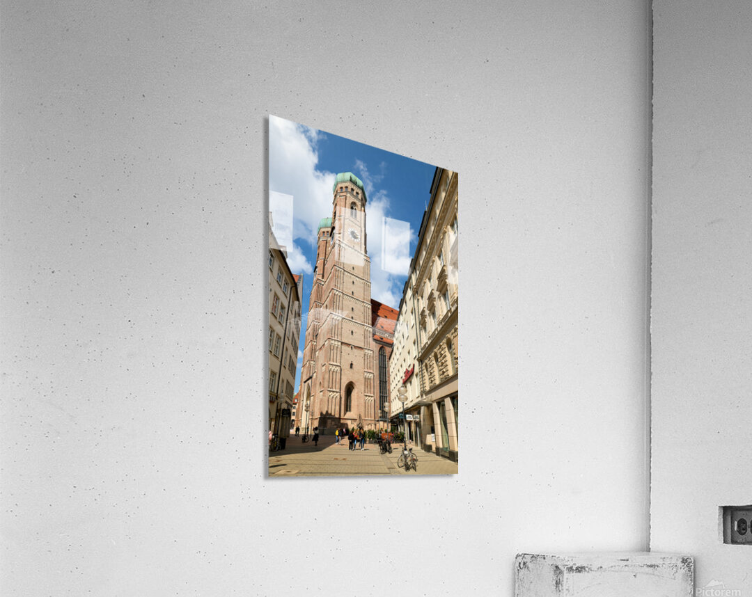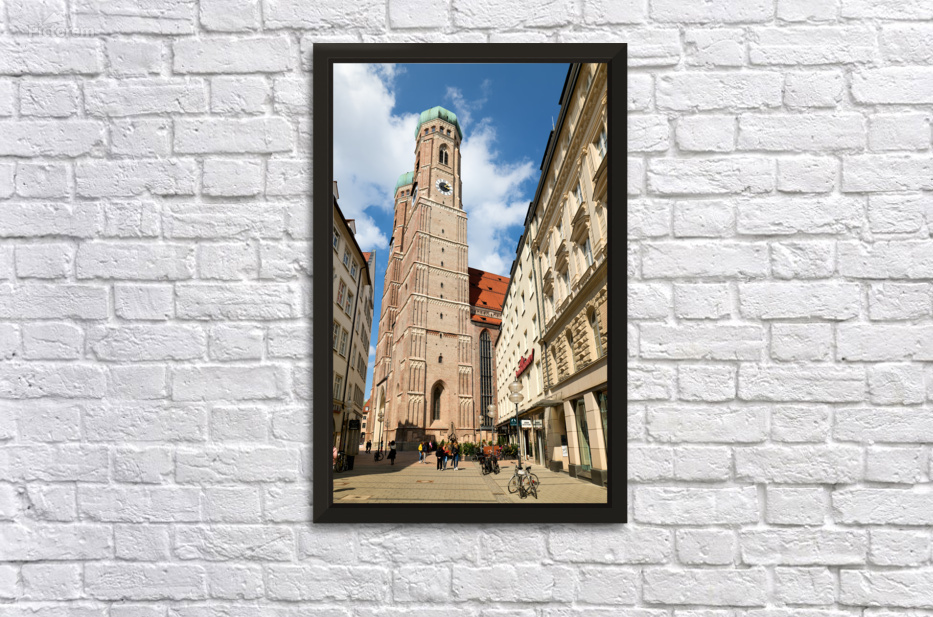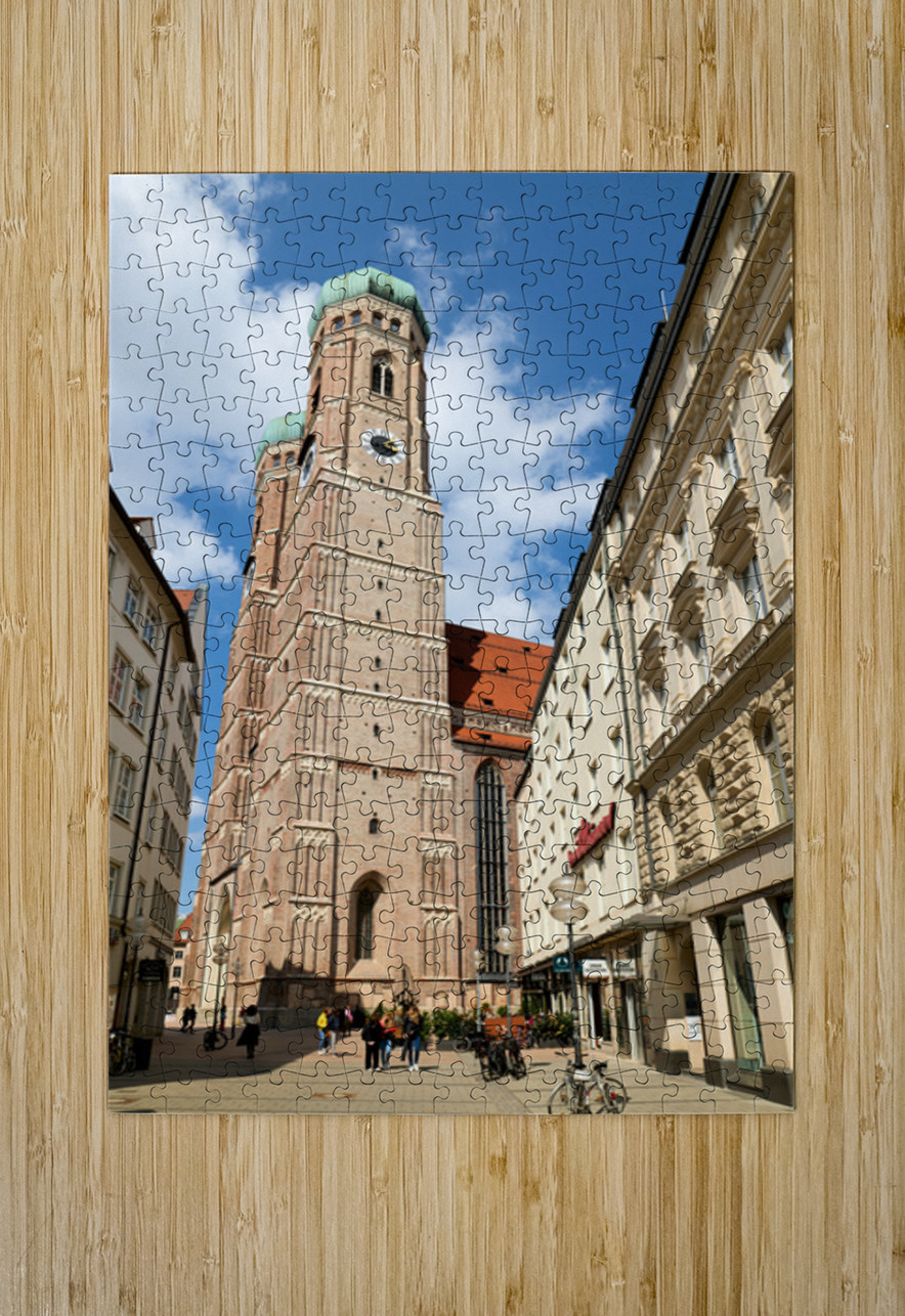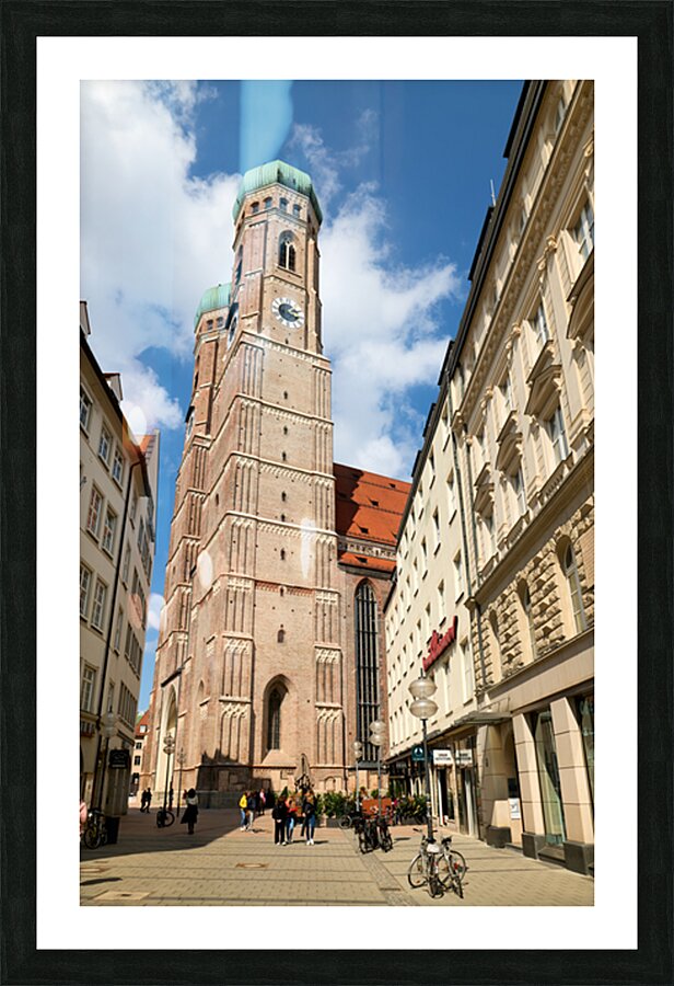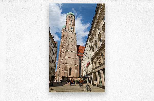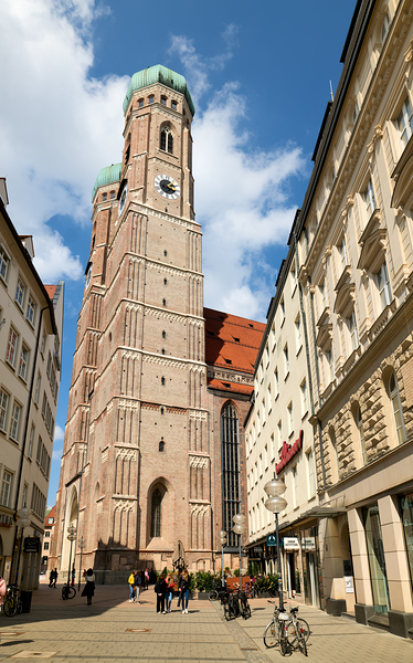 People walk around the Frauenkirche in Munich Germany. The sky is blue and the architecture is tall and historic.