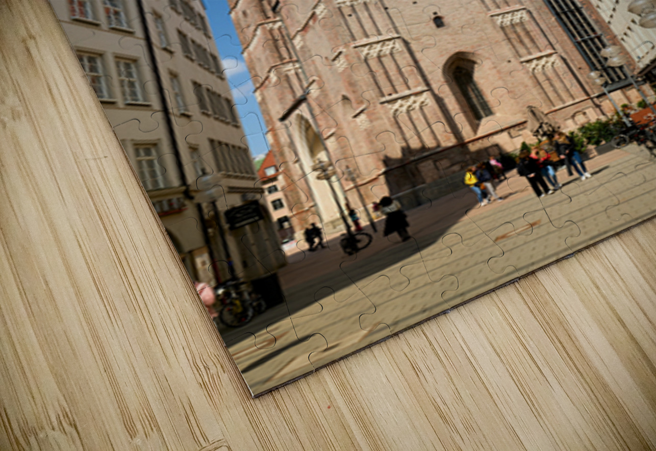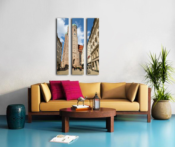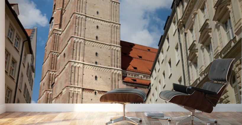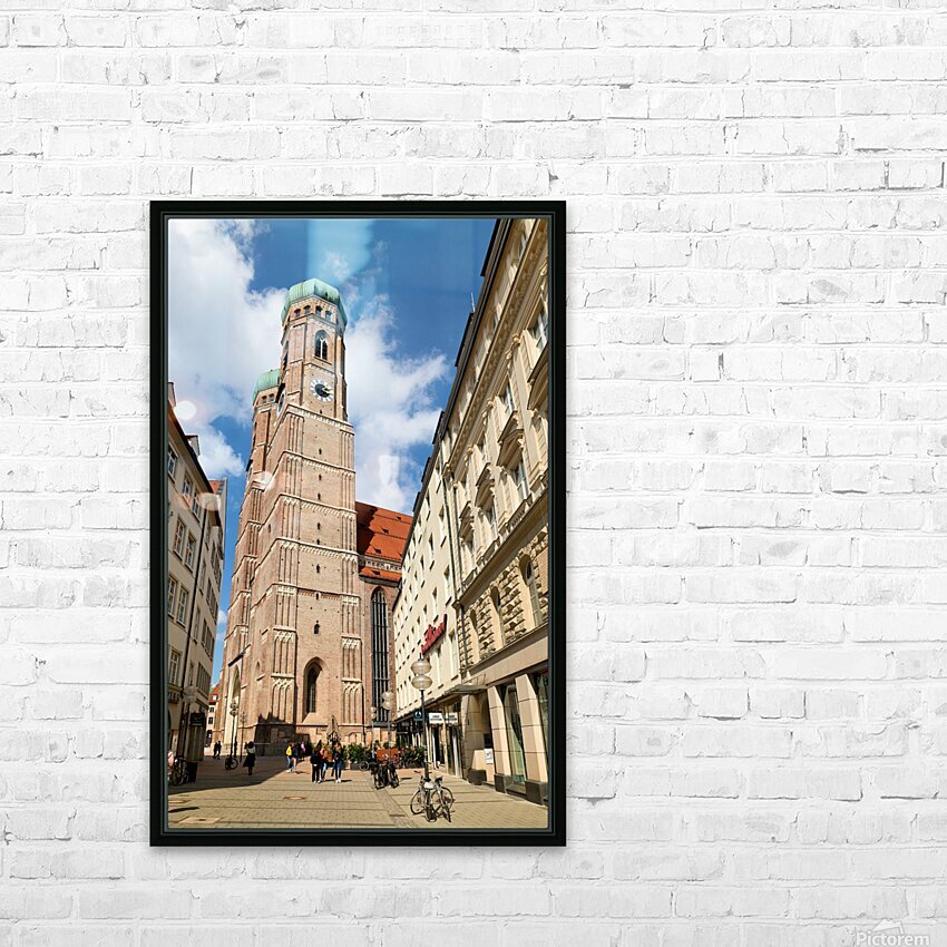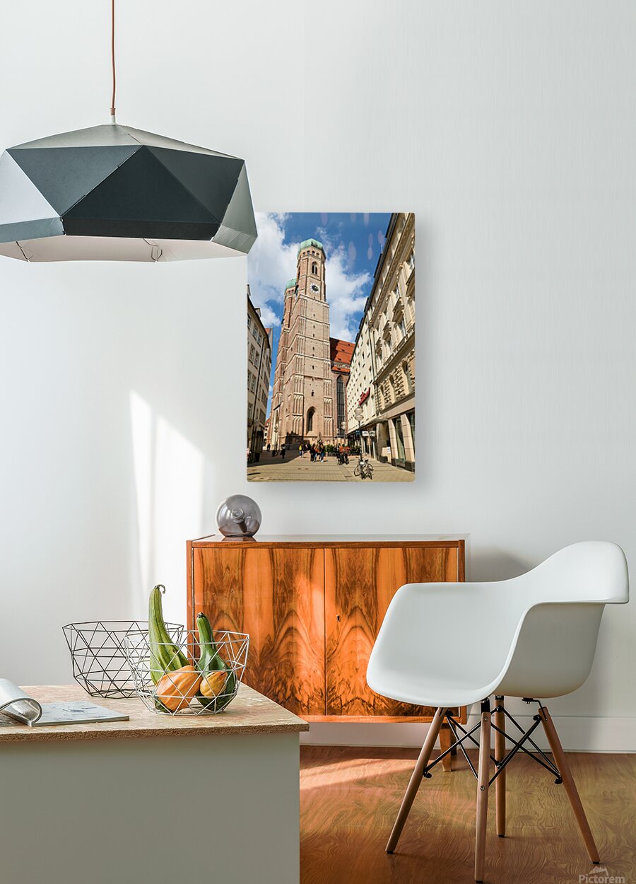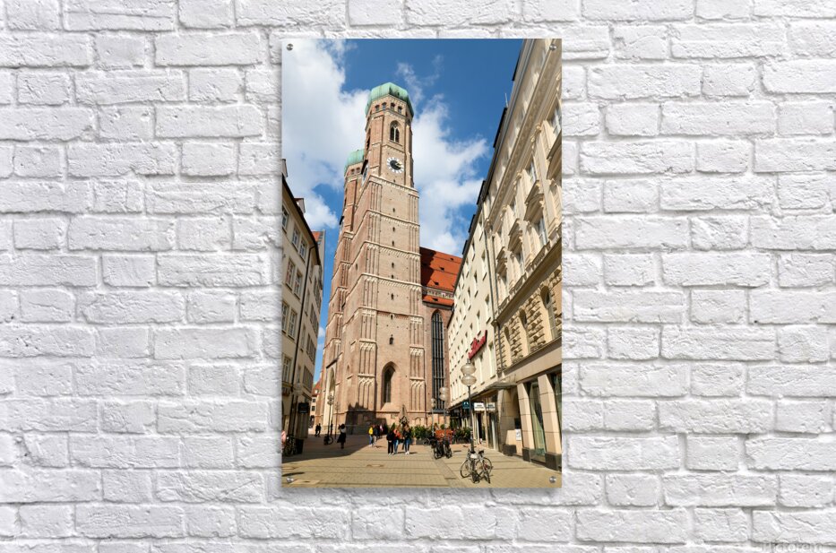 People walk around the Frauenkirche in Munich Germany. The sky is blue and the architecture is tall and historic.