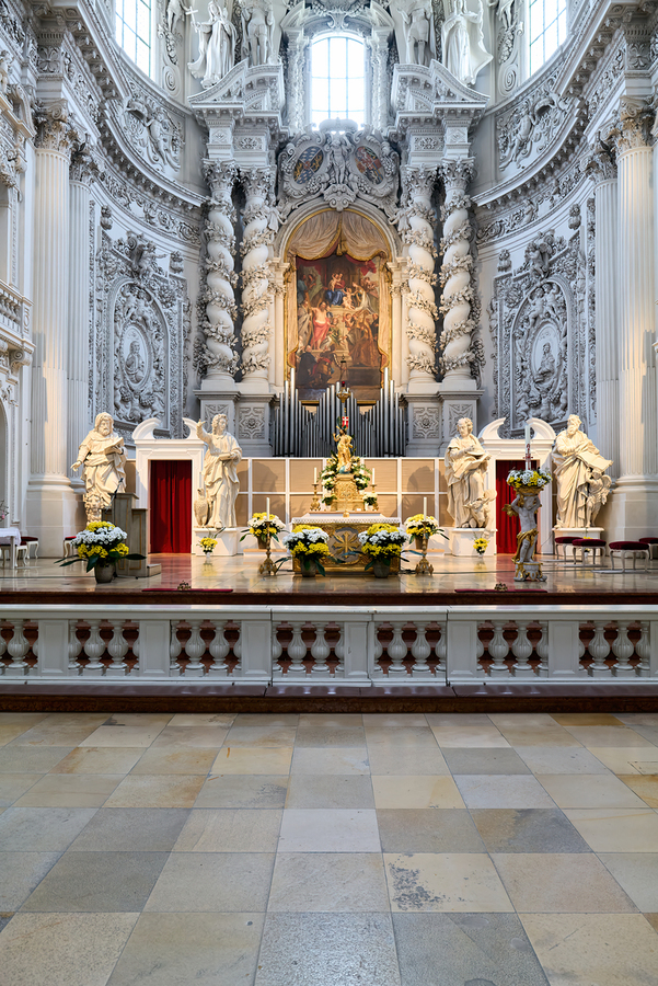 INTERIOR VIEW OF THEATINERKIRCHE IN MUNICH WITH ALTAR AND SCULPT