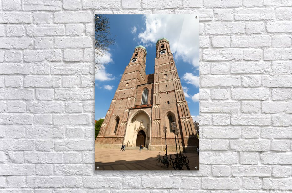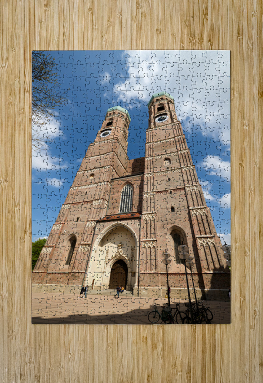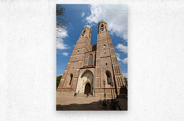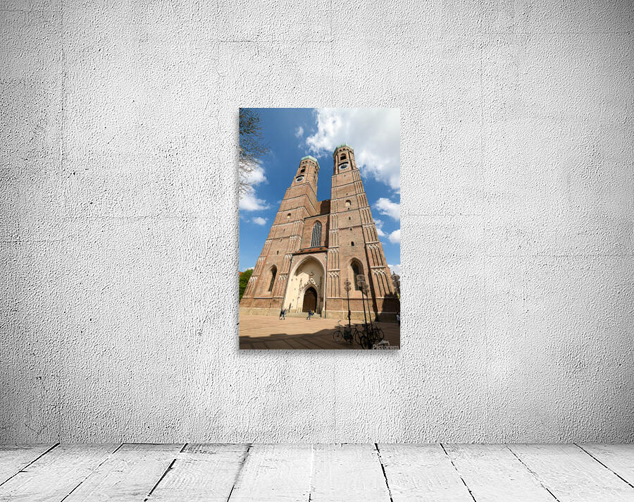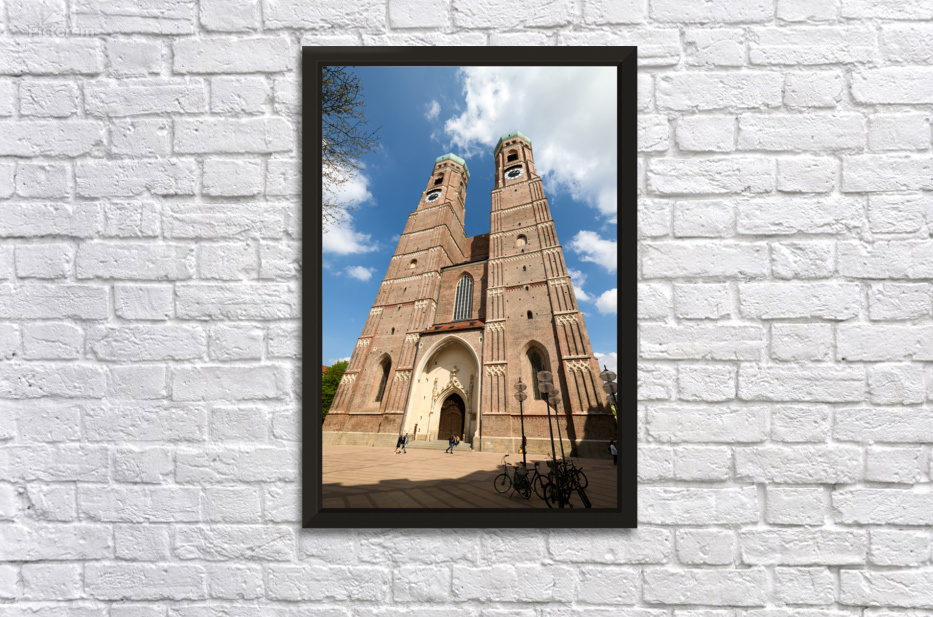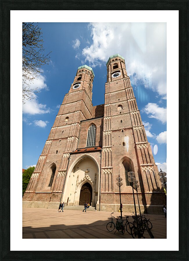 Frauenkirche in Munich shows its tall towers under a bright blue sky. People walk near the entrance while bikes are parked nearby.
