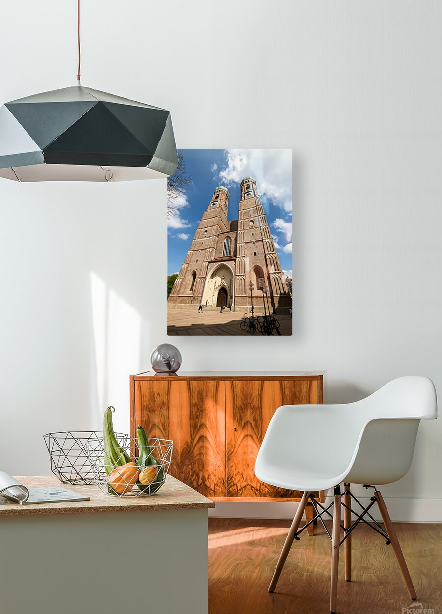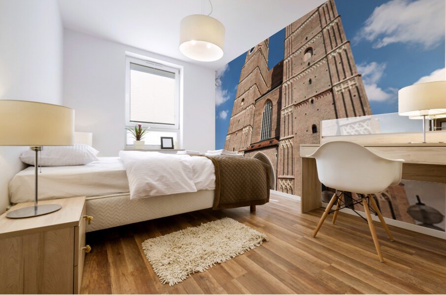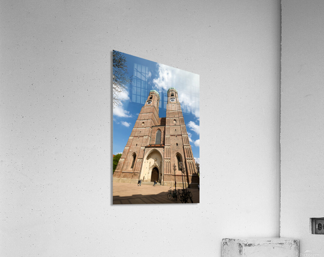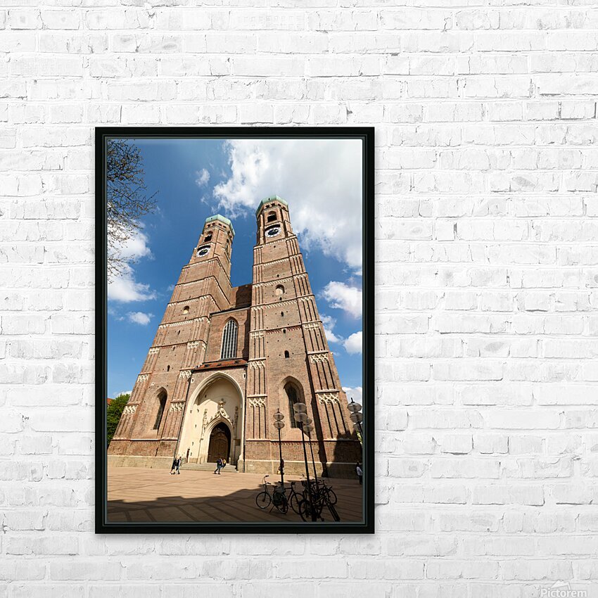 Frauenkirche in Munich shows its tall towers under a bright blue sky. People walk near the entrance while bikes are parked nearby.