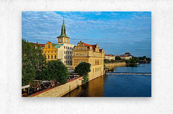 "Pragues Vltava riverfront with historic architecture and lively" in a framed print.