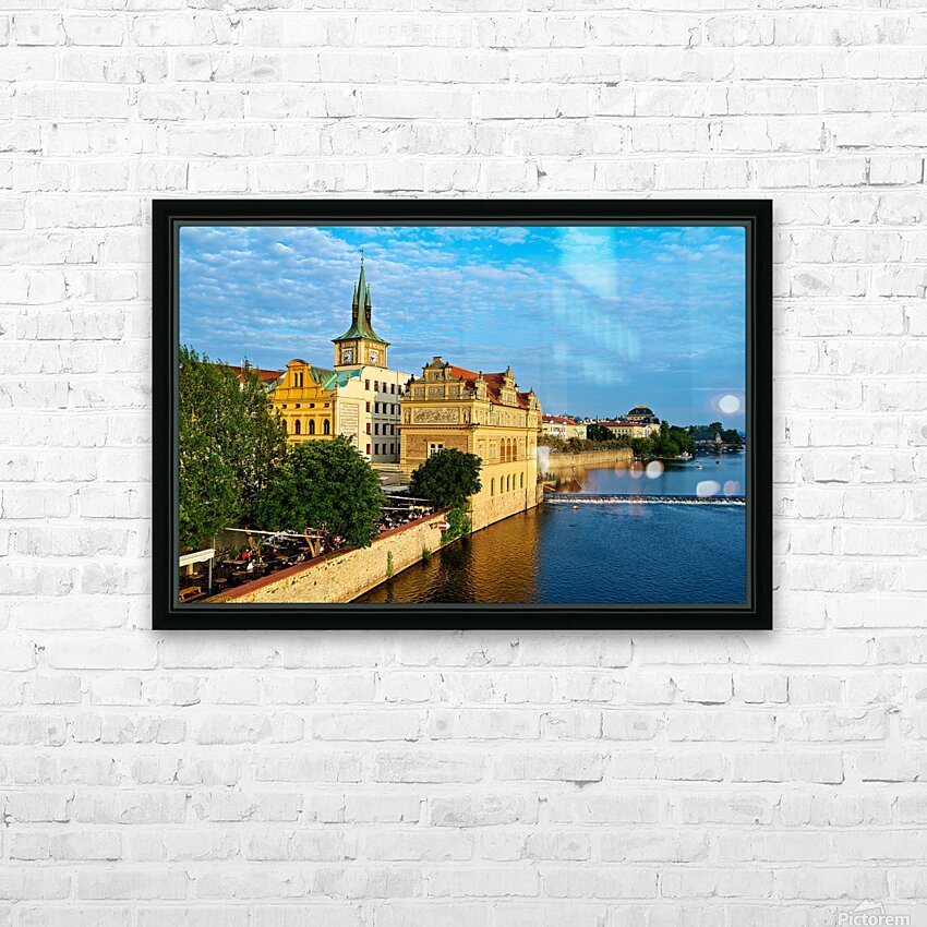 Pragues Vltava riverfront with historic architecture and lively Picture Frame Printing