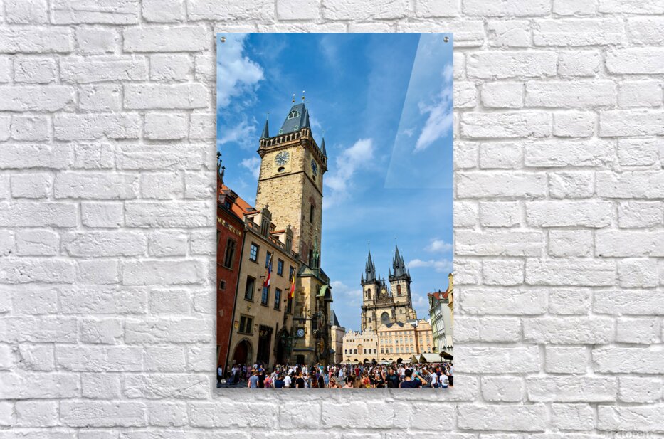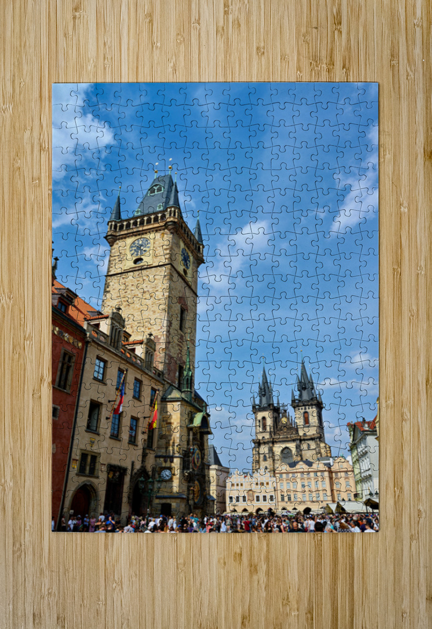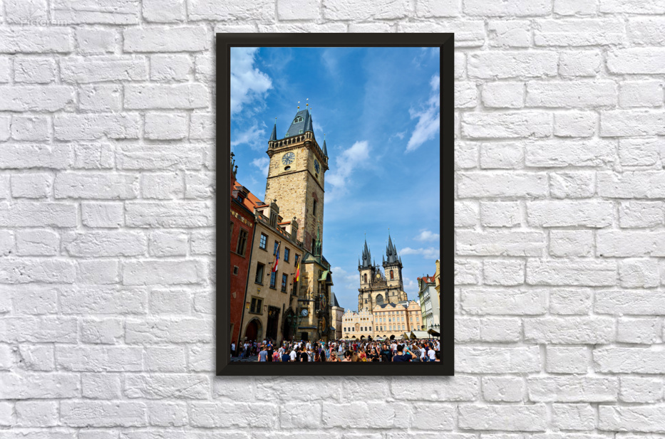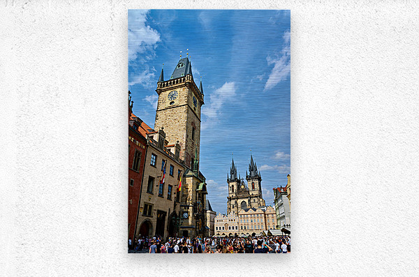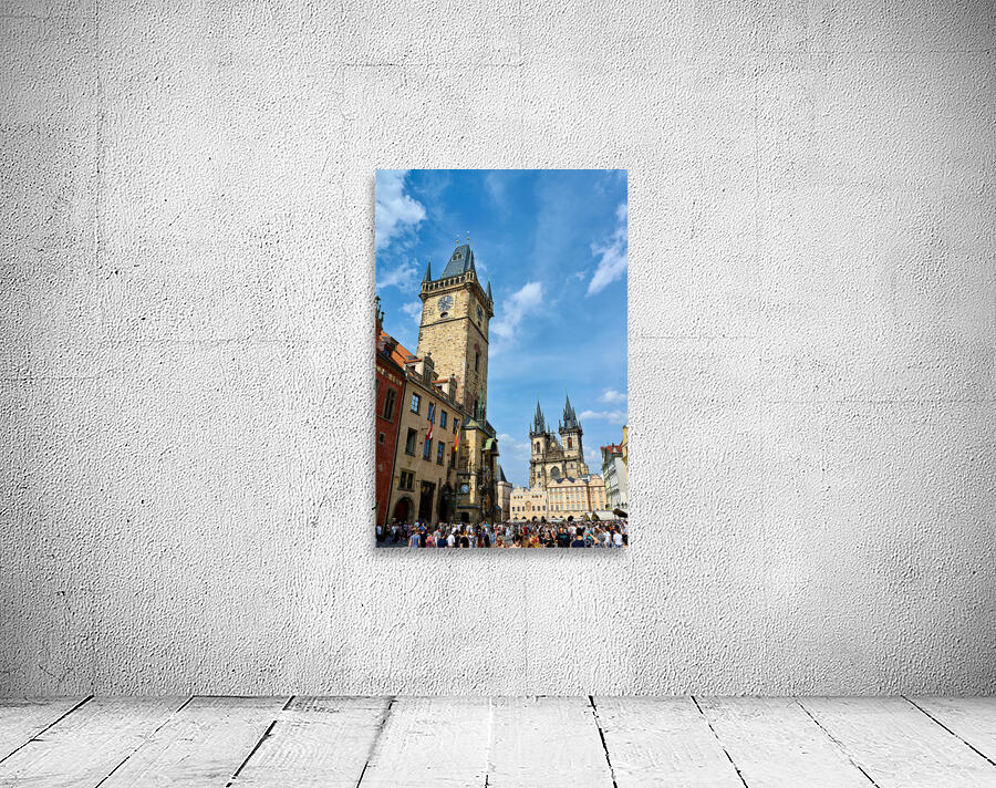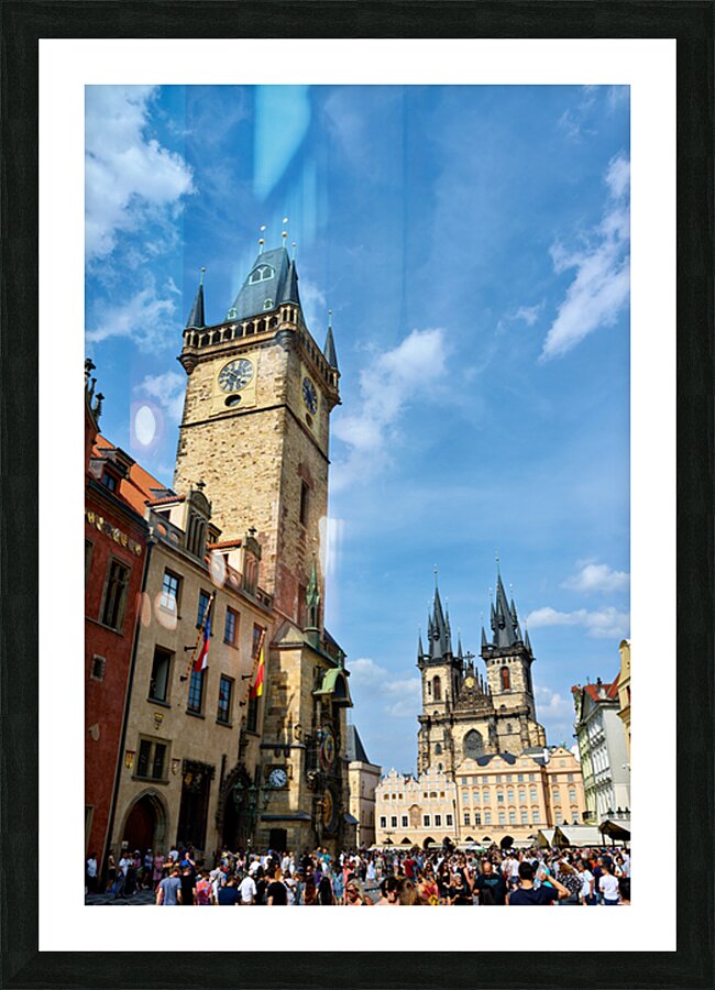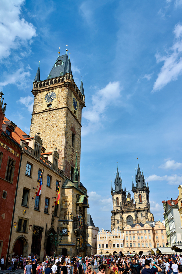 Crowds gather in Pragues Old Town Square Czech Republic admiring the historic Astronomical Clock and the Church of Our Lady before Týn.