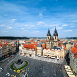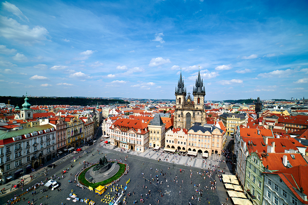 An aerial view of Old Town Square in Prague Czech Republic bustling with tourists admiring the historic architecture including the Church of Our Lady