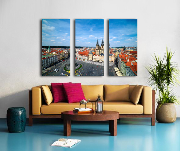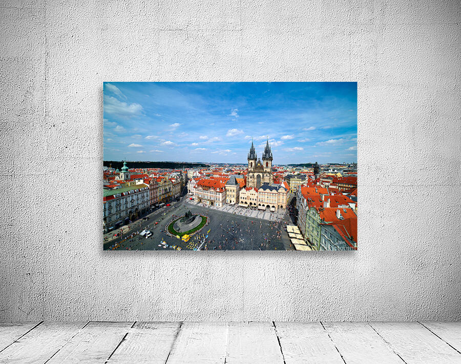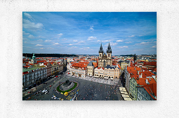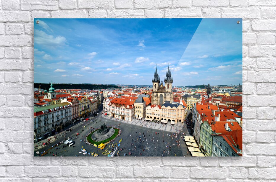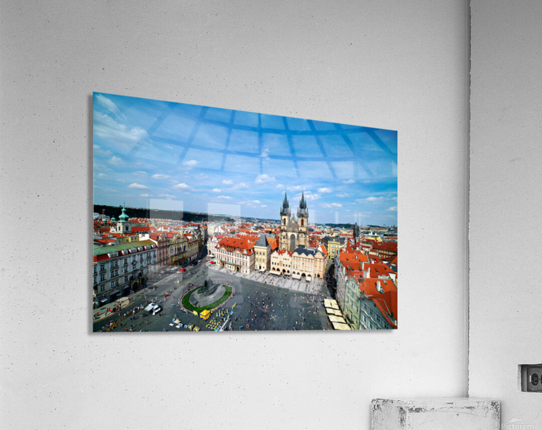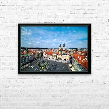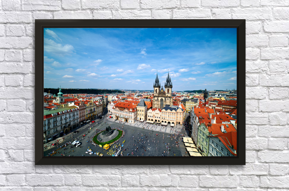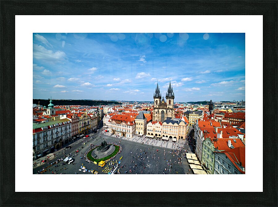 "Aerial view of bustling Prague Old Town Square and Týn Church." in a framed print.