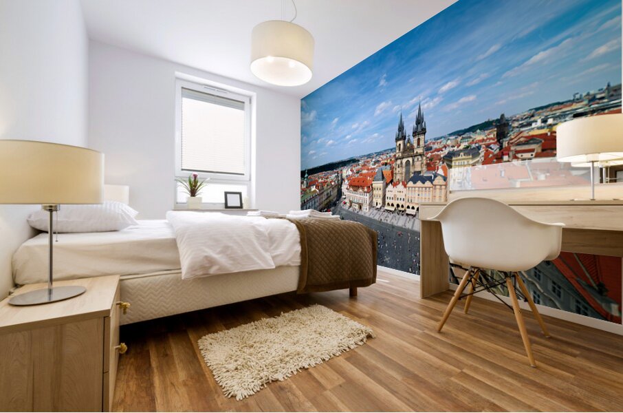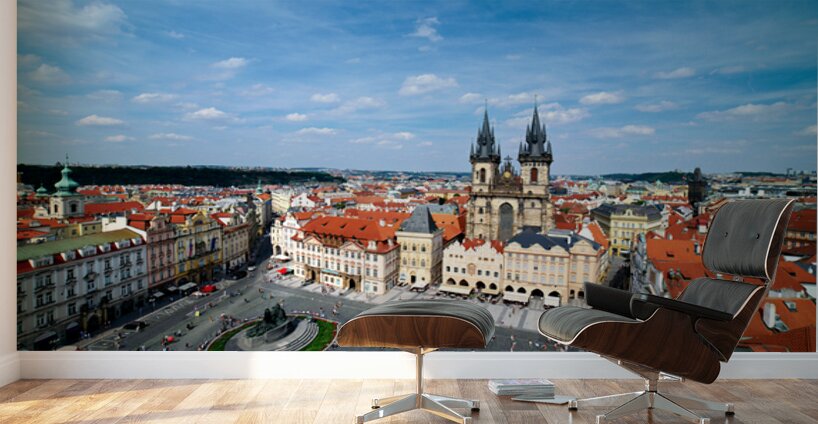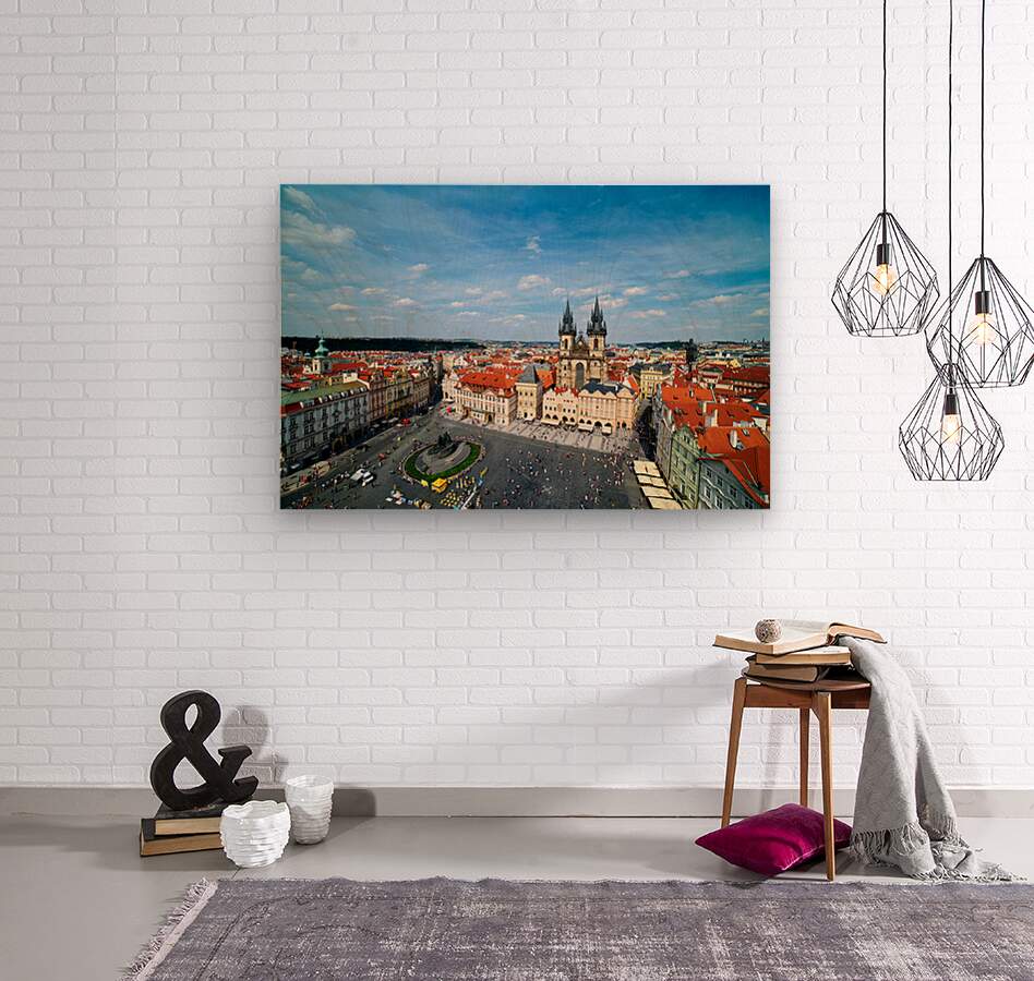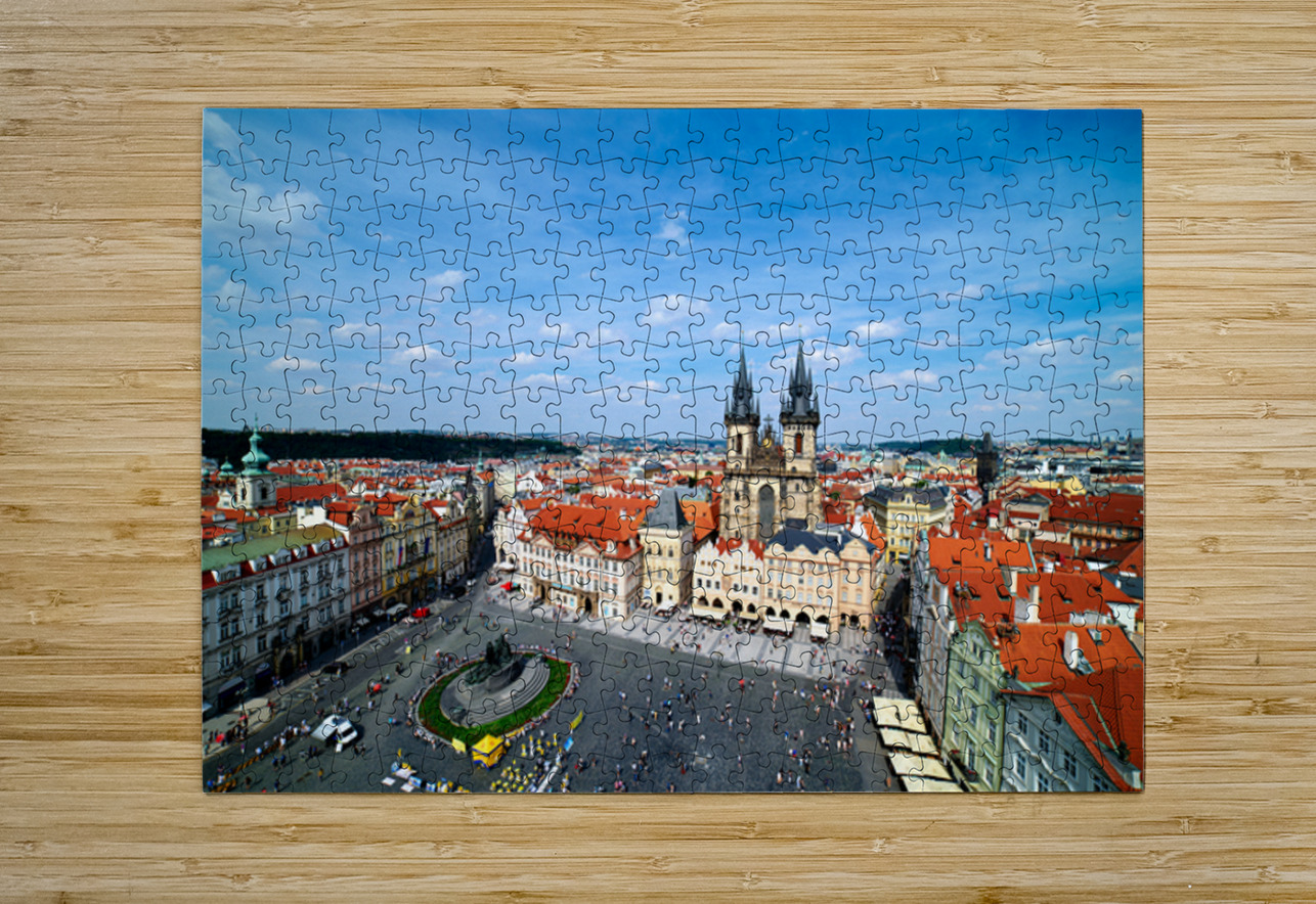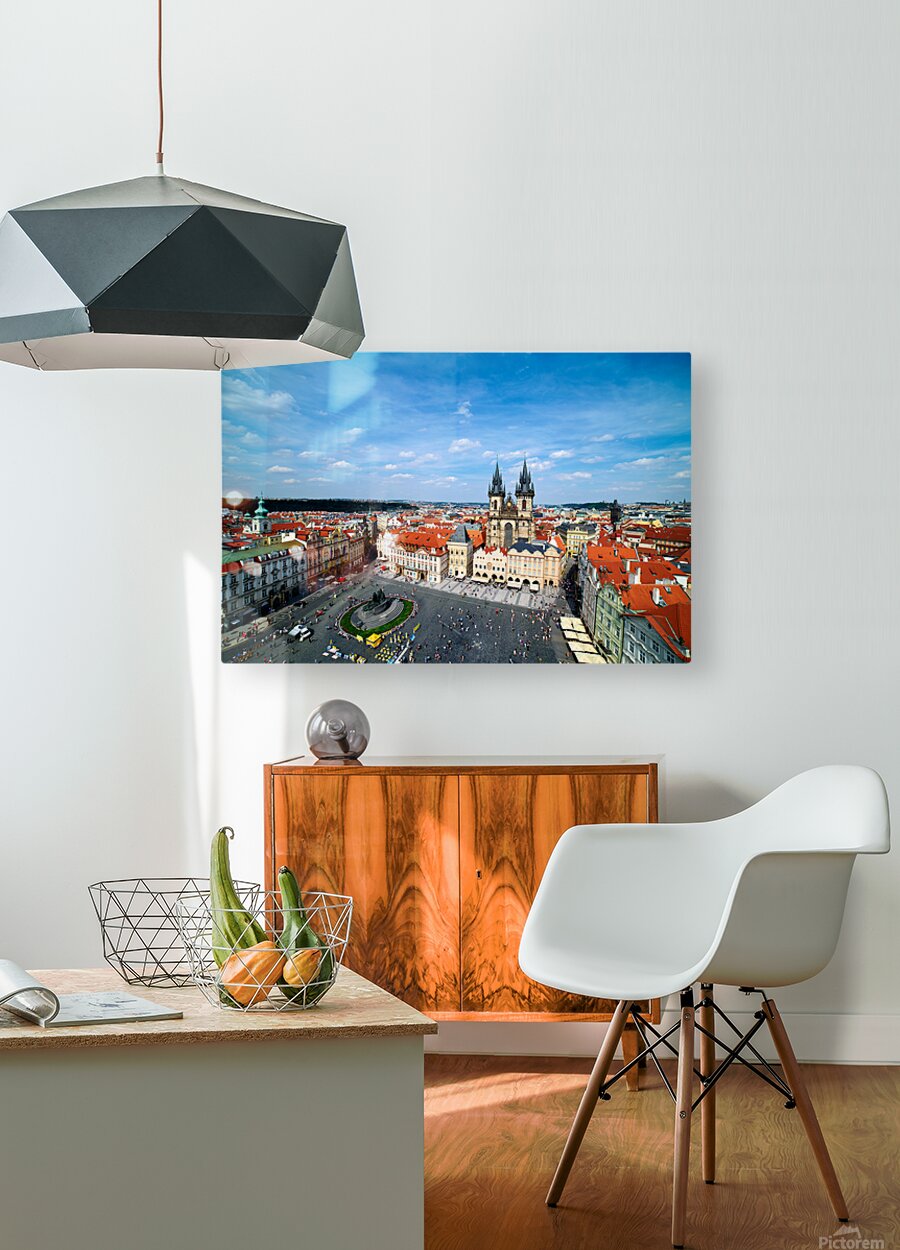 "Aerial view of bustling Prague Old Town Square and Týn Church." in a framed print.