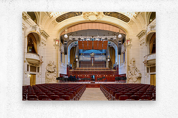 ABOUT THIS ARTWORK: GRAND CONCERT HALL WITH ORGAN AND EMPTY SEATS.