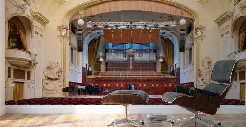 Smetana Hall Municipal House Prague Czech Republic. An ornate concert hall with an organ and empty seats ready for a performance.