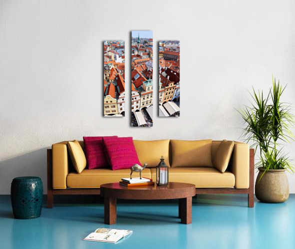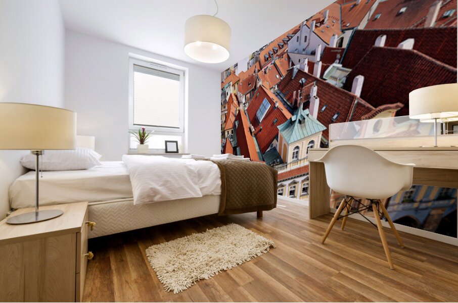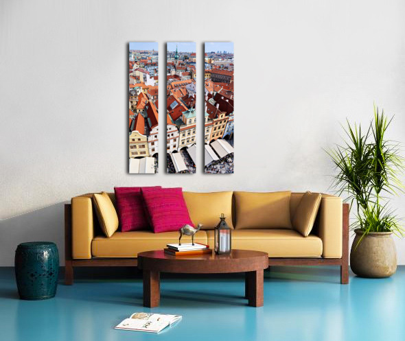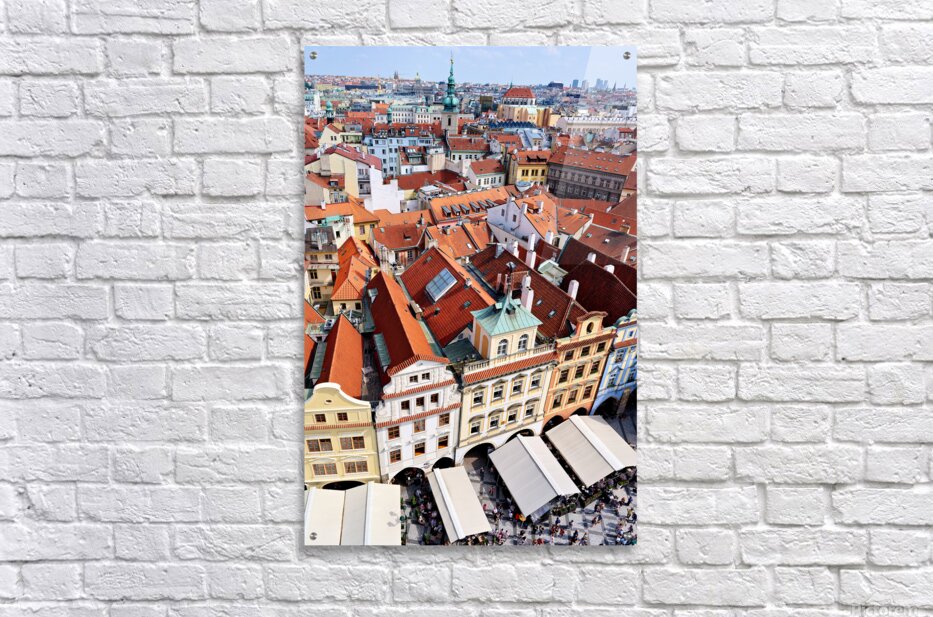 ABOUT THIS ARTWORK: AERIAL VIEW OF PRAGUES HISTORIC RED ROOFED CITYSCAPE AND BUSTLI