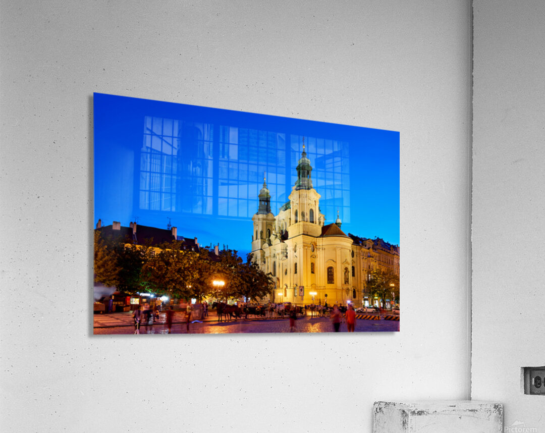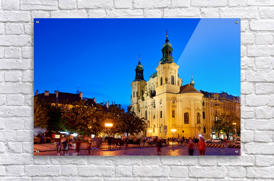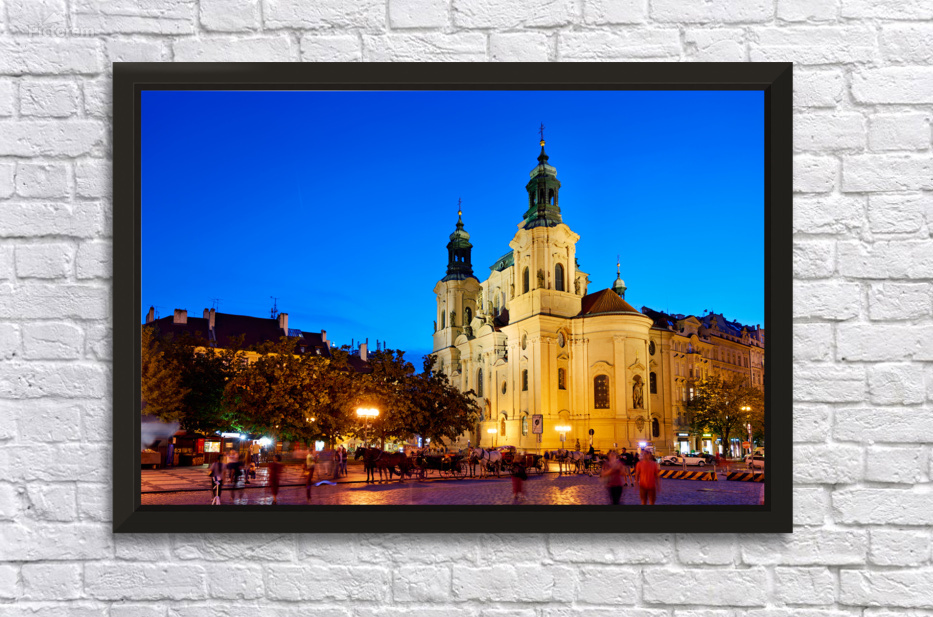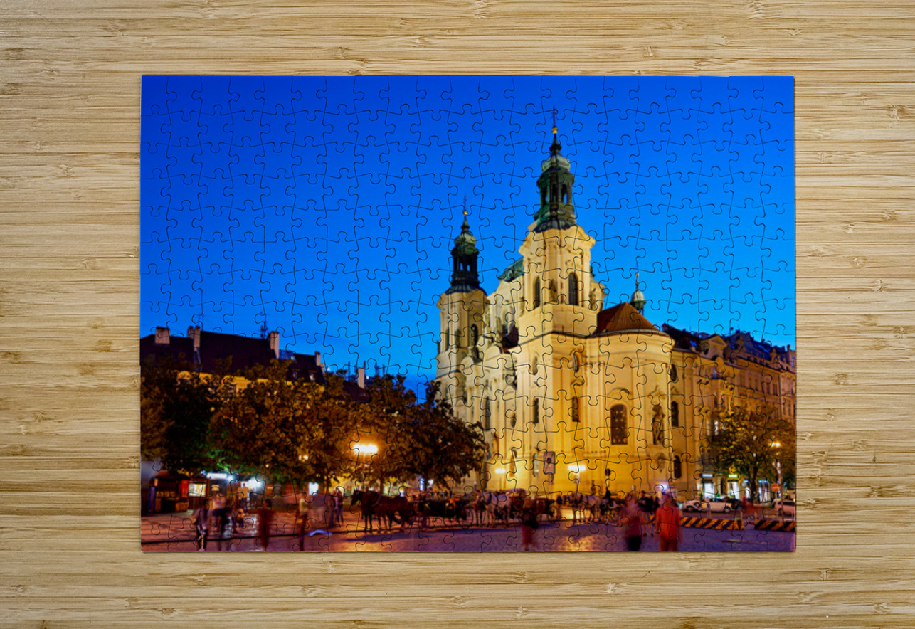 Tourists and locals enjoy an evening in Pragues Old Town Square with horse-drawn carriages and the illuminated St. Nicholas Church.