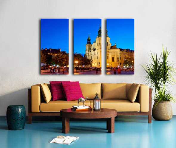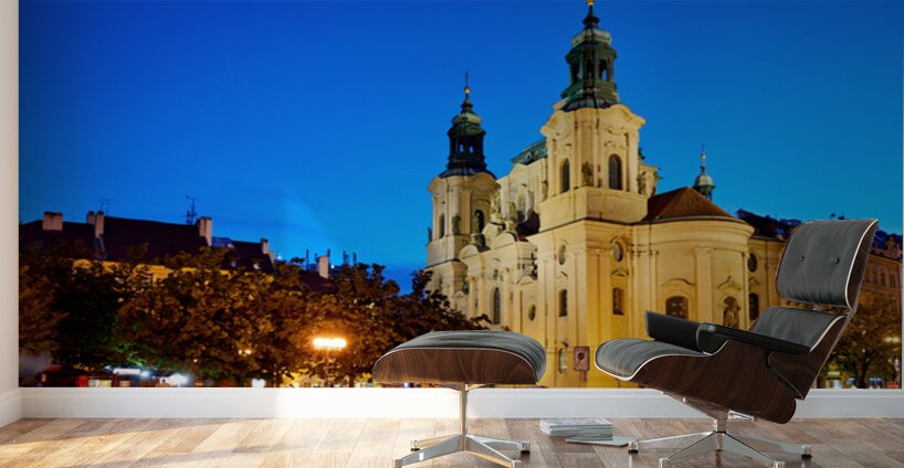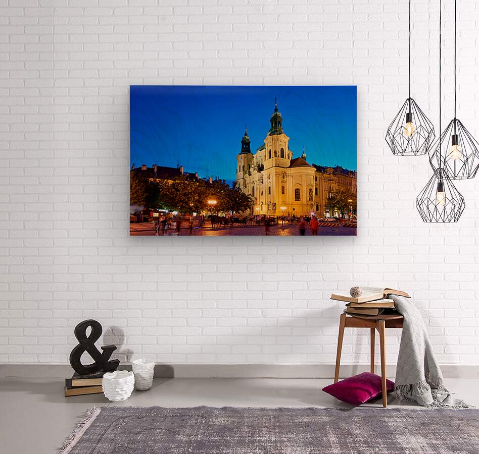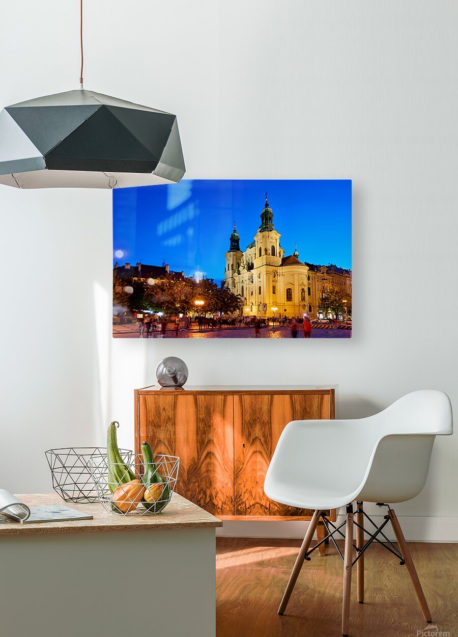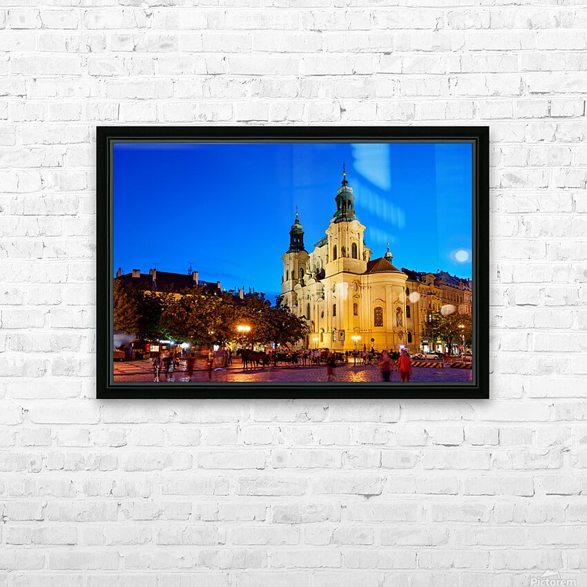 Tourists and locals enjoy an evening in Pragues Old Town Square with horse-drawn carriages and the illuminated St. Nicholas Church.