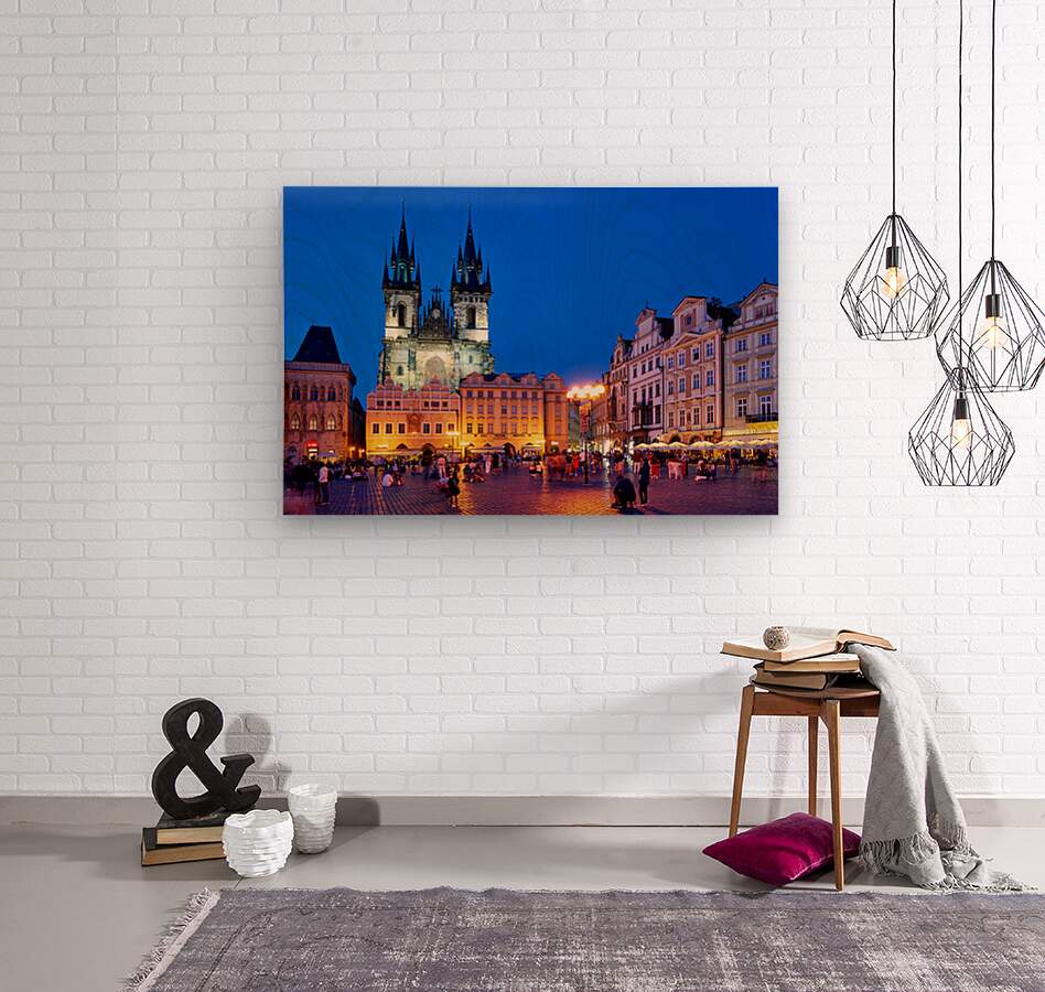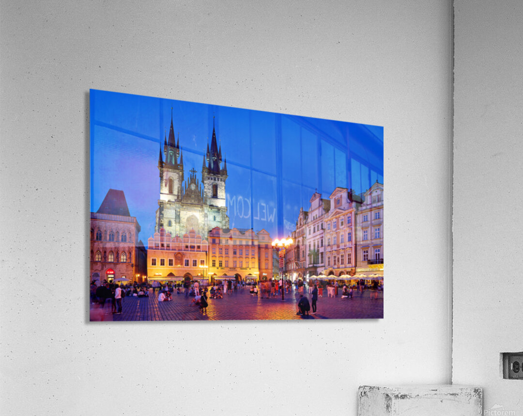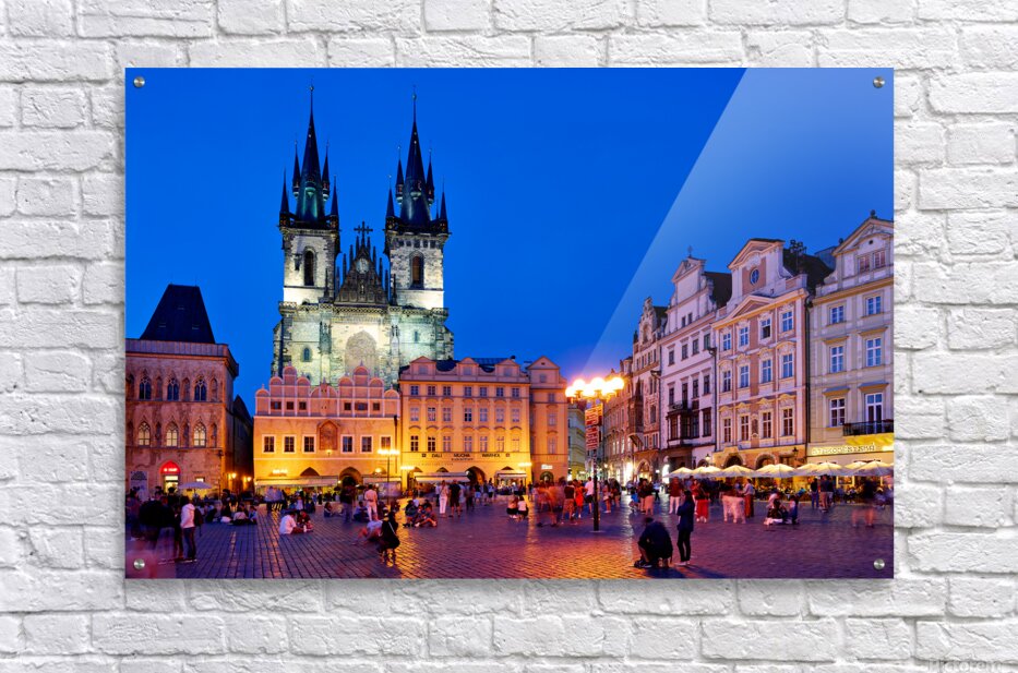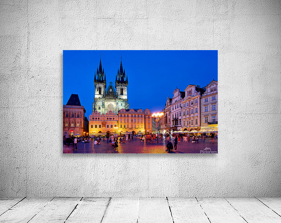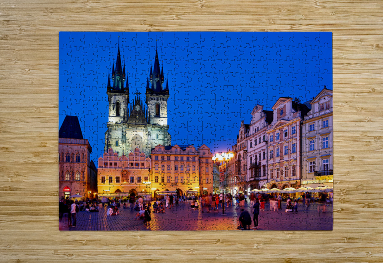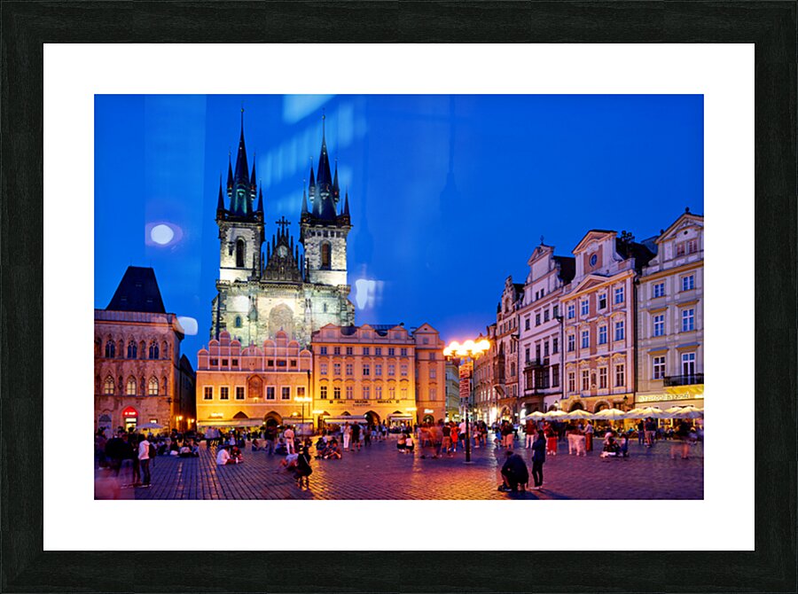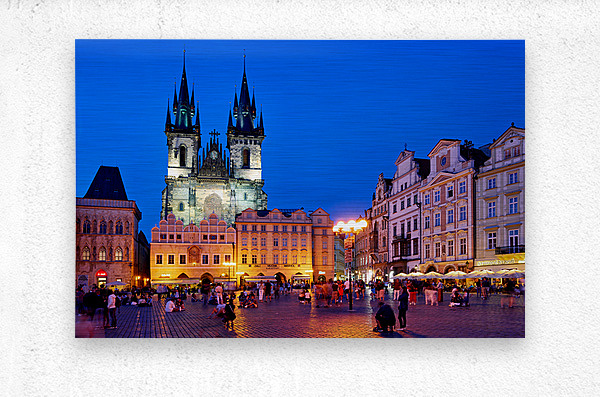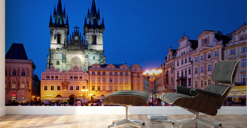 Tourists and locals gather in Pragues Old Town Square at dusk enjoying the illuminated Church of Our Lady before Týn and vibrant atmosphere.