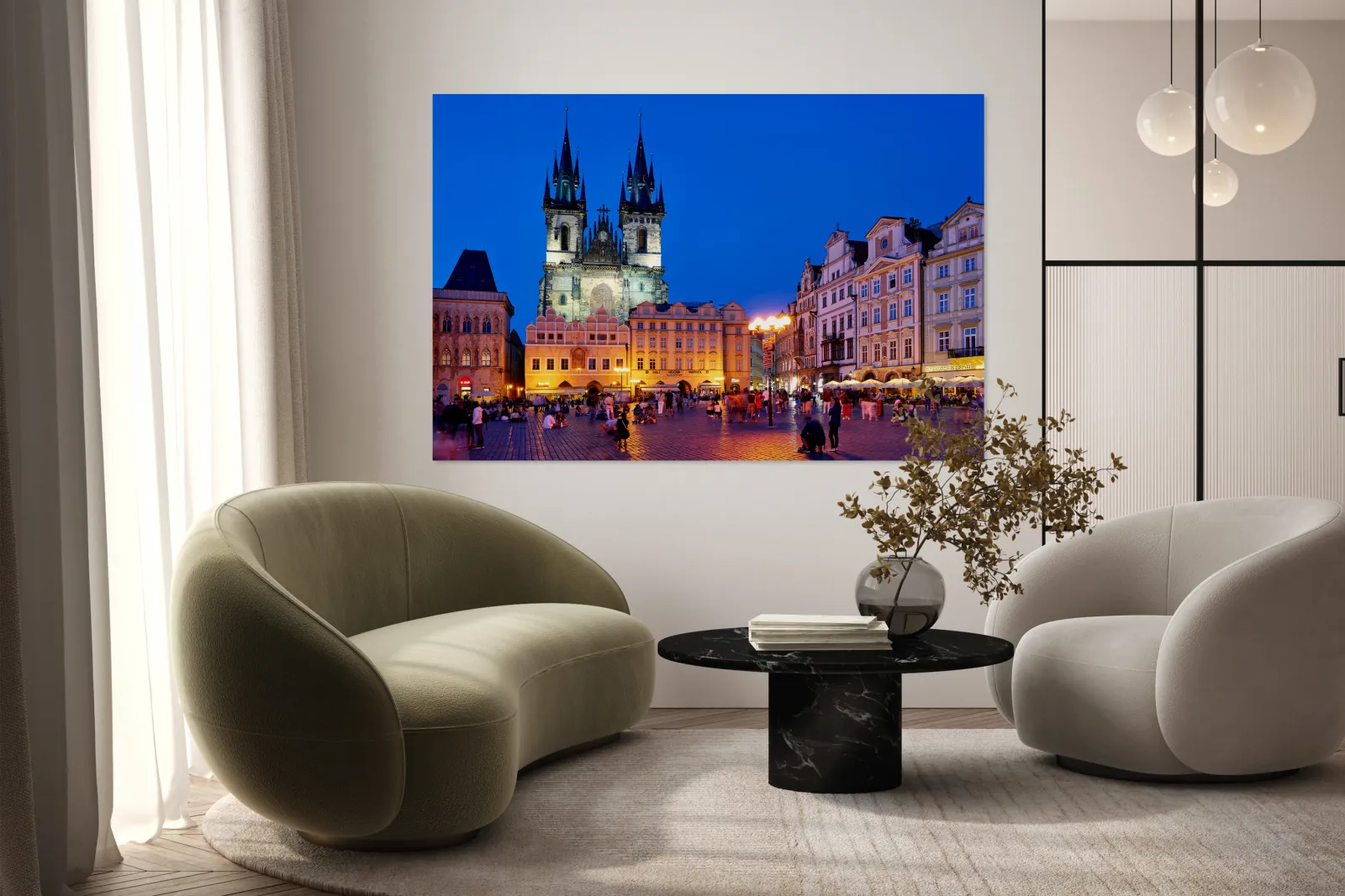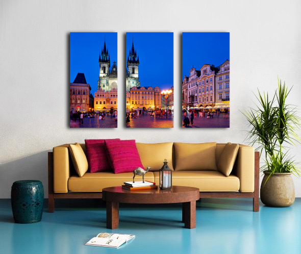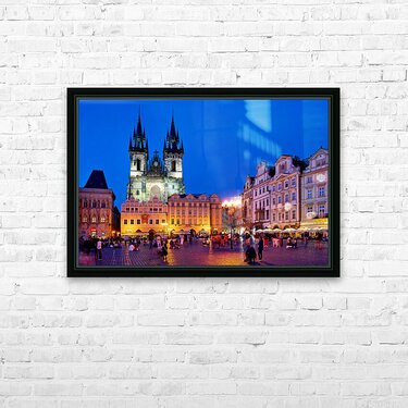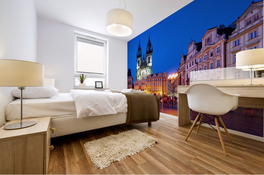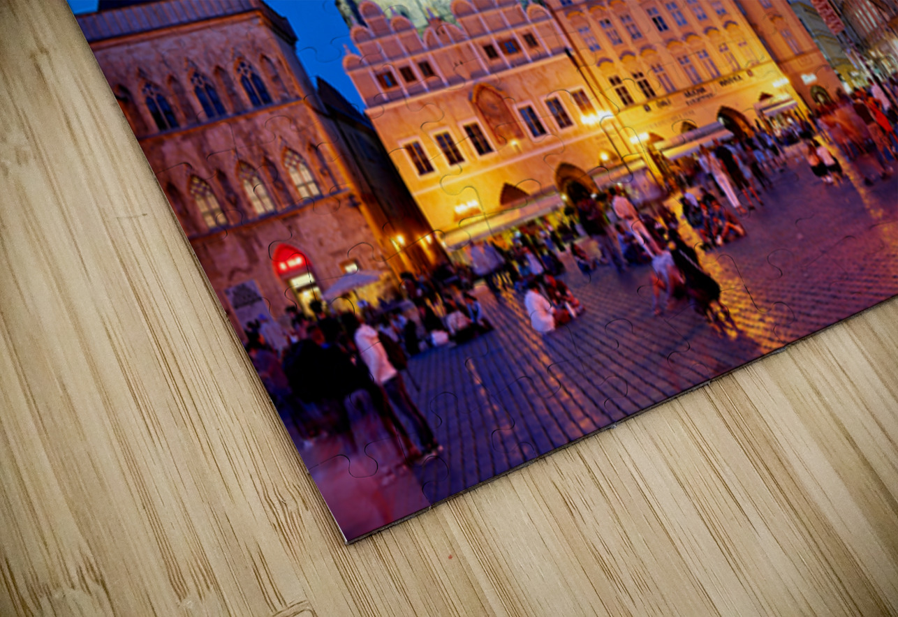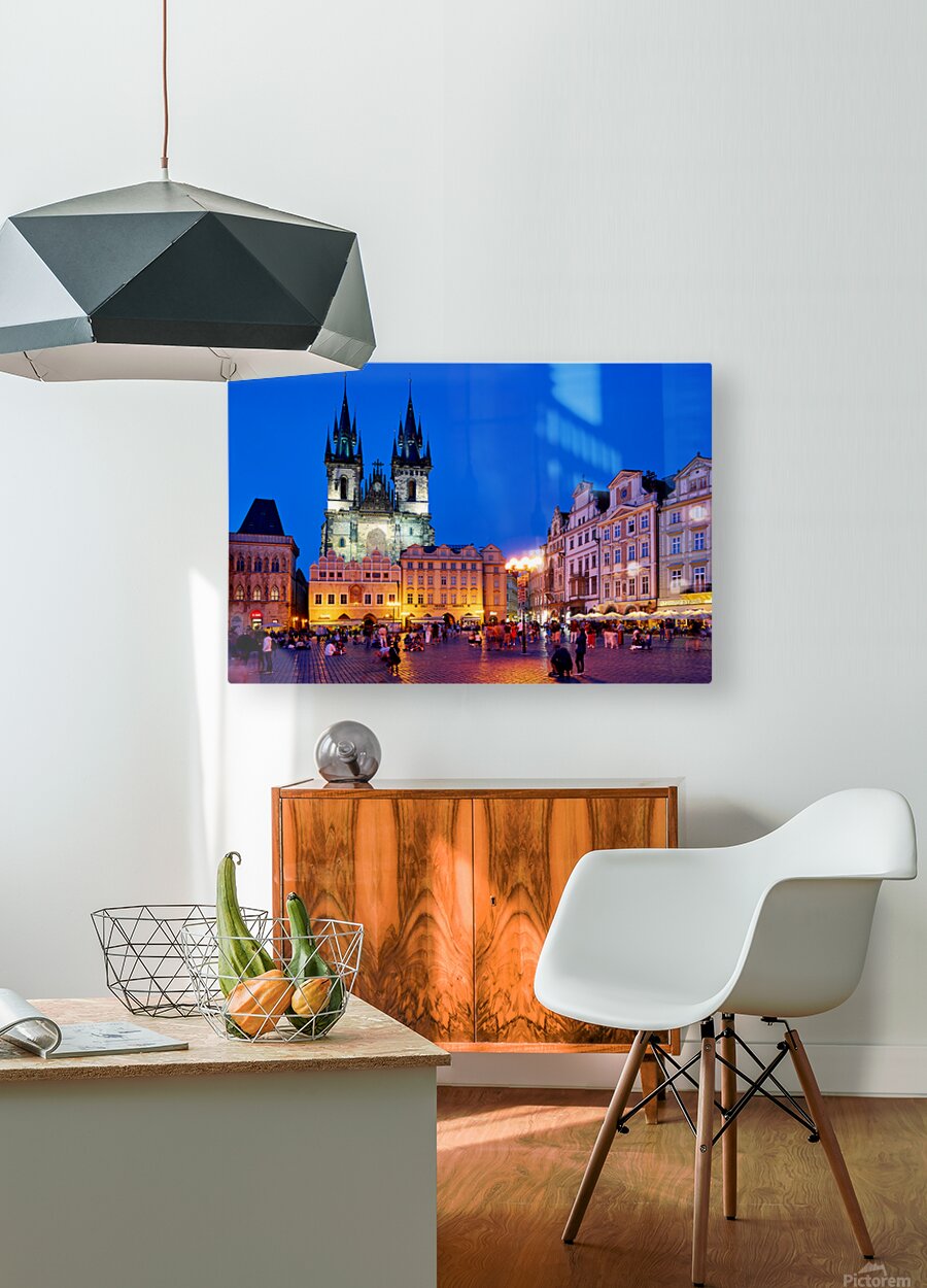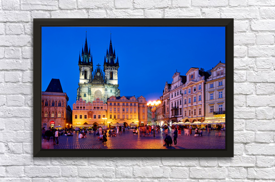 Tourists and locals gather in Pragues Old Town Square at dusk enjoying the illuminated Church of Our Lady before Týn and vibrant atmosphere.