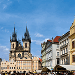 Tourists and locals gather in Pragues Old Town Square enjoying the historic architecture including the Church of Our Lady before Týn on a sunny day.